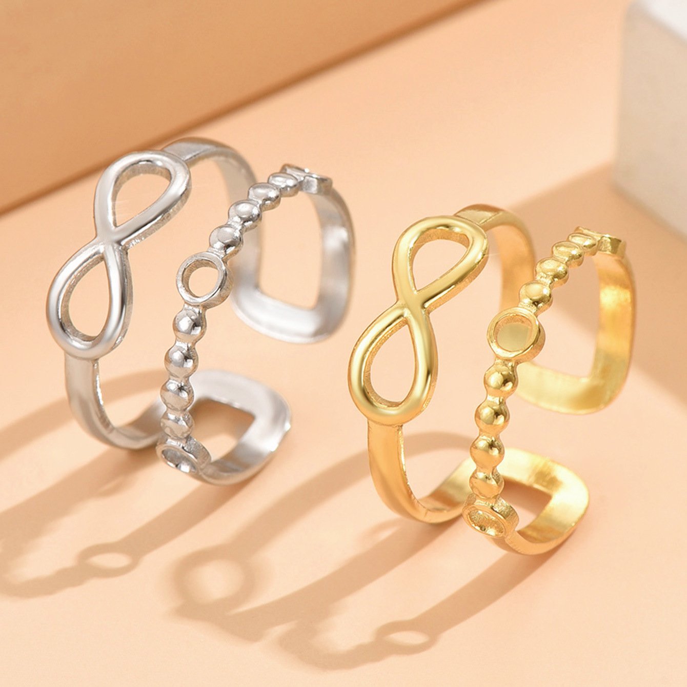 Dual Layer Open Band Infinity Bow Ring in 18k gold/silver titanium steel. Dual-layer open band with beaded chain detail, tarnish-free symbol jewelry.