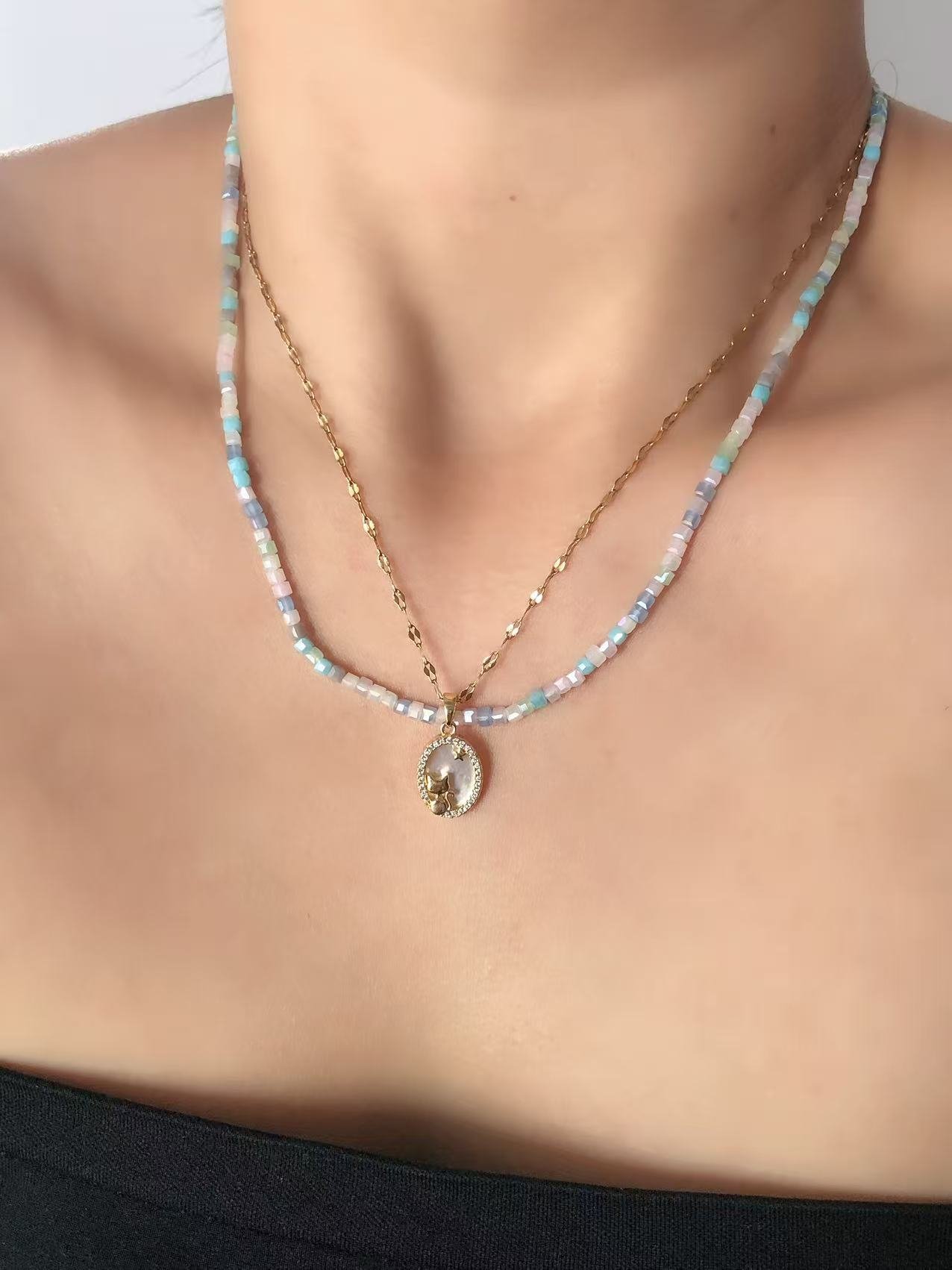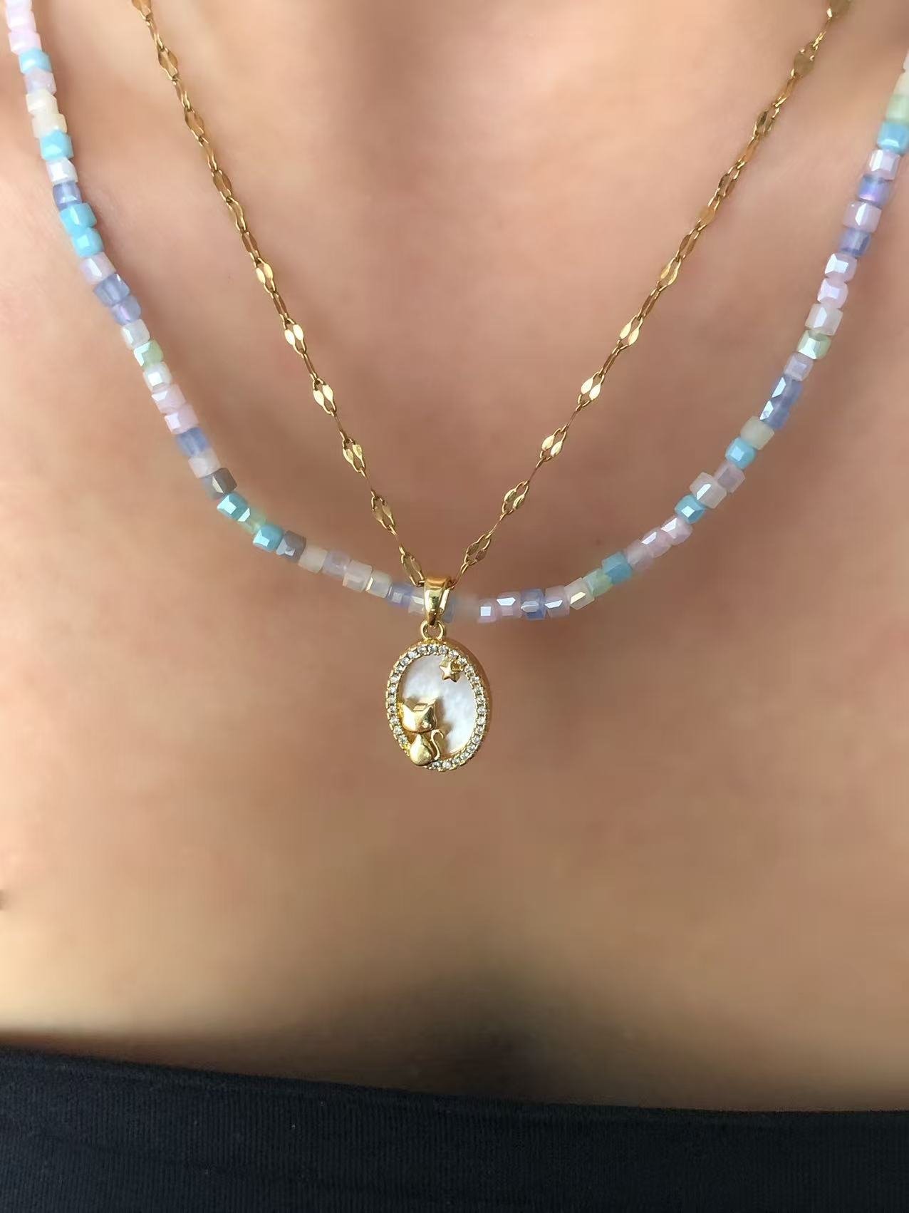 1 review for 18K Gold CZ Rainbow Beads Cat & Star Layered Necklace