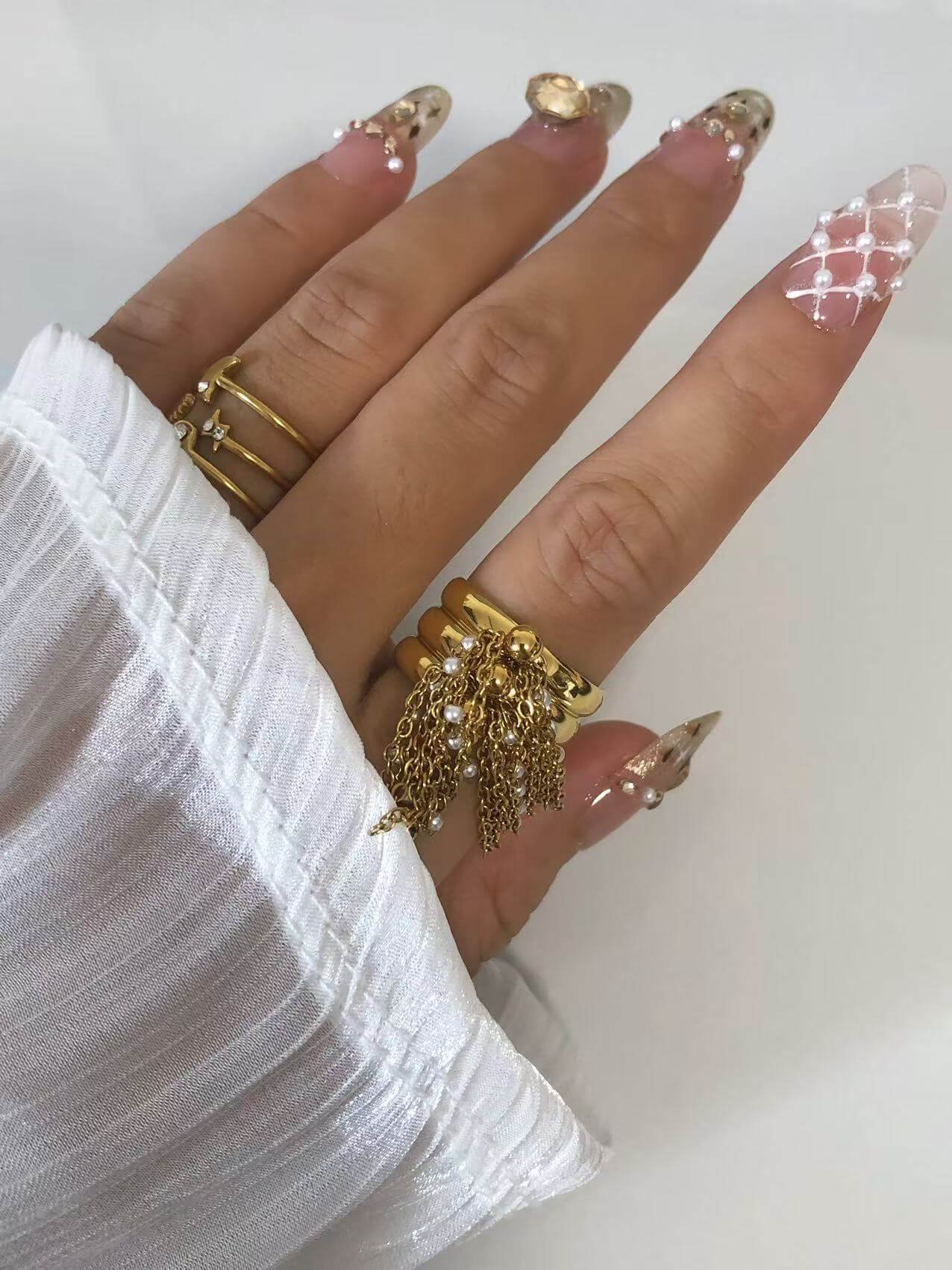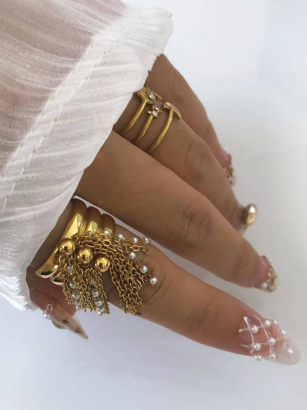 Bold 18K gold open ring with cascading pearl chains. Tarnish-free titanium steel. Statement luxury jewelry. Adjustable fit. Shop now!
