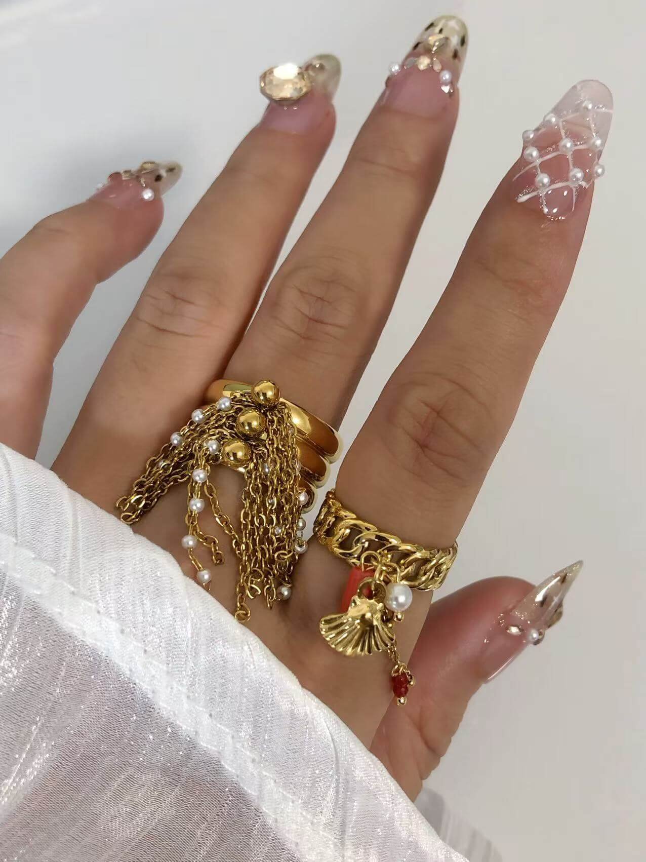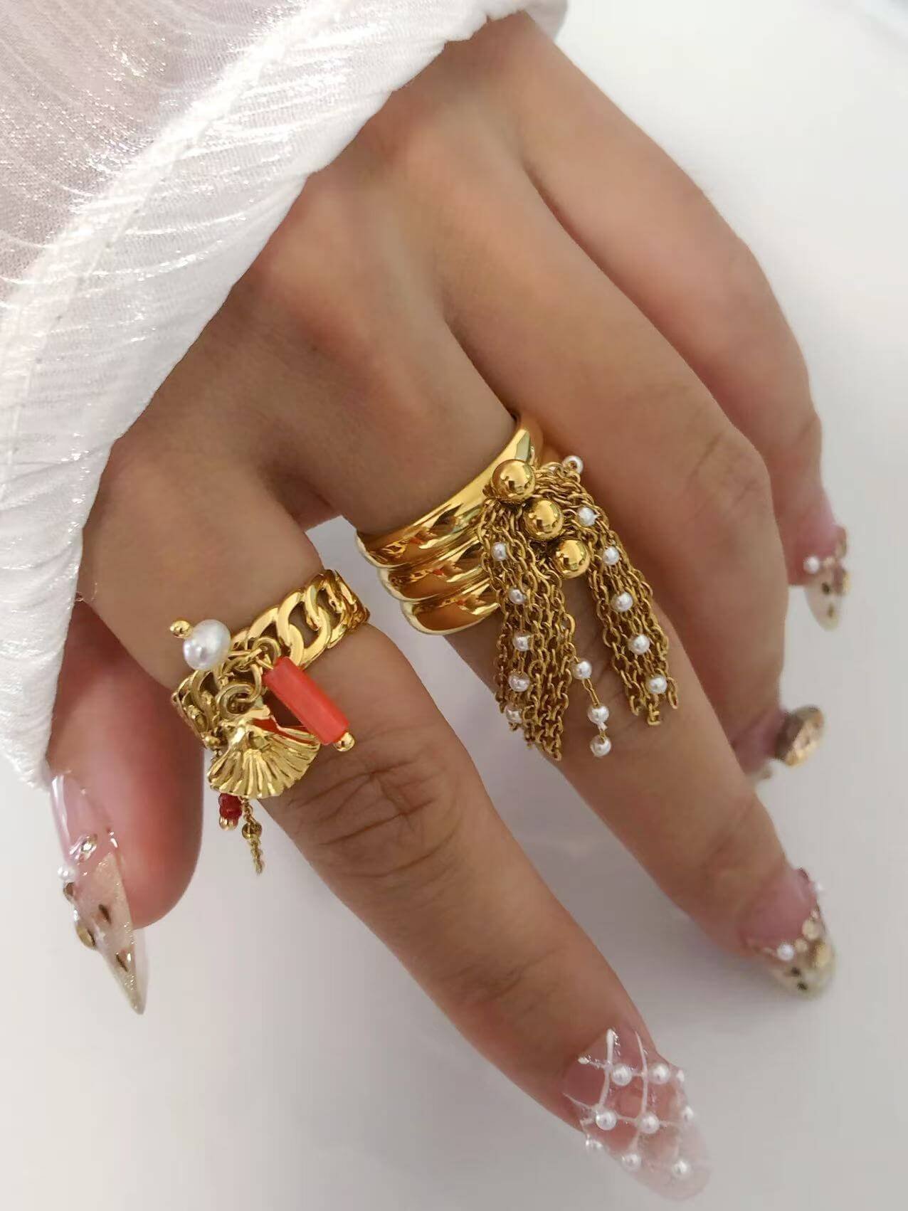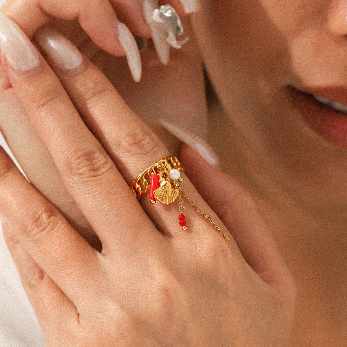 Ocean charm cascade ring with 18K gold shell & pearls. Tarnish-free titanium steel. Beach-inspired luxury jewelry. Adjustable fit!