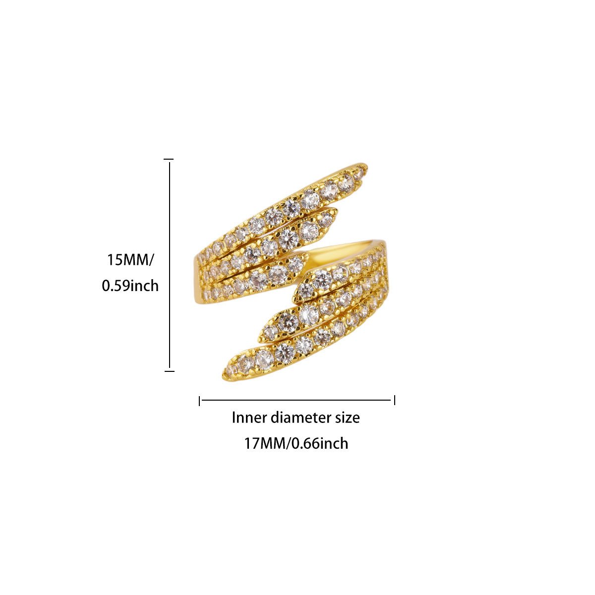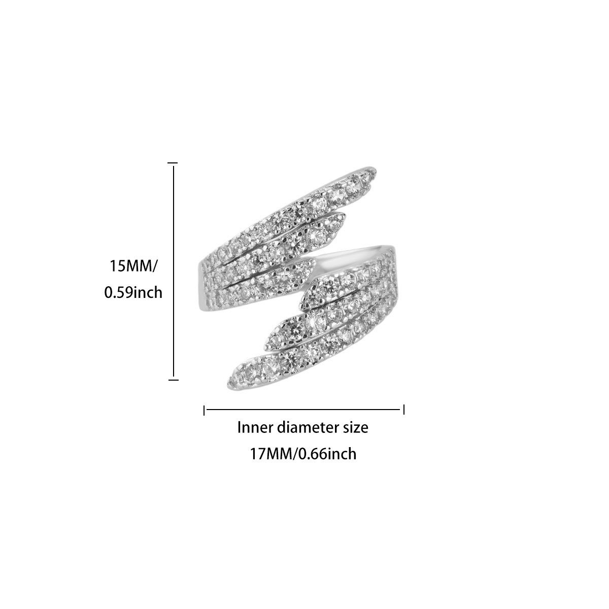 💎 Every Feather. Every Flash. Look at this ring and you’ll see pure poetry in metal and stone. Four sweeping feather-shaped blades fan outward in a dynamic wrap formation — two arching upward, two reaching downward — each one densely encrusted with multiple rows of round pavé zircon stones from tip to base. The pointed feather tips taper to elegant, razor-fine ends that frame the finger with an almost otherworldly grace. The stones are set so densely and seamlessly that the entire surface blazes as one continuous sheet of white sparkle — like wings made entirely of diamonds, wrapped gently around your hand. At 15mm tall with a generous inner diameter of 17mm, it sits with commanding presence while remaining surprisingly wearable and comfortable.