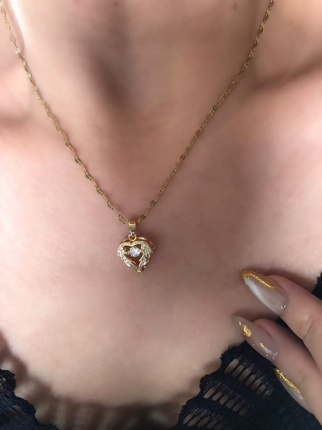 Angel wings heart necklace with a beating zircon center! 18k gold-plated titanium steel. Tarnish-free romantic jewelry. Shop HEYBIJOU divine collection!