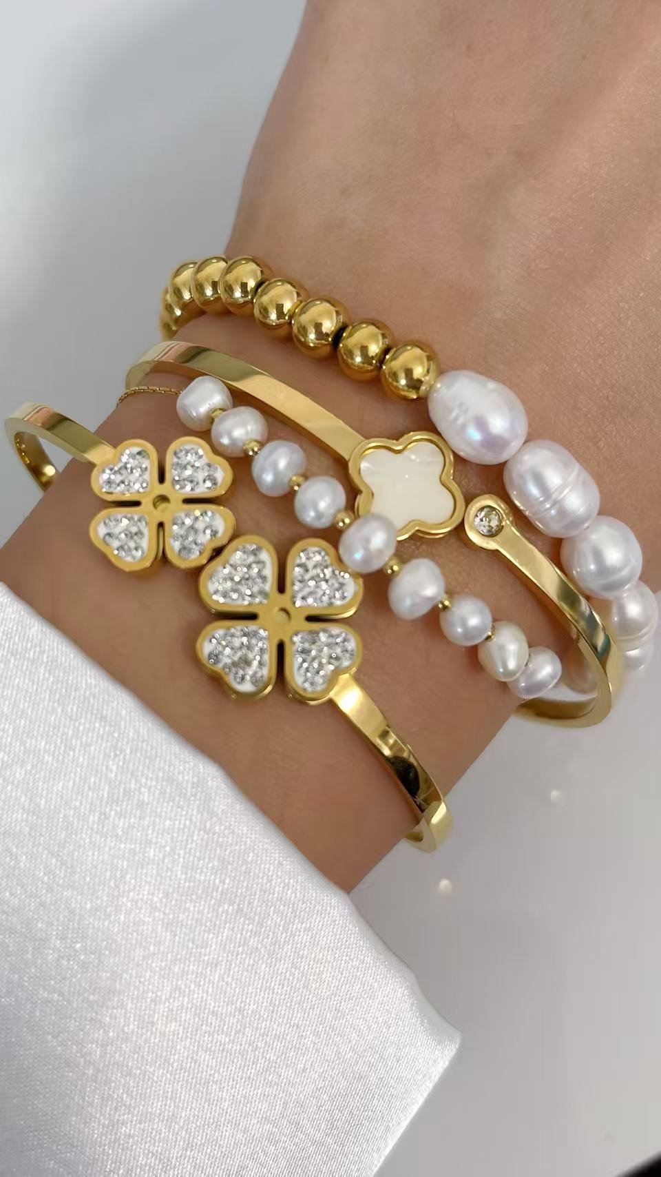 Elegant elastic bracelet with 18K gold plated titanium beads and lustrous pearls. Hypoallergenic, durable, and effortlessly timeless.