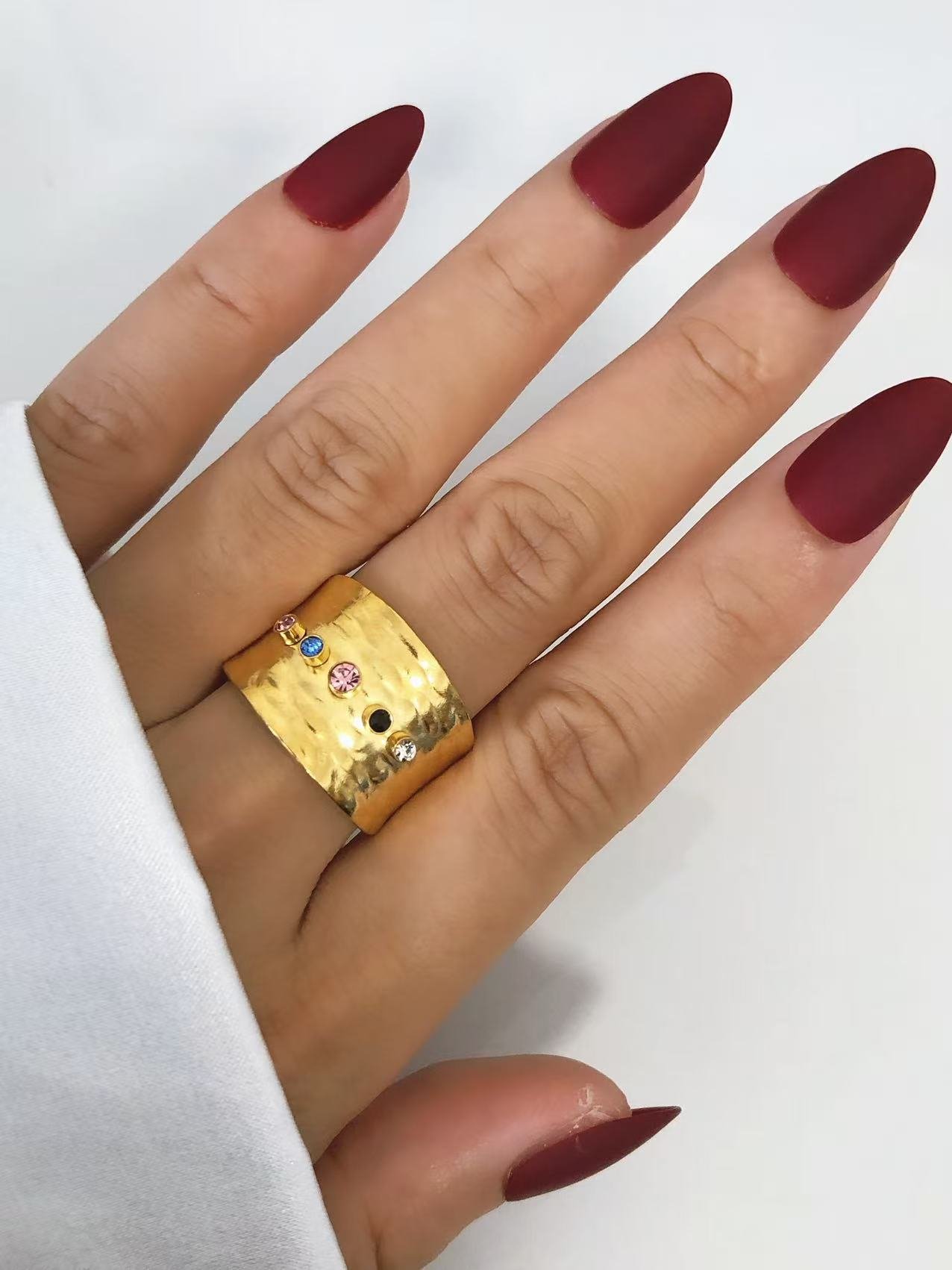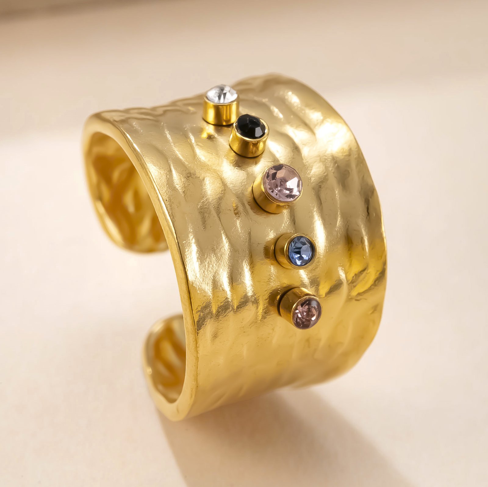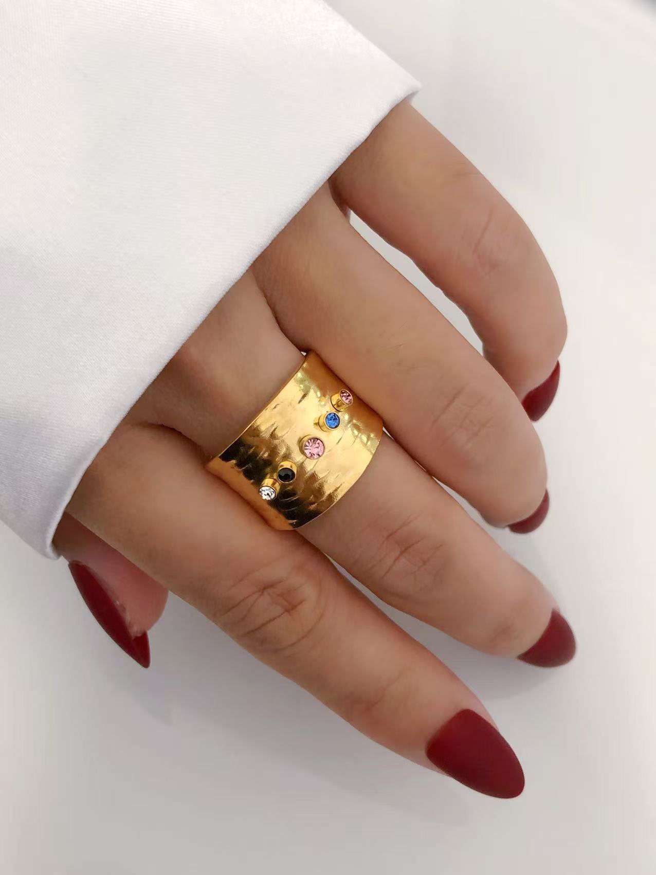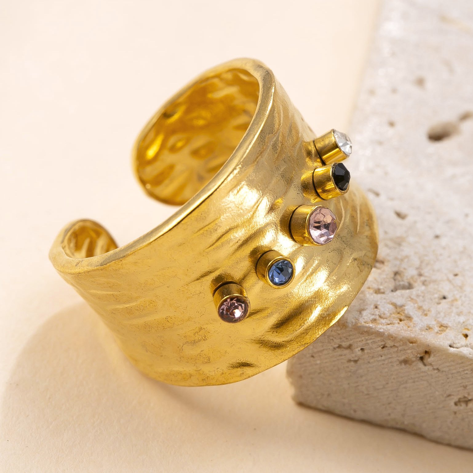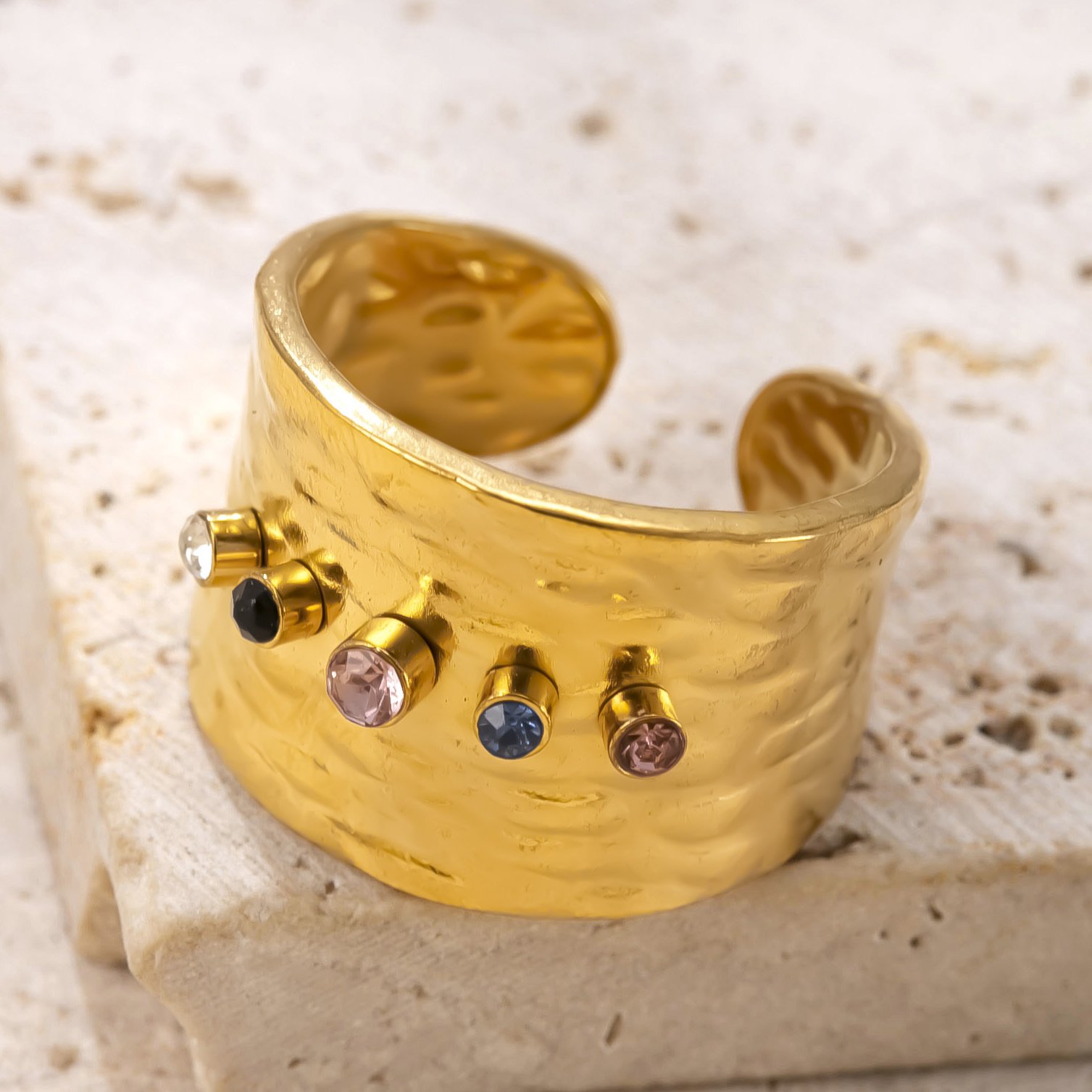 Adorned with carefully selected colorful zircons in purple, green, clear, and pink hues, this ring balances contemporary flair with timeless elegance. Each stone is securely bezel-set in gold, creating a constellation of brilliance across the hammered surface.