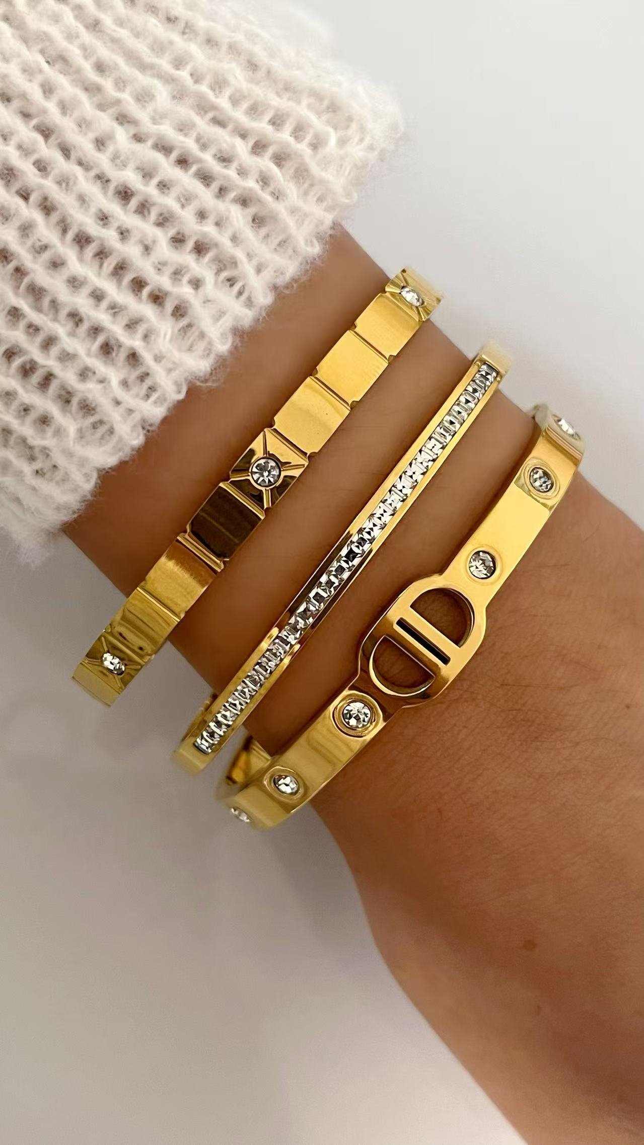 Modern titanium steel bangle with zircon inlays, available in 18K gold or silver plating. Durable, hypoallergenic, and perfect for everyday luxury.