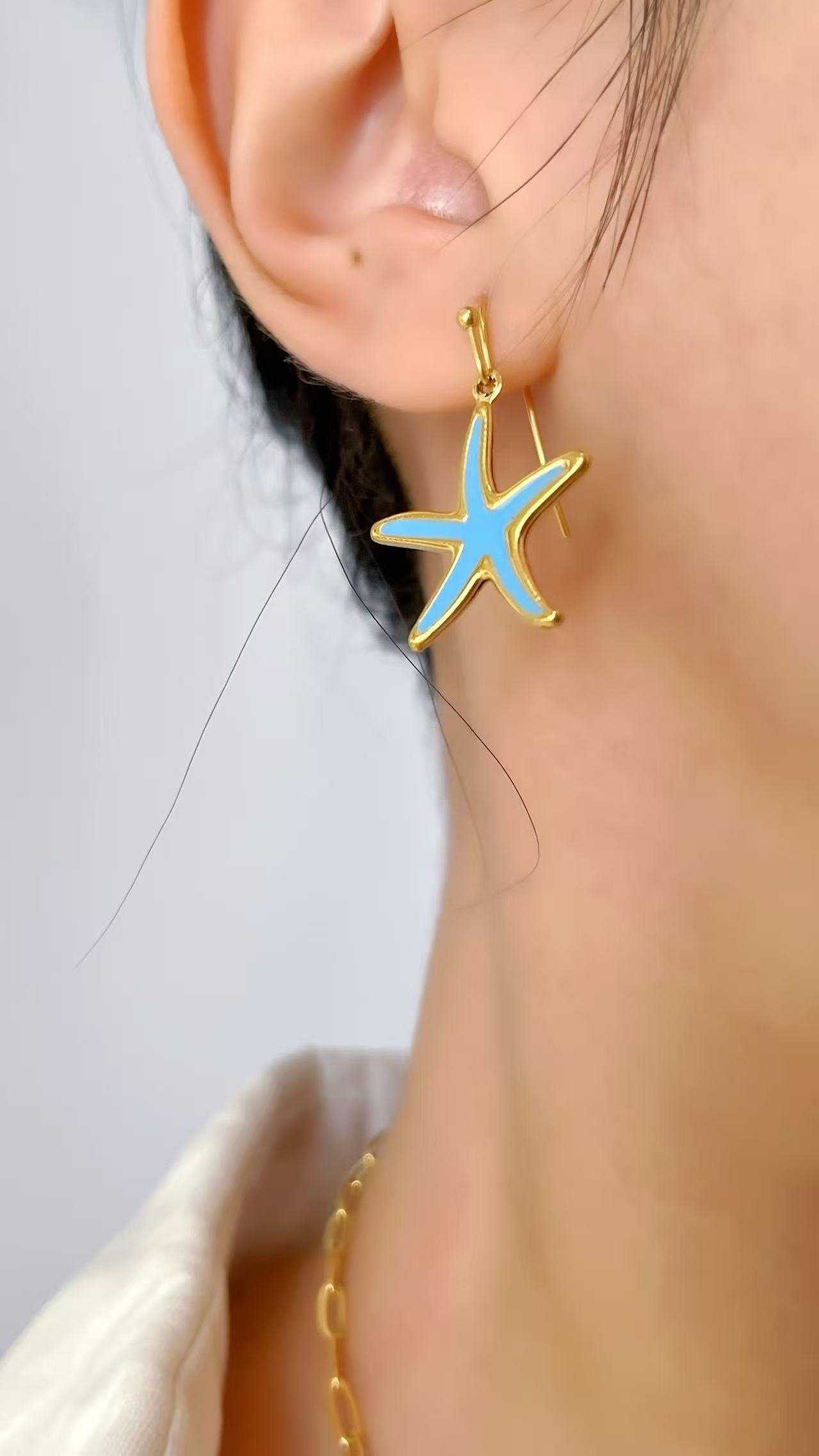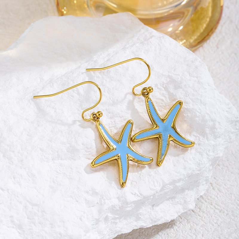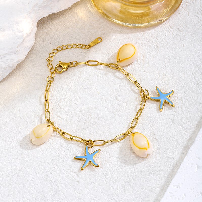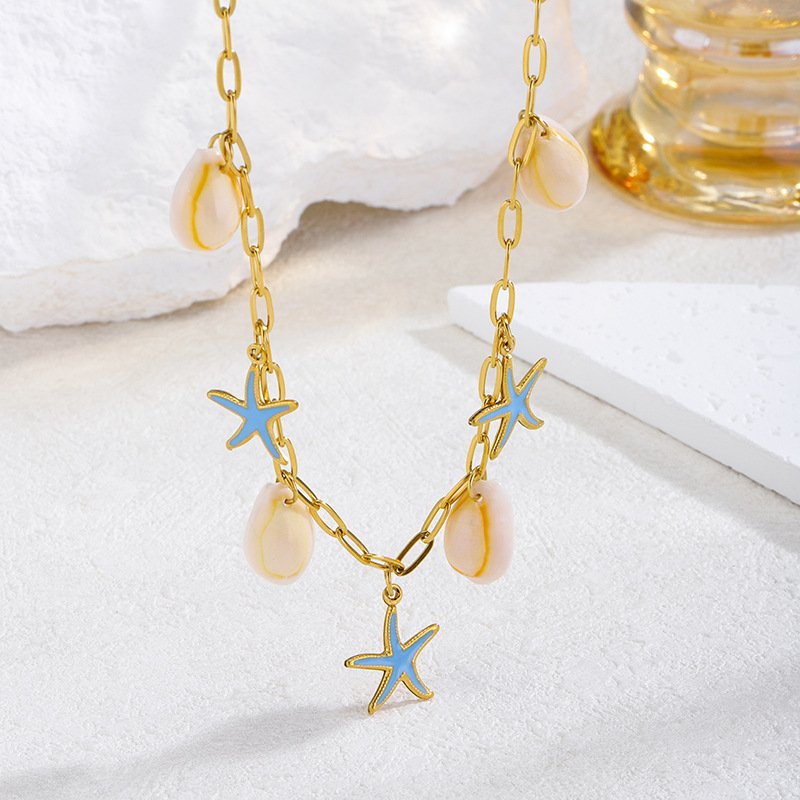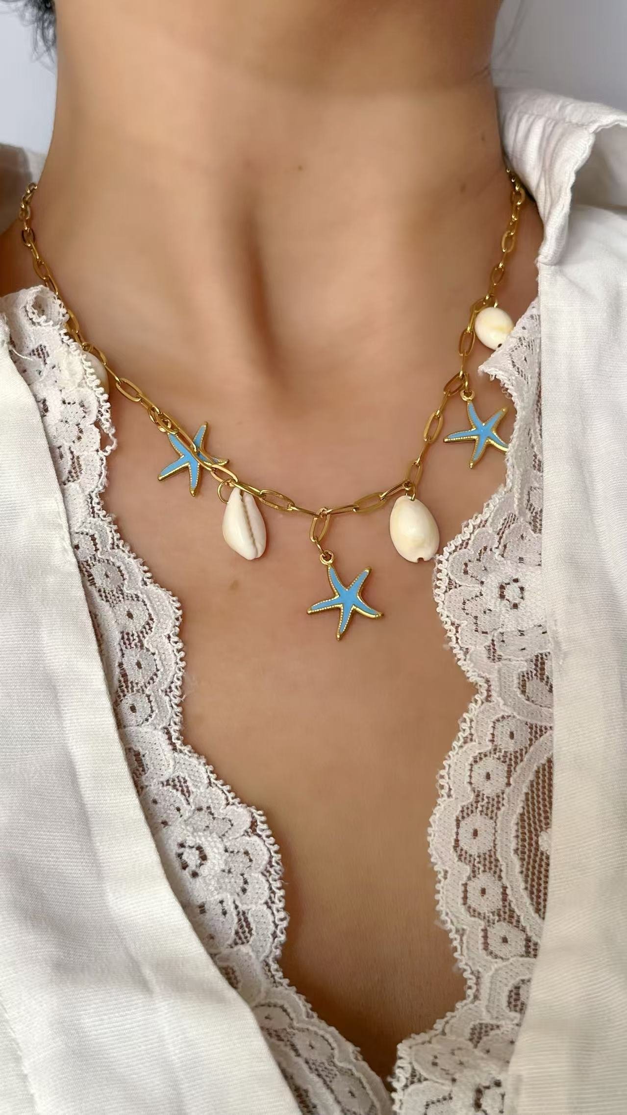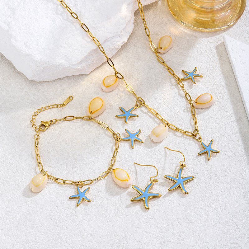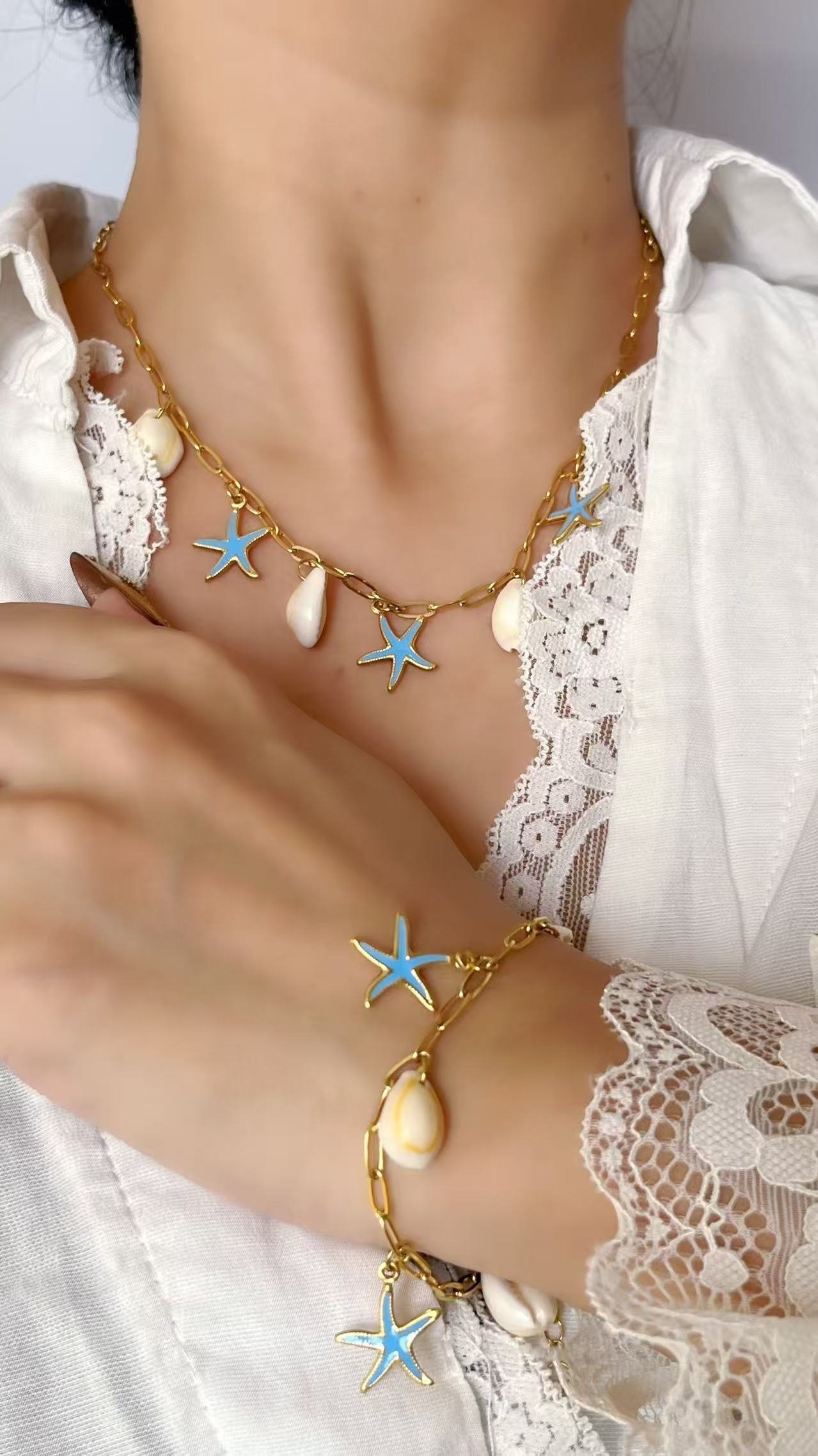Sail into elegance with HEYBIJOU Azure Star Seashell Set—18K gold-plated seashell & blue starfish in necklace, bracelet, earrings. Tarnish-free, water-resistant coastal glam!