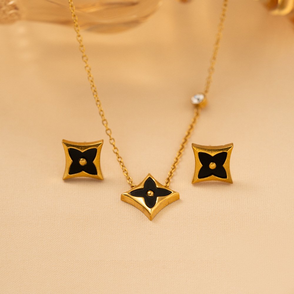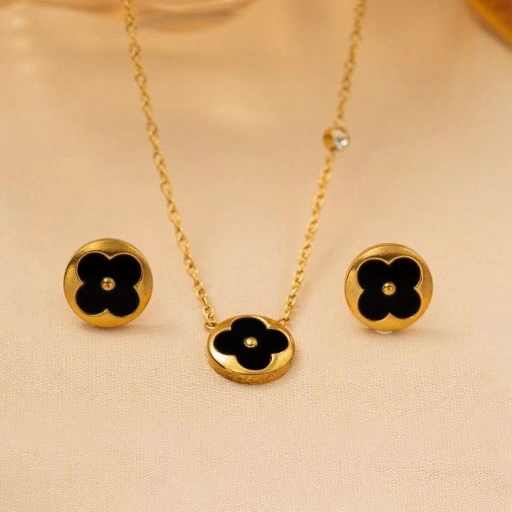 HEYBIJOU Bezel Clover Set: 18K gold plated necklace + studs in black/white mother-of-pearl. Tarnish-free, waterproof iconic elegance!