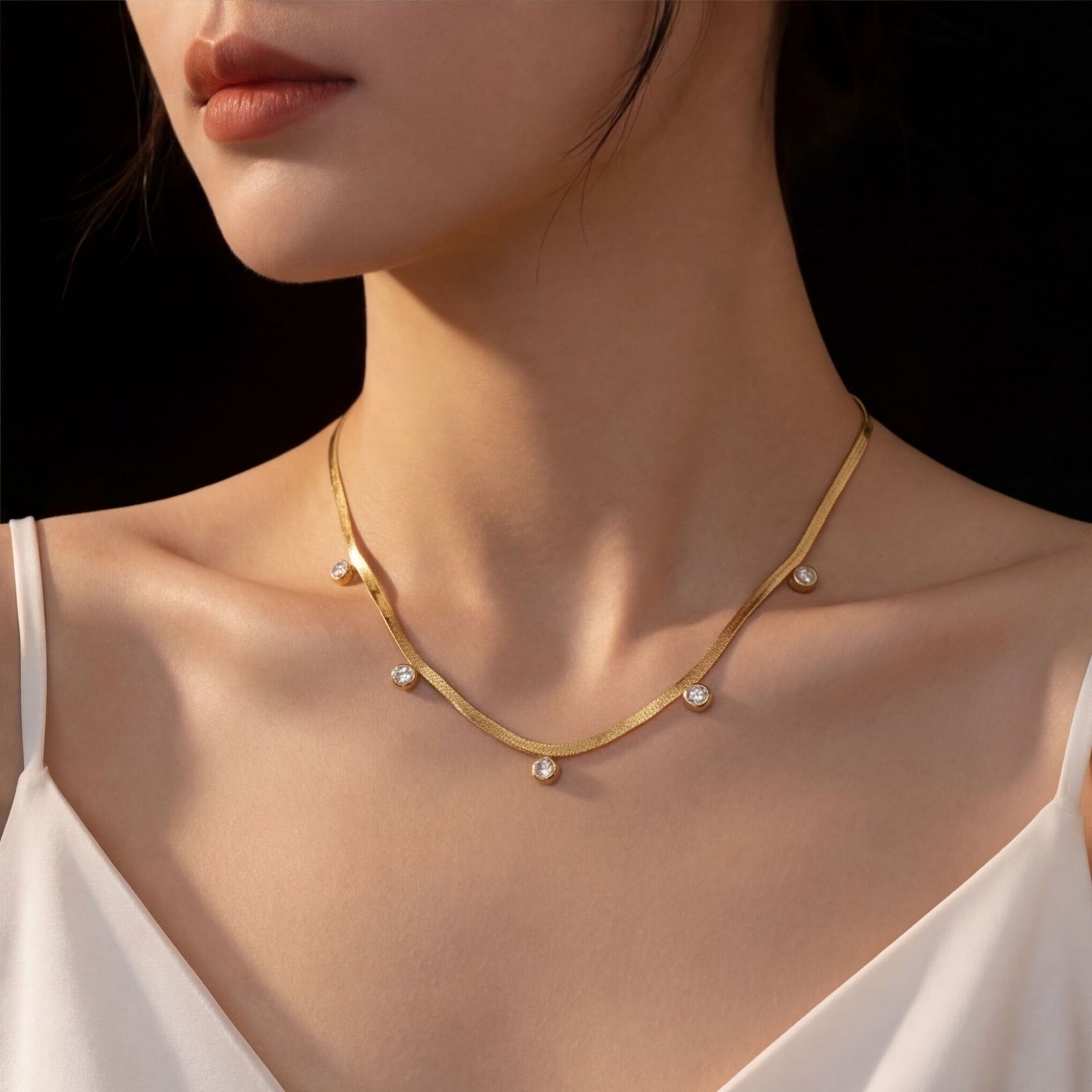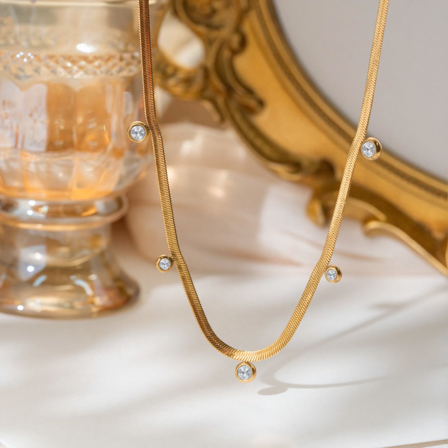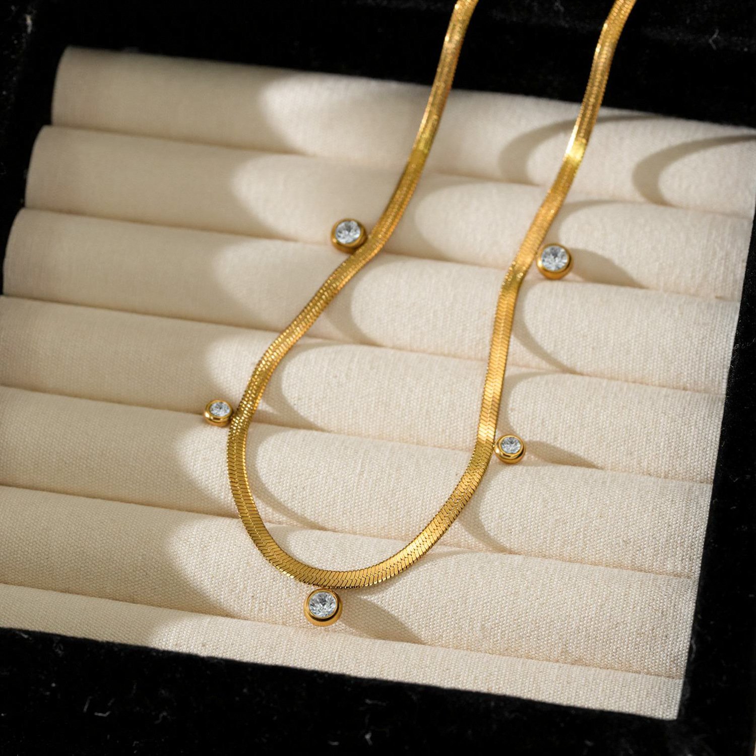 💎 Five Sparks Along a River of Gold The herringbone-weave snake chain is a masterpiece in itself — flat, wide, and supremely smooth, it drapes against the skin like liquid gold, moving and flexing with your body in the most satisfying way. Along its length, five round zircon stones are set in clean, minimalist bezel mounts — each one a perfect disc of sparkle punctuating the golden chain at evenly spaced intervals like stars scattered across a golden horizon. The bezel setting is the chicest way to wear a stone — no prongs, no fuss, just a sleek gold rim hugging each zircon in quiet, confident luxury. The result is a necklace that feels simultaneously minimal and special, everyday and elevated — the rarest and most covetable combination in jewelry.