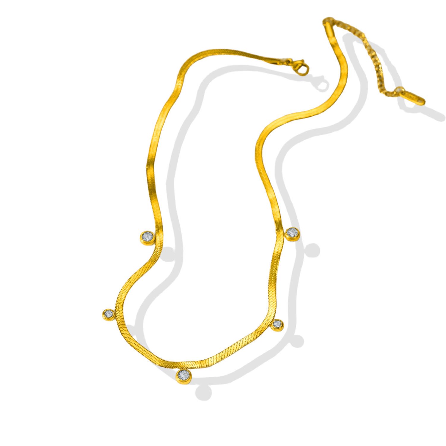 Gold snake chain necklace with 5 bezel zircon stations — flat herringbone, tarnish-free & water-resistant. Effortless luxury by HEYBIJOU.