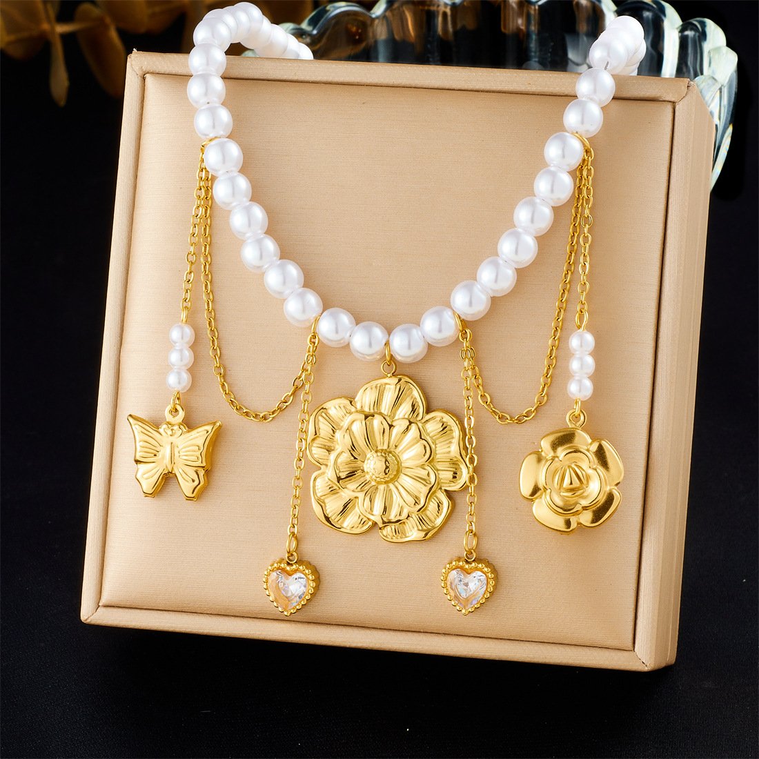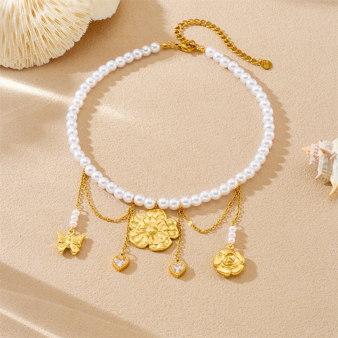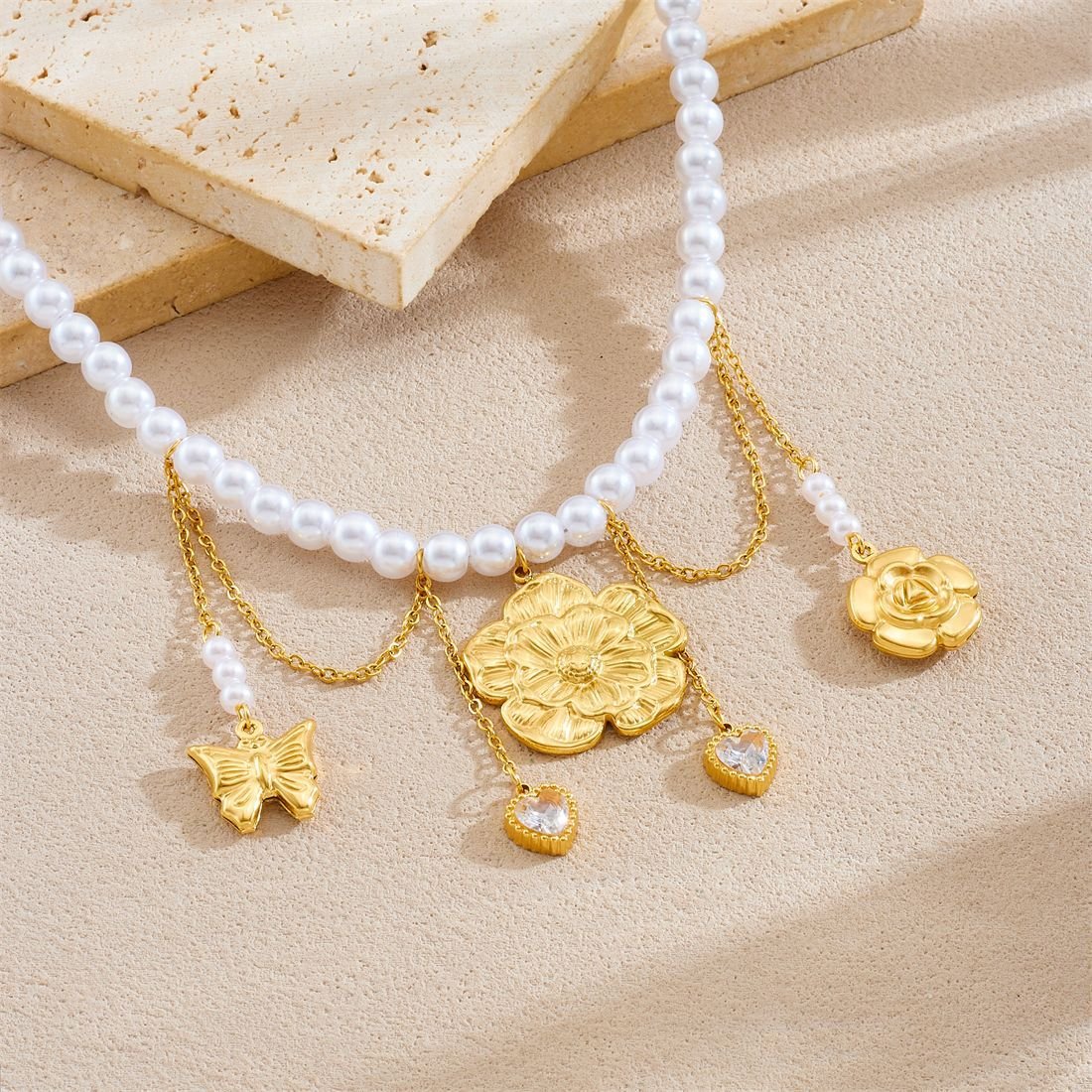 Crafted from premium titanium steel with rich 18k gold plating, the necklace combines the soft glow of high-quality pearls with intricately sculpted gold charms that capture every petal and wing in stunning detail. The 33.5cm chain with 9cm extender offers versatile styling options, while the lightweight 18g design ensures comfortable, graceful wear. Layer it over a sweater or let it shimmer against skin—this piece exudes heirloom-worthy sophistication!