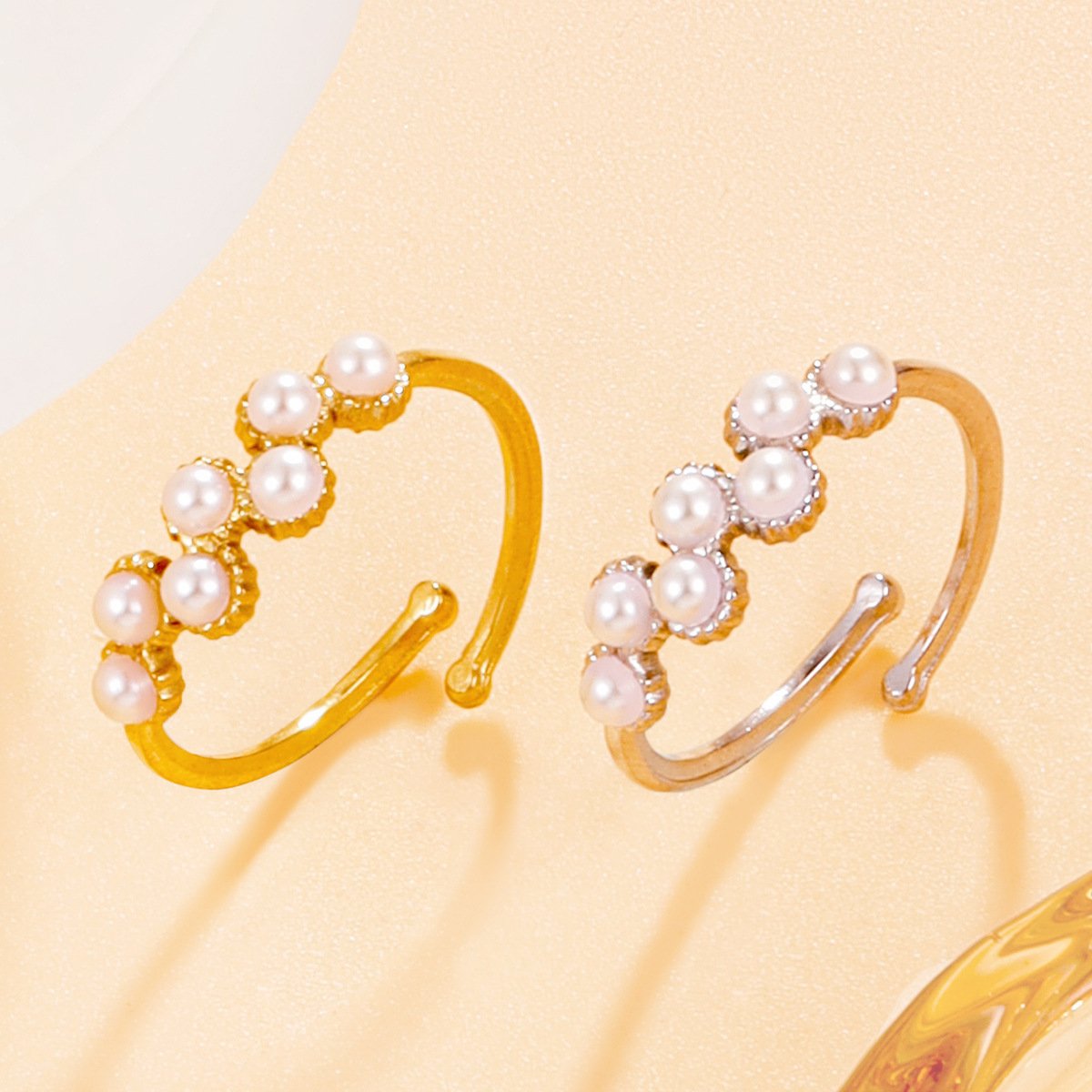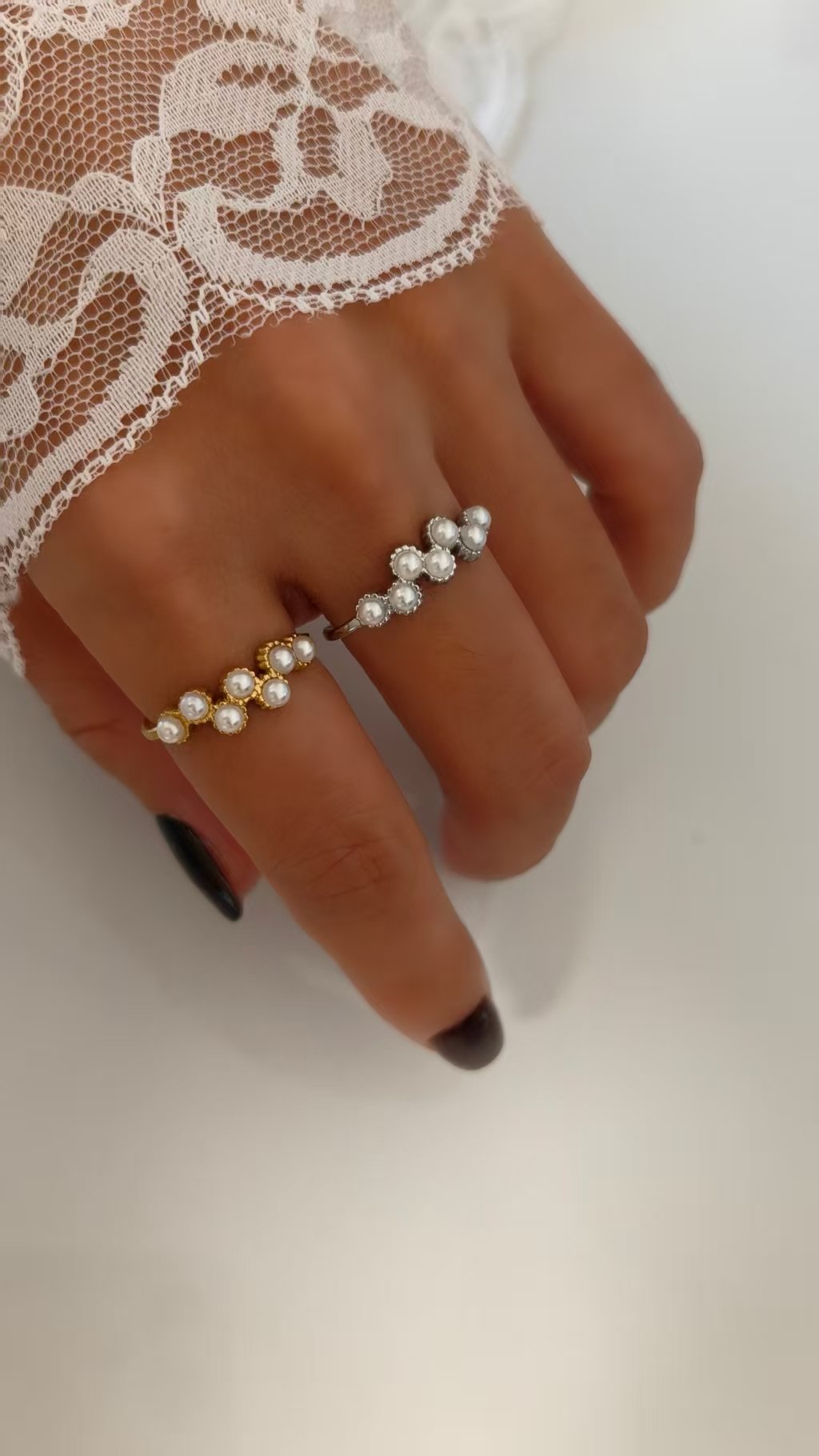 7 real pearls in 18K gold or silver plated titanium steel. Tarnish-free, waterproof, adjustable dainty open ring – timeless elegance!