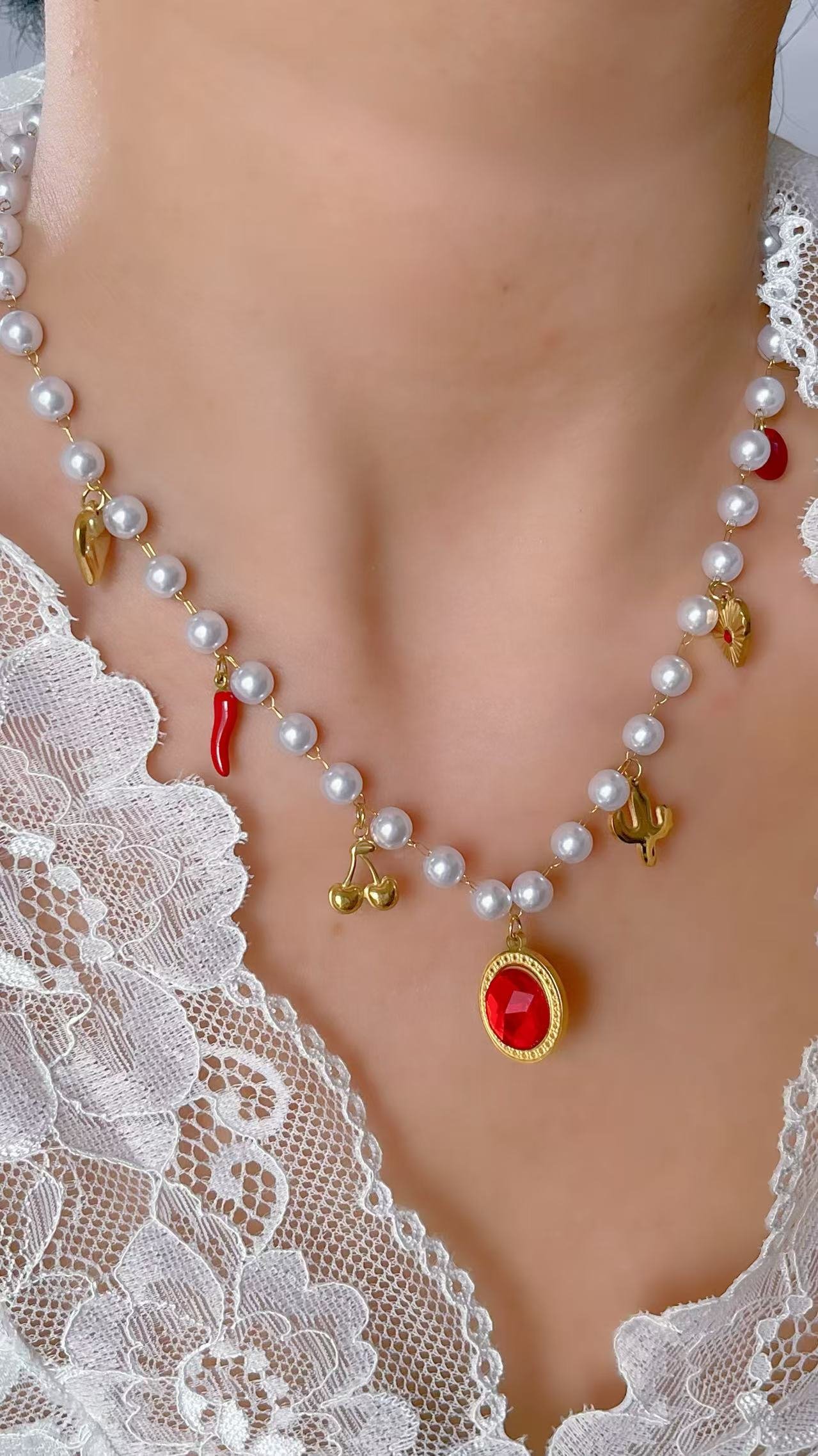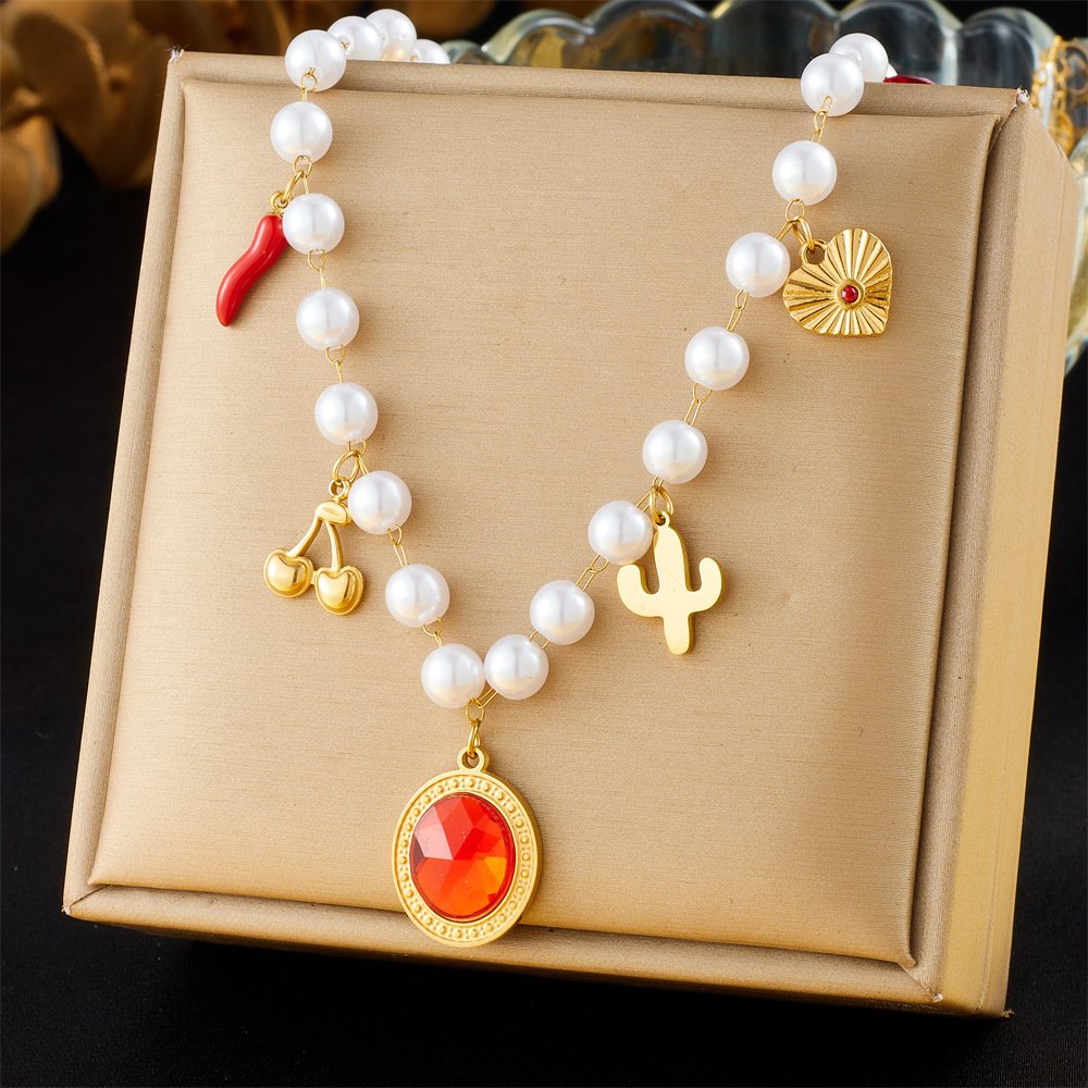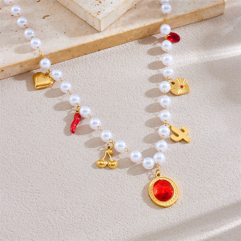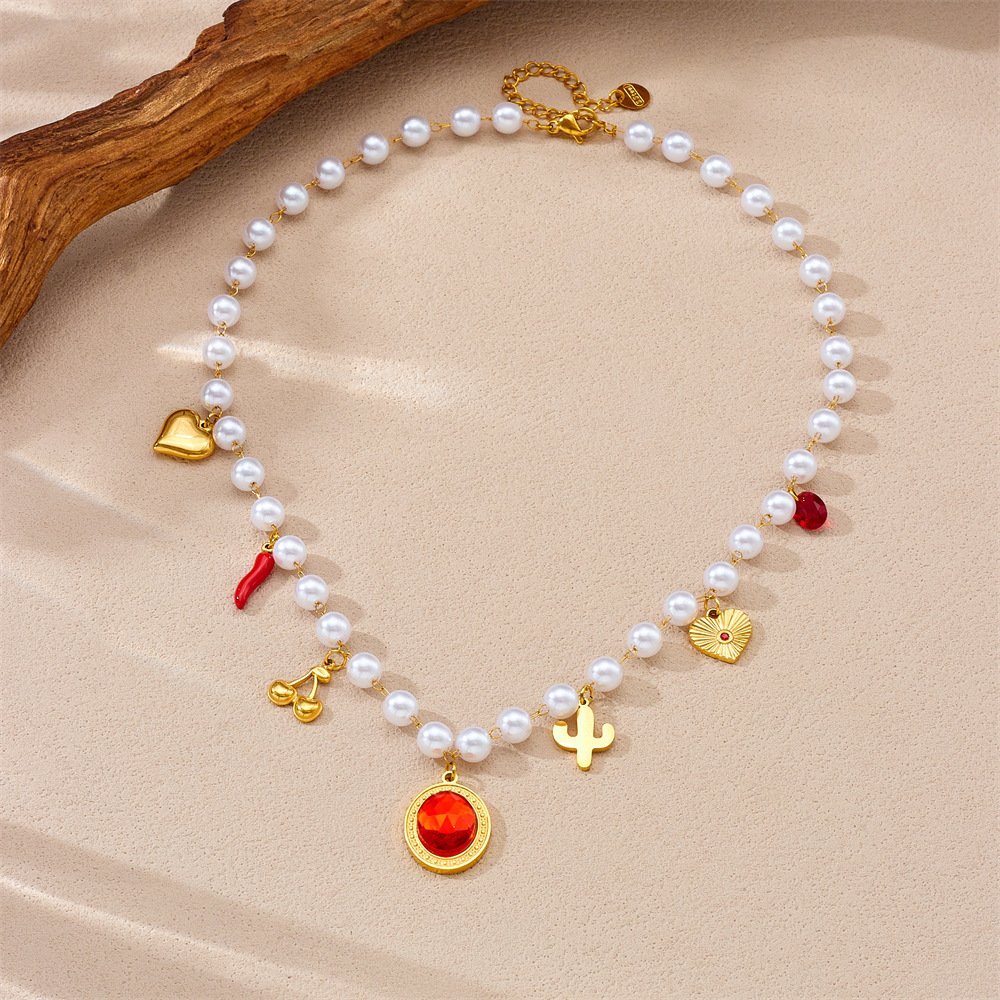 HEYBIJOU’s Boho Radiance Multi-Charm Pearl Necklace—18K gold titanium strand with red gem sun heart, cherries & cacti. Tarnish-free, waterproof whimsy for necks that roam free!