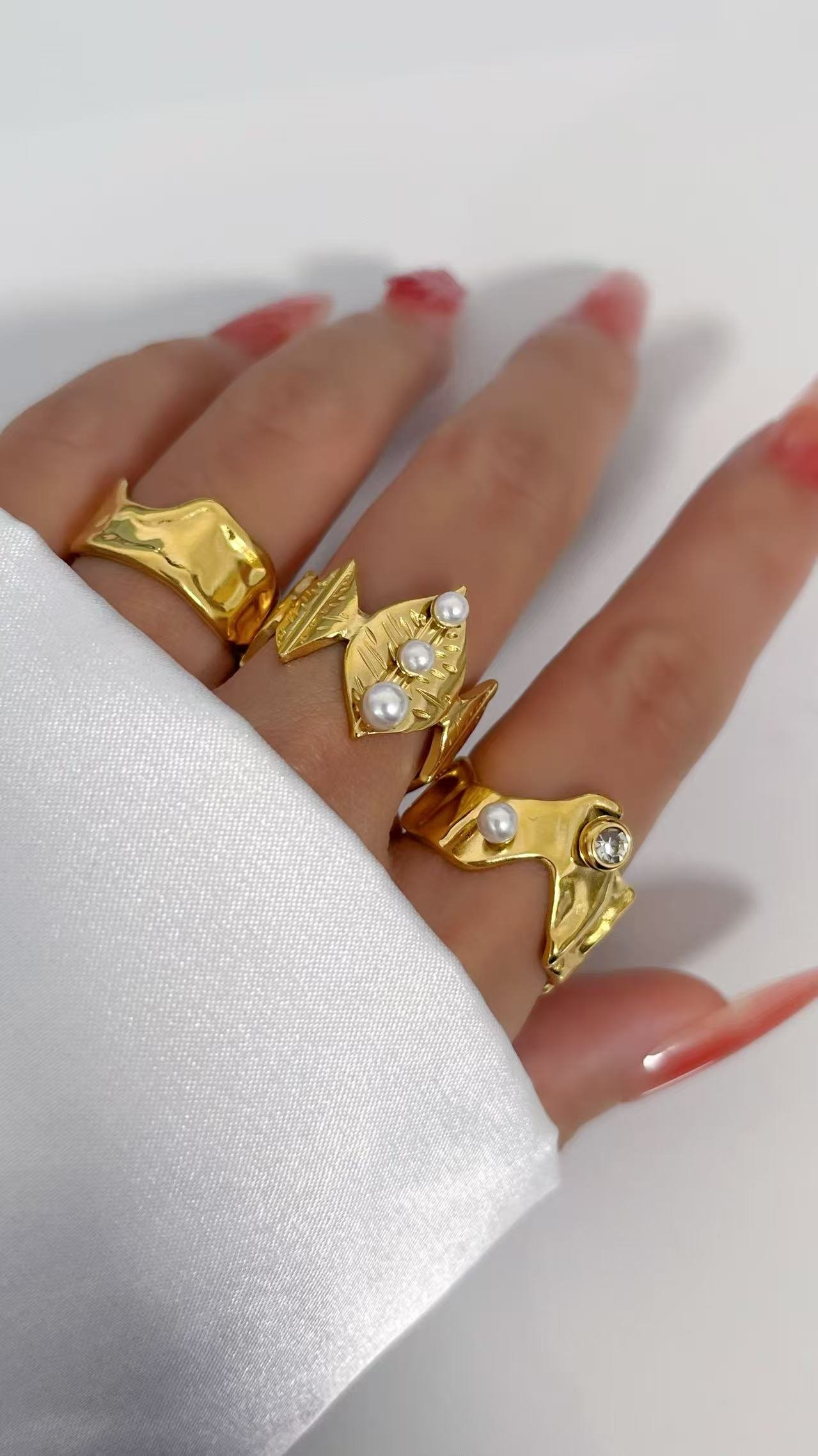 Botanical leaf crown ring with pearls in 18k gold. Statement sculptural design, adjustable fit, tarnish-free. Royal nature jewelry. Shop now!