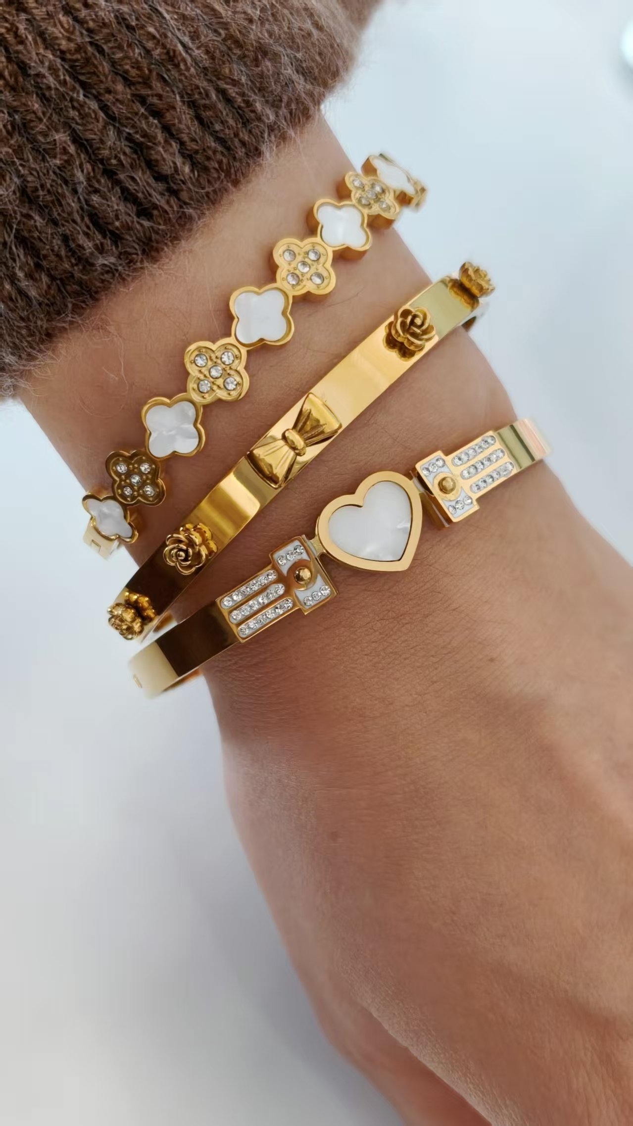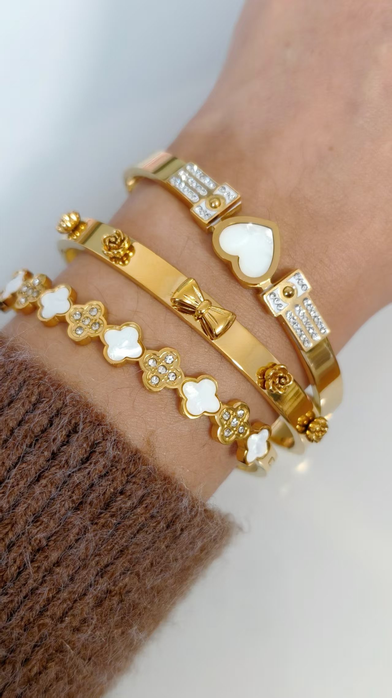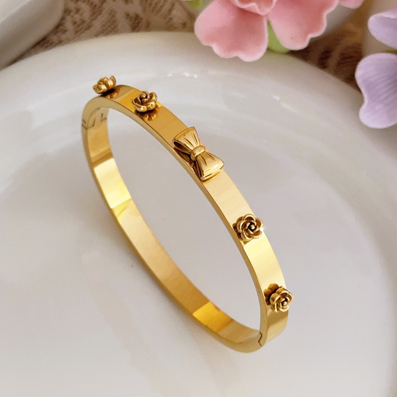 Feel the opulence in the craftsmanship – the raised bows and roses stand out against the smooth, mirror-like gold surface, creating depth, texture, and that irresistible high-fashion contrast. Comfortably contoured for all-day (and all-night) wear, this bangle slips on with ease and stays perfectly in place, making it ideal for solo wear or stacking with dainty pieces. Whether you’re dressing up for date night or adding a touch of sweetness to your daily look, this piece radiates joy, femininity, and undeniable premium allure that makes every glance feel special.