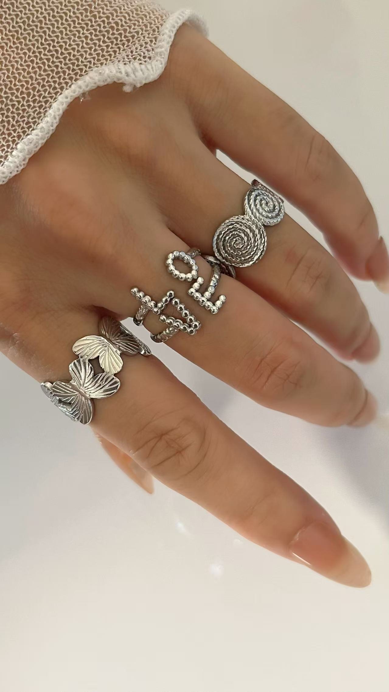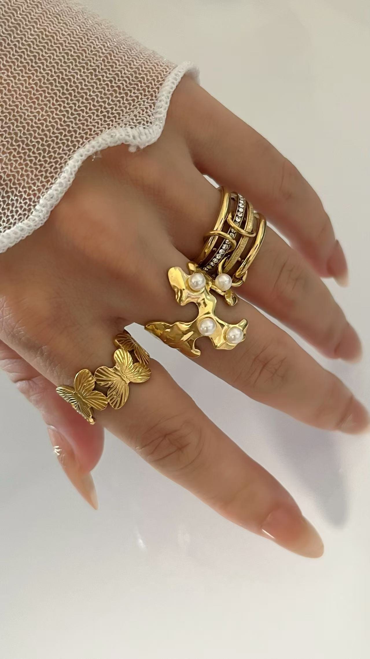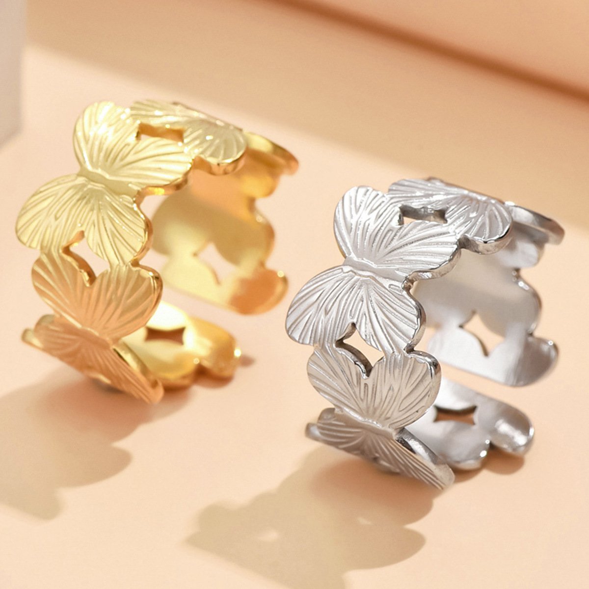 Butterfly Garden Ring in 18k gold/silver titanium steel. Wide open band with detailed butterfly motifs, tarnish-free & water-resistant jewelry.