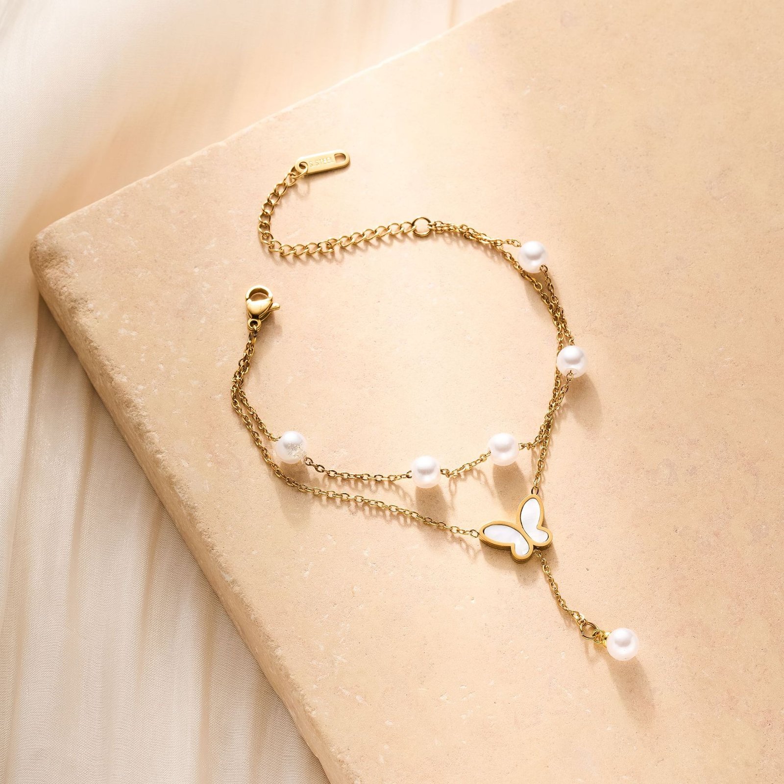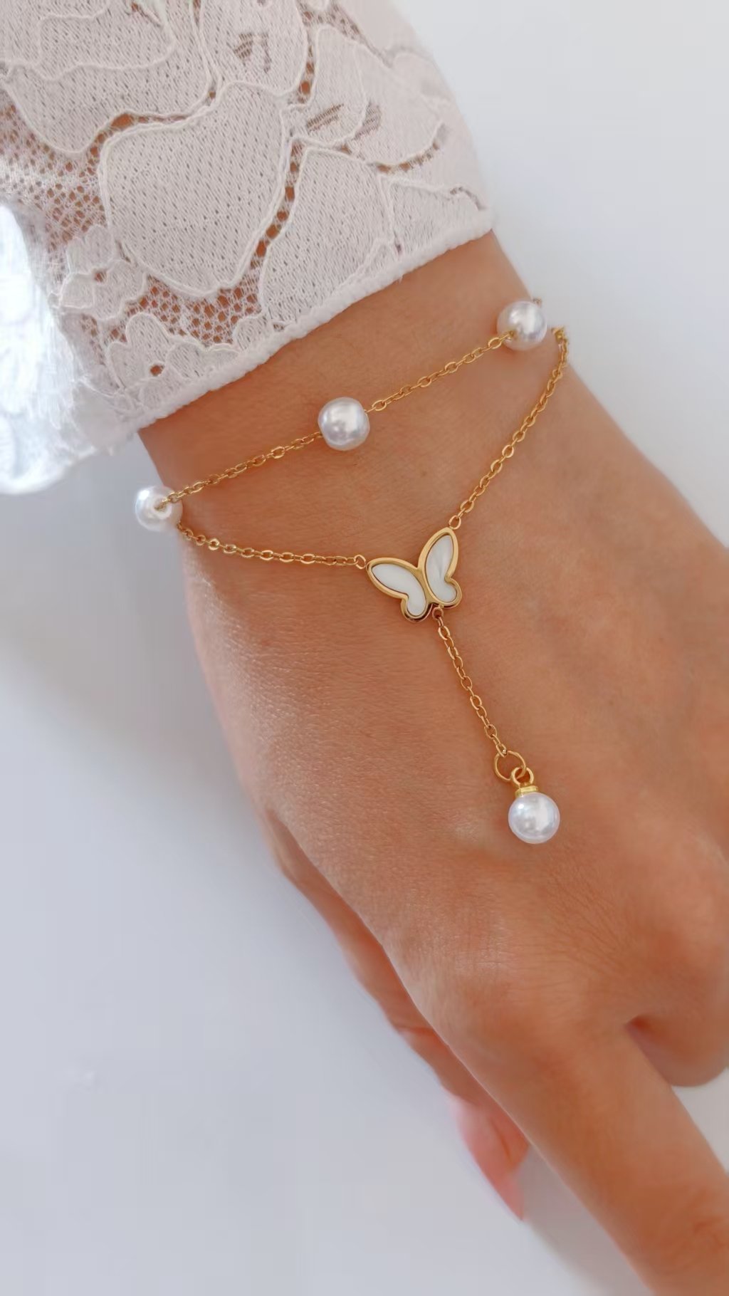 Crafted on a solid titanium steel base, this bracelet is completely tarnish-free and fully water-resistant. The 18K gold chains stay bright, the pearls stay luminous, and the butterfly charm maintains its shell glow through every wear, every wash, and every adventure. Delicate in appearance, durable in reality — always.