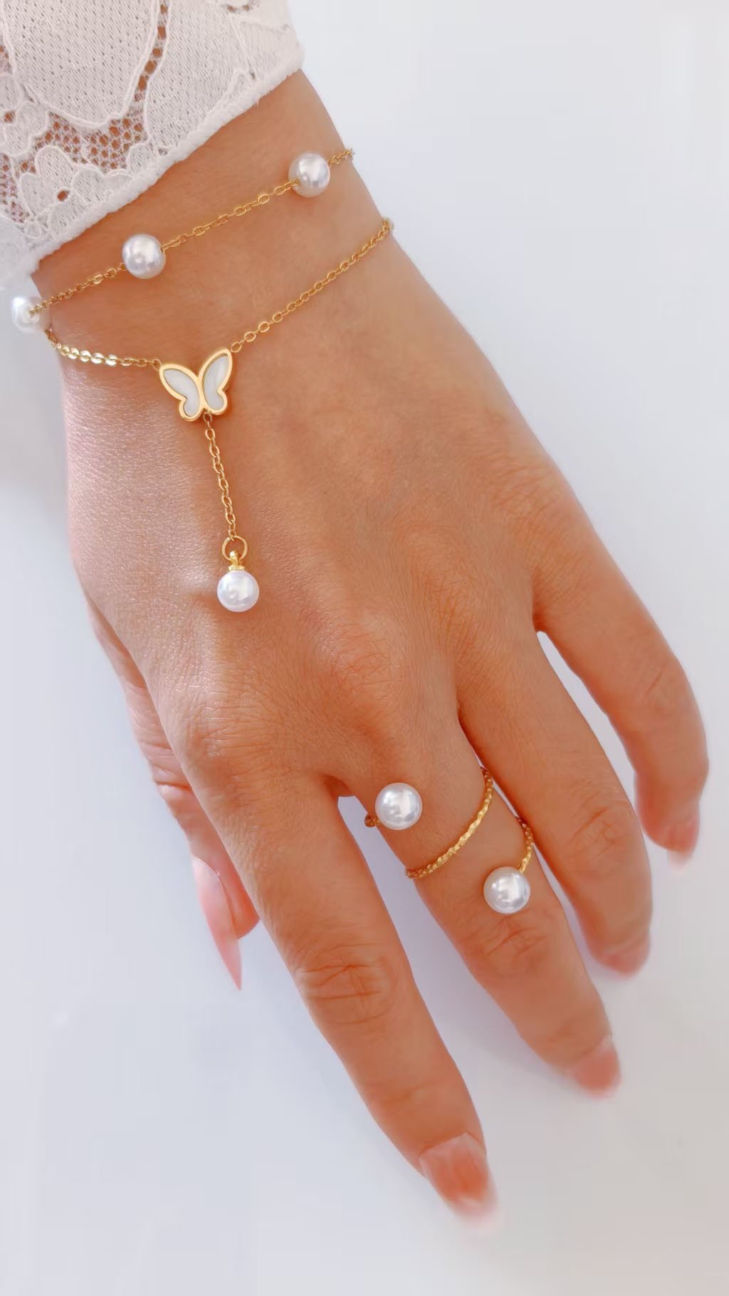 Introducing the HEYBIJOU Butterfly Pearl Layer Bracelet — a dreamy, double-chain wrist piece that feels like it was made for golden hour. A delicate upper chain dotted with lustrous floating pearls layers above a finer chain that cascades through a mother-of-pearl butterfly charm and trails into a graceful pearl drop below. Feminine, free-spirited, and deeply romantic — this bracelet doesn’t just sit on your wrist, it transforms it into something poetic.