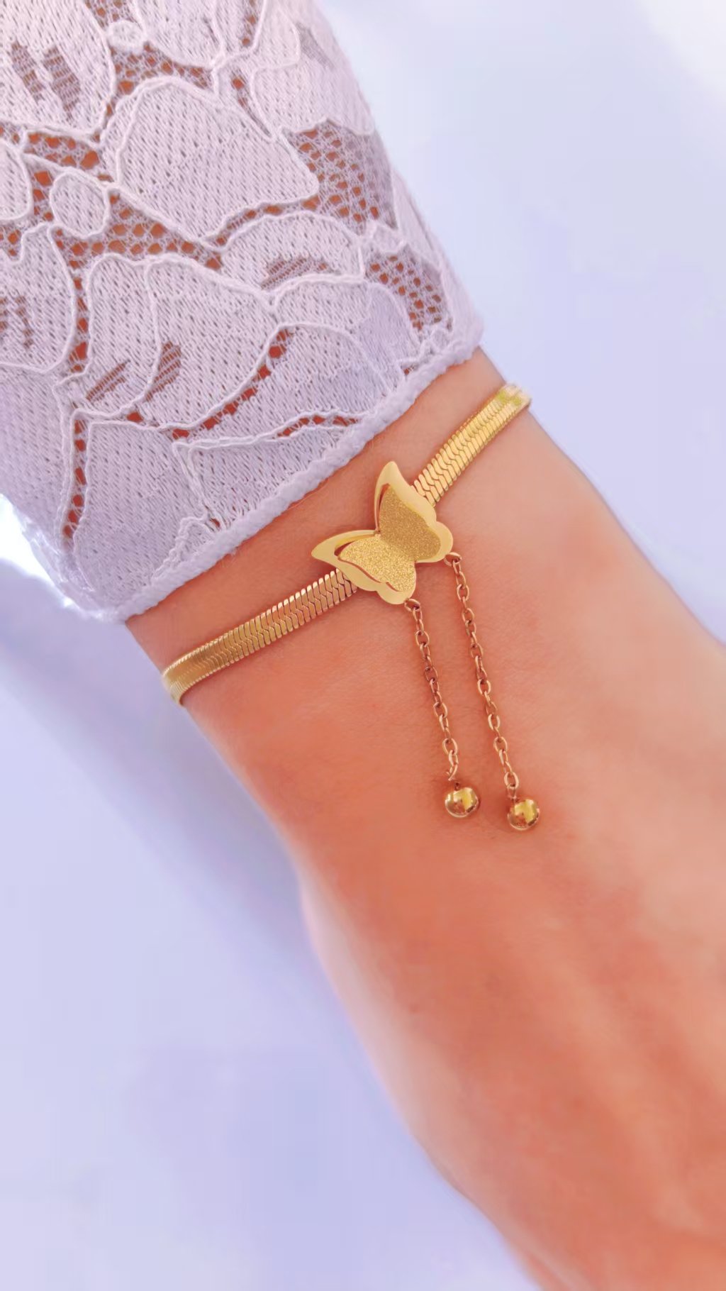 The HEYBIJOU Butterfly Tassel Snake Chain Bracelet is the wrist piece that hits every note perfectly — sleek and modern, playful and feminine, minimal and detailed all at once. A wide, flat gold herringbone snake chain wraps the wrist like liquid gold, while a frosted butterfly charm perches at the front with two delicate chain tassels dropping freely below, each tipped with a polished gold ball bead. It moves, it catches light, and it makes every single outfit look like an intentional fashion moment.