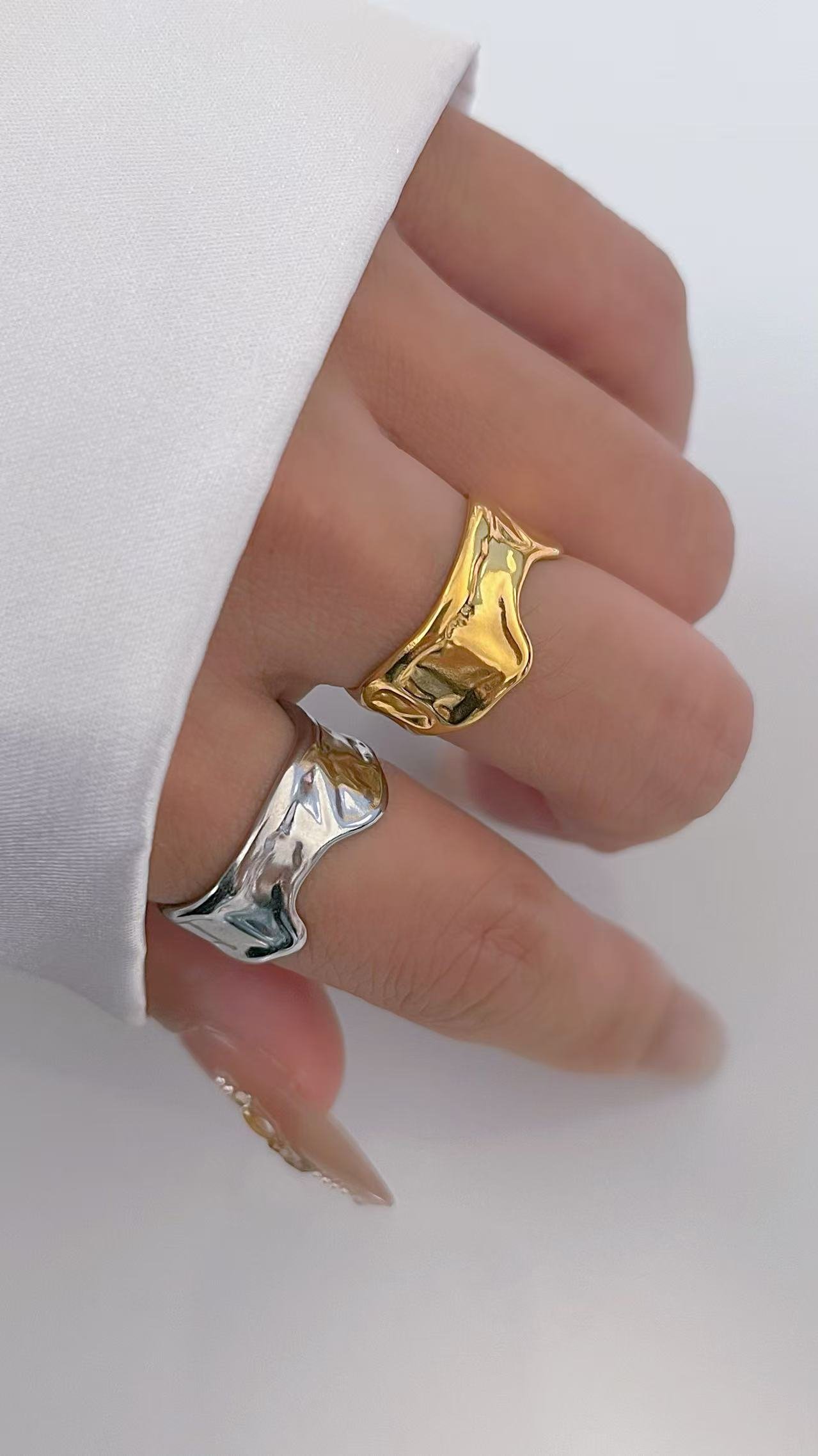 HEYBIJOU’s Cascading Pleat Wavy Open Ring—18K gold/silver titanium cuff with fluid folds. Tarnish-free, waterproof texture for fingers flowing in effortless high-end waves!