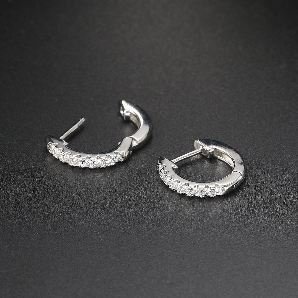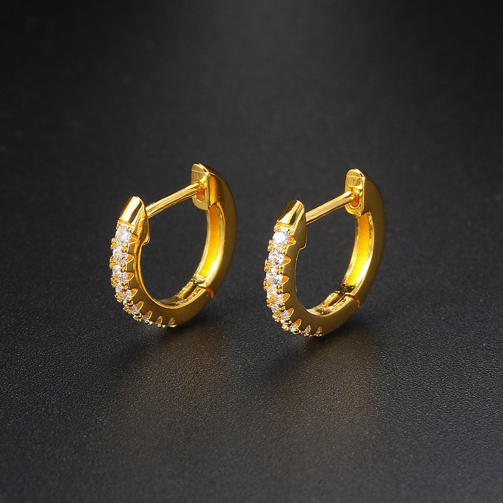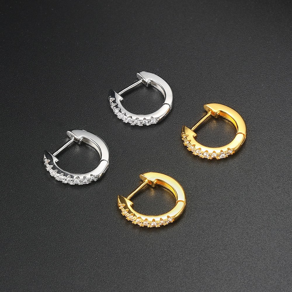 • 💎 Pavé Huggie Hoop — A slim, close-fitting hoop encrusted in a full row of brilliant zircons, available in silver tone for a cool mixed-metal contrast or gold to match the set
