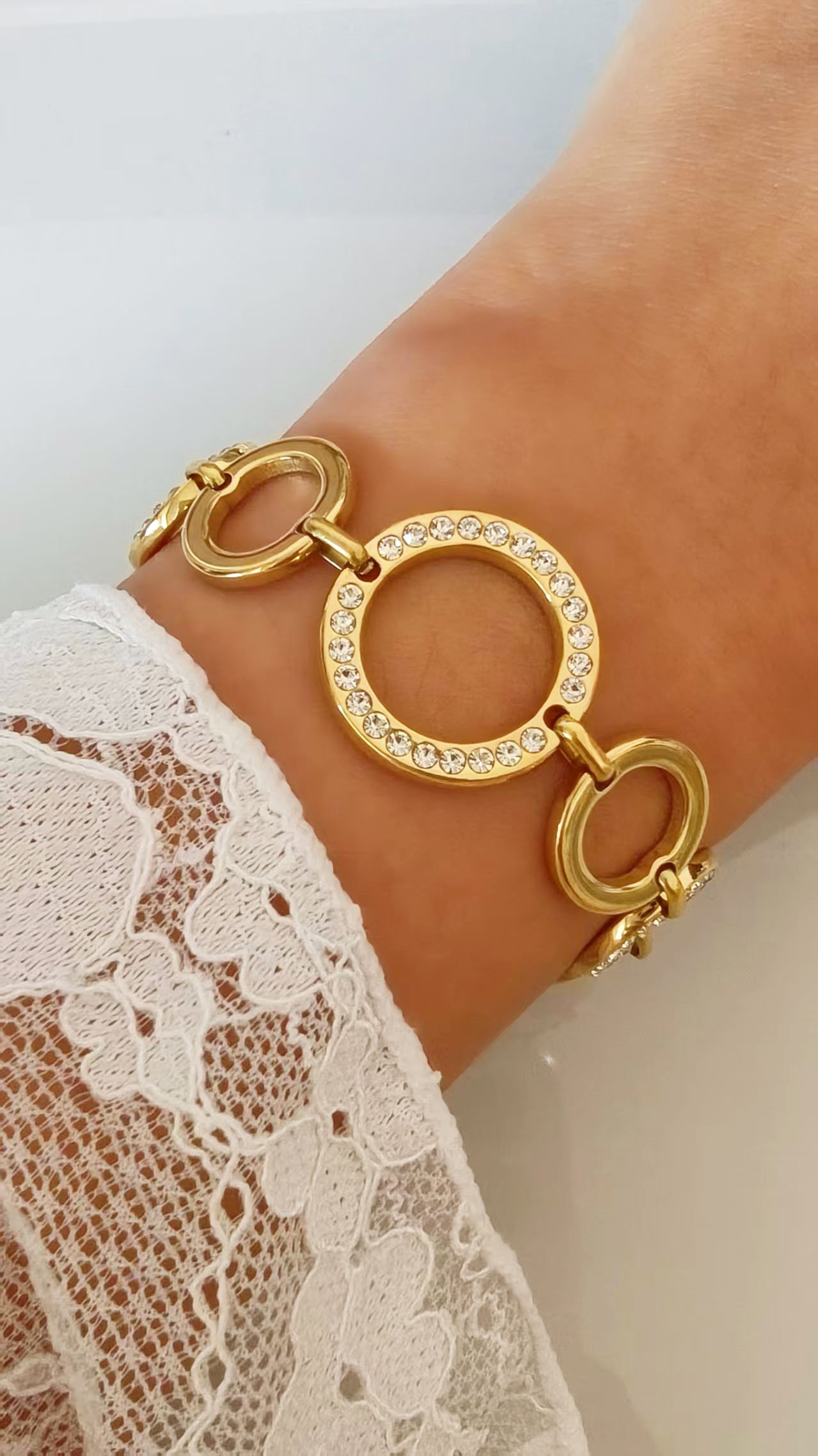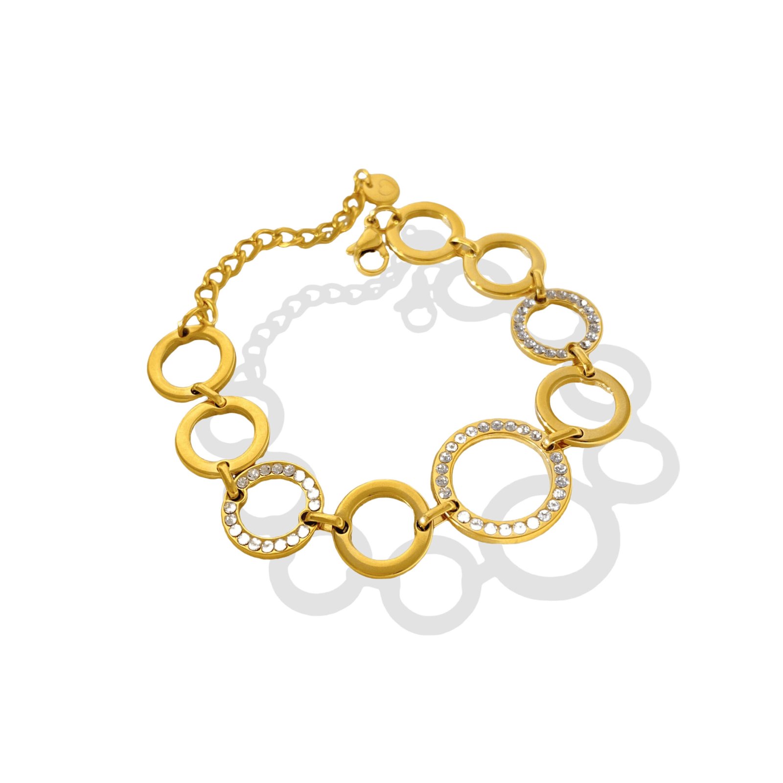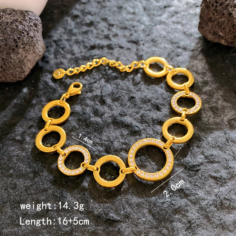Sparkle endlessly with HEYBIJOU’s Circles of Sparkle Bracelet: 18K gold-plated multi-circle zircon links! Tarnish-free, water-resistant bold luxury glow