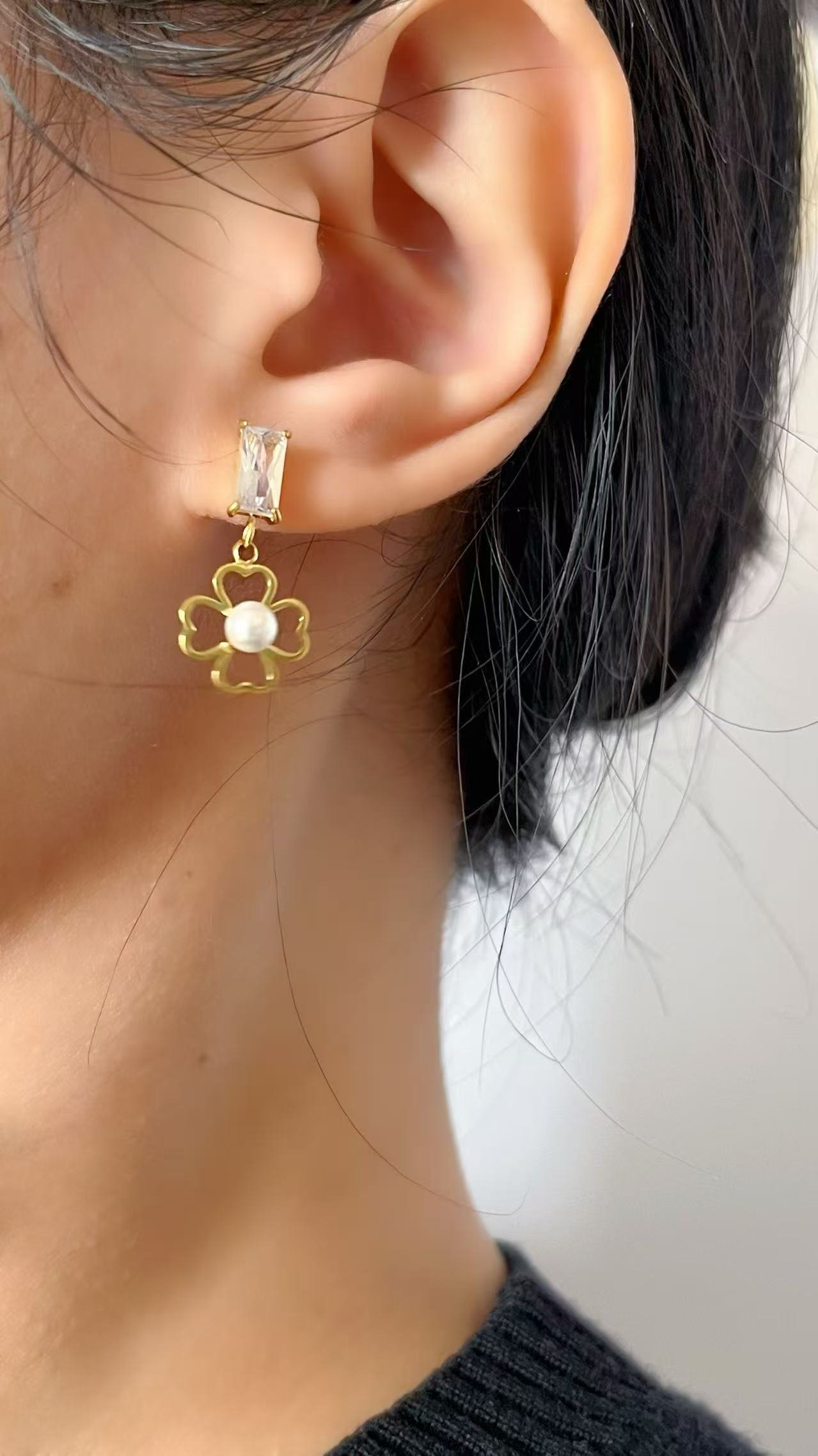 Crafted from premium titanium steel and plated in 18K gold, these earrings blend durability with elegance. The golden frame outlines the clover in a delicate silhouette, while the white pearl adds a soft, romantic glow.