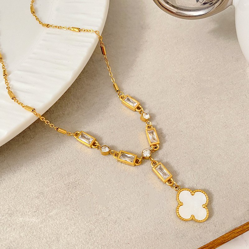 Clover crystal Y-drop necklace with mixed-cut zirconia. 18K gold titanium steel, tarnish-free & water-resistant. Elegant lucky charm! 🍀✨