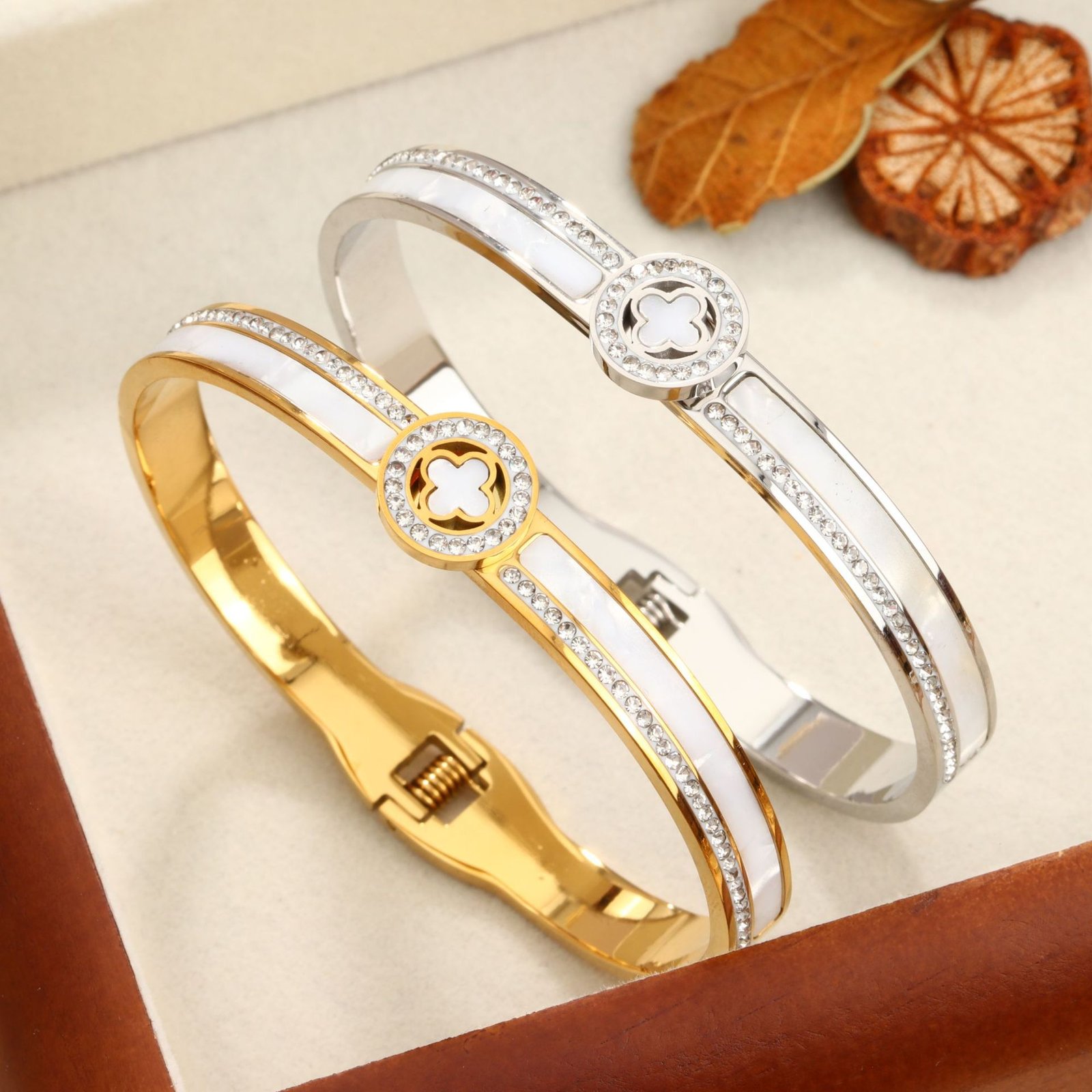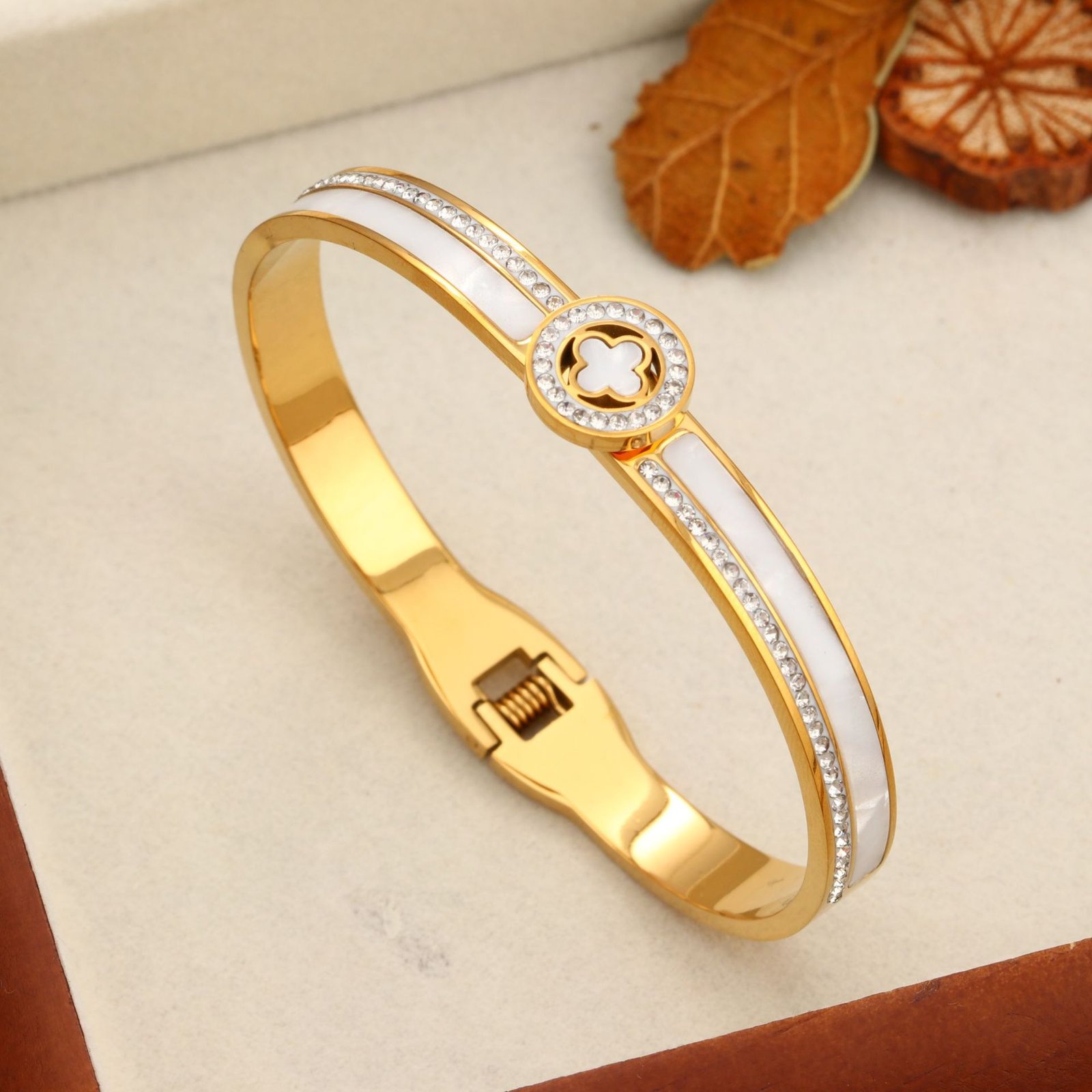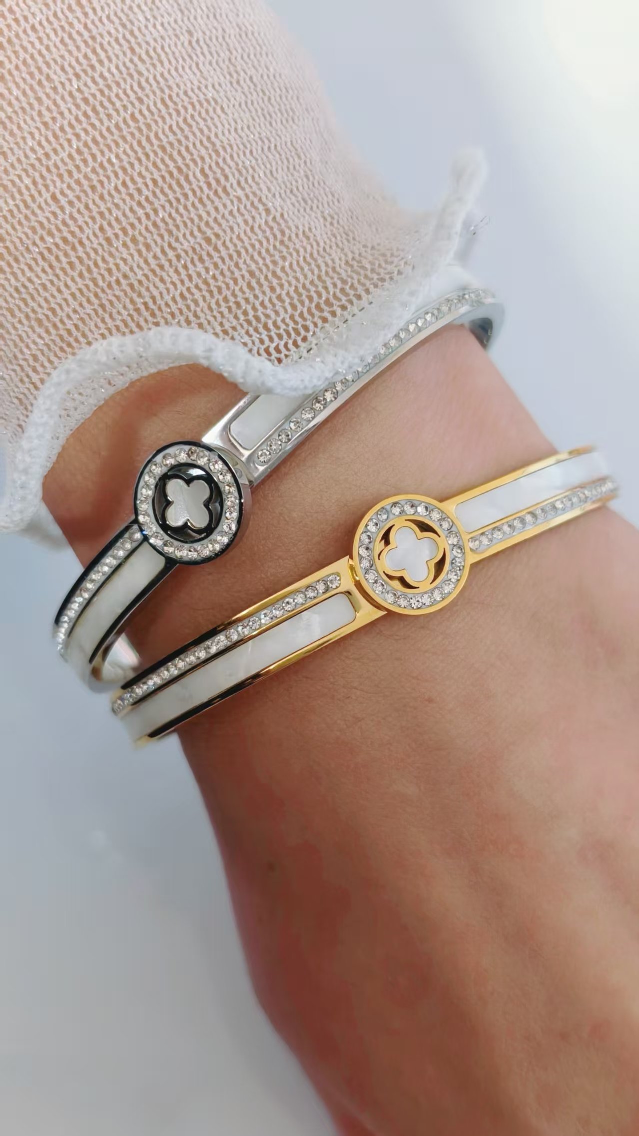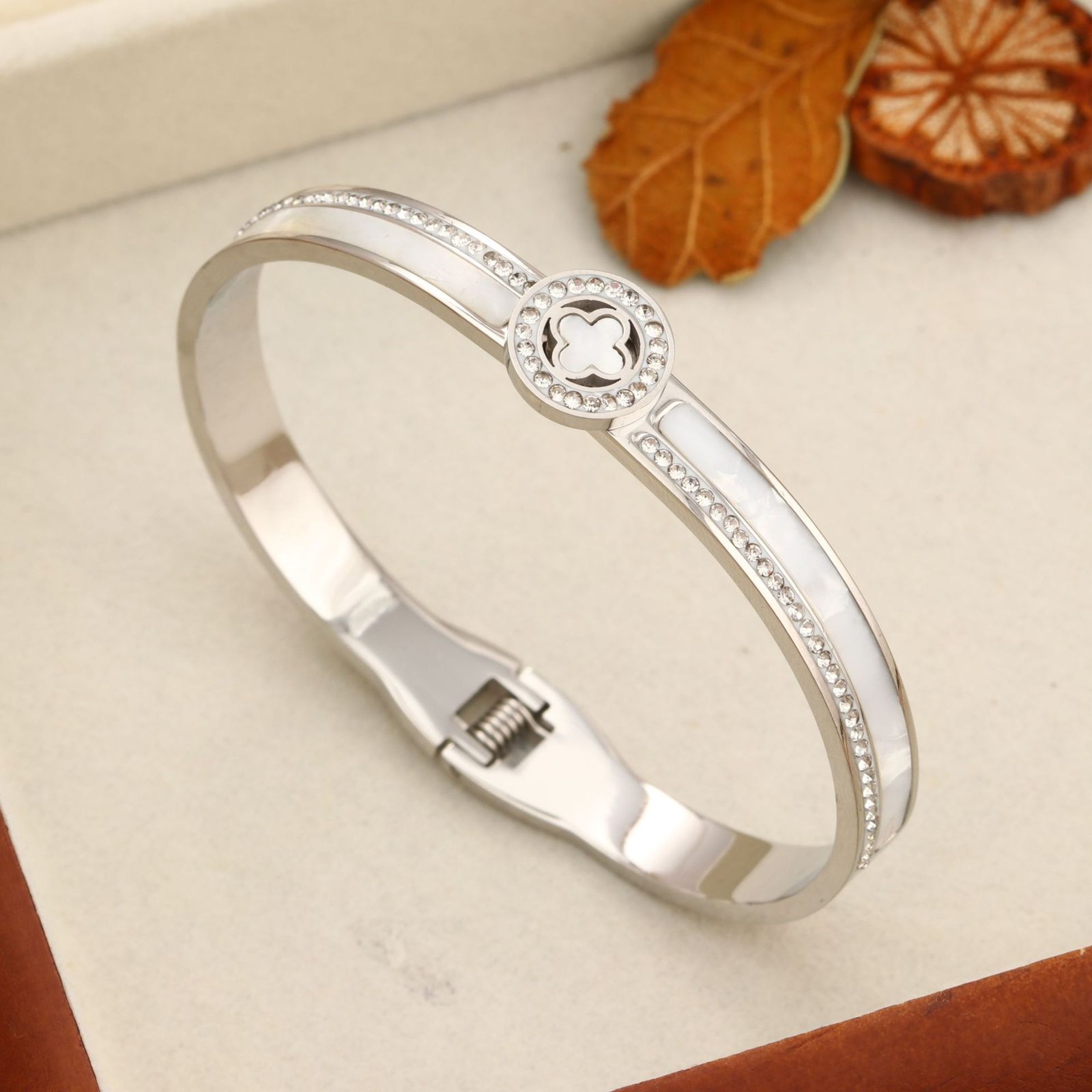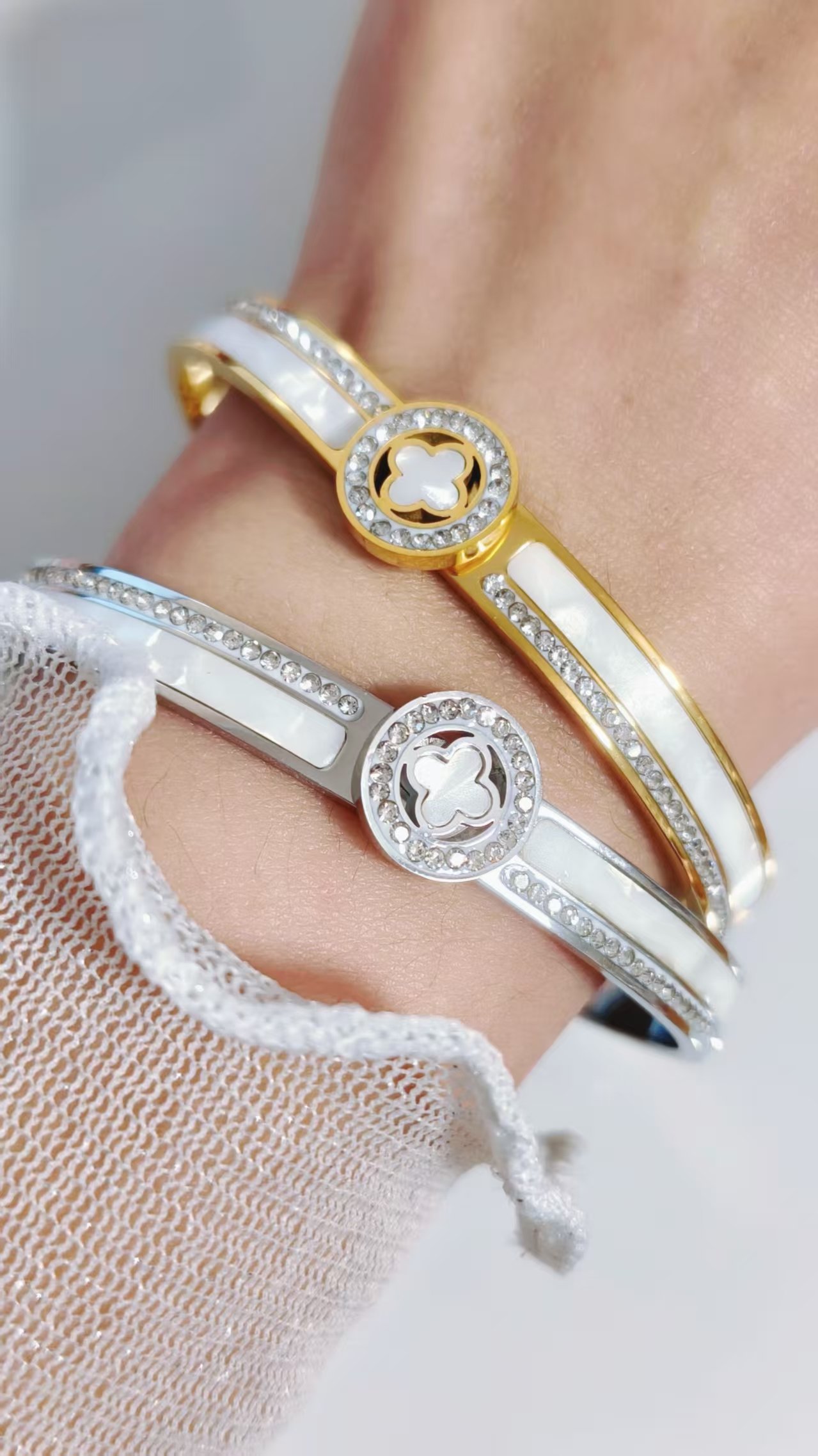 With its secure hinged clasp and comfortable fit, this bangle is effortless to wear solo for understated elegance, stacked with watches or other bracelets for trendy layering, or gifted as the ultimate symbol of love, luck, and lasting style. The clover motif combined with pearlescent shine and zircon sparkle creates an irresistible designer vibe that’s both meaningful and fashion-forward. Feel the compliments roll in and that subtle glow of wearing something truly special – HEYBIJOU brings you artisanal craftsmanship, unbreakable durability, and that coveted premium feel in one breathtaking lucky bangle. Wear your fortune every day!