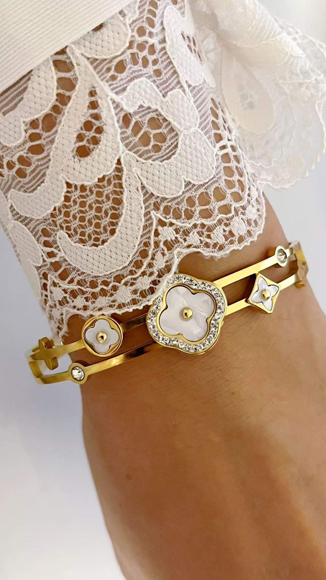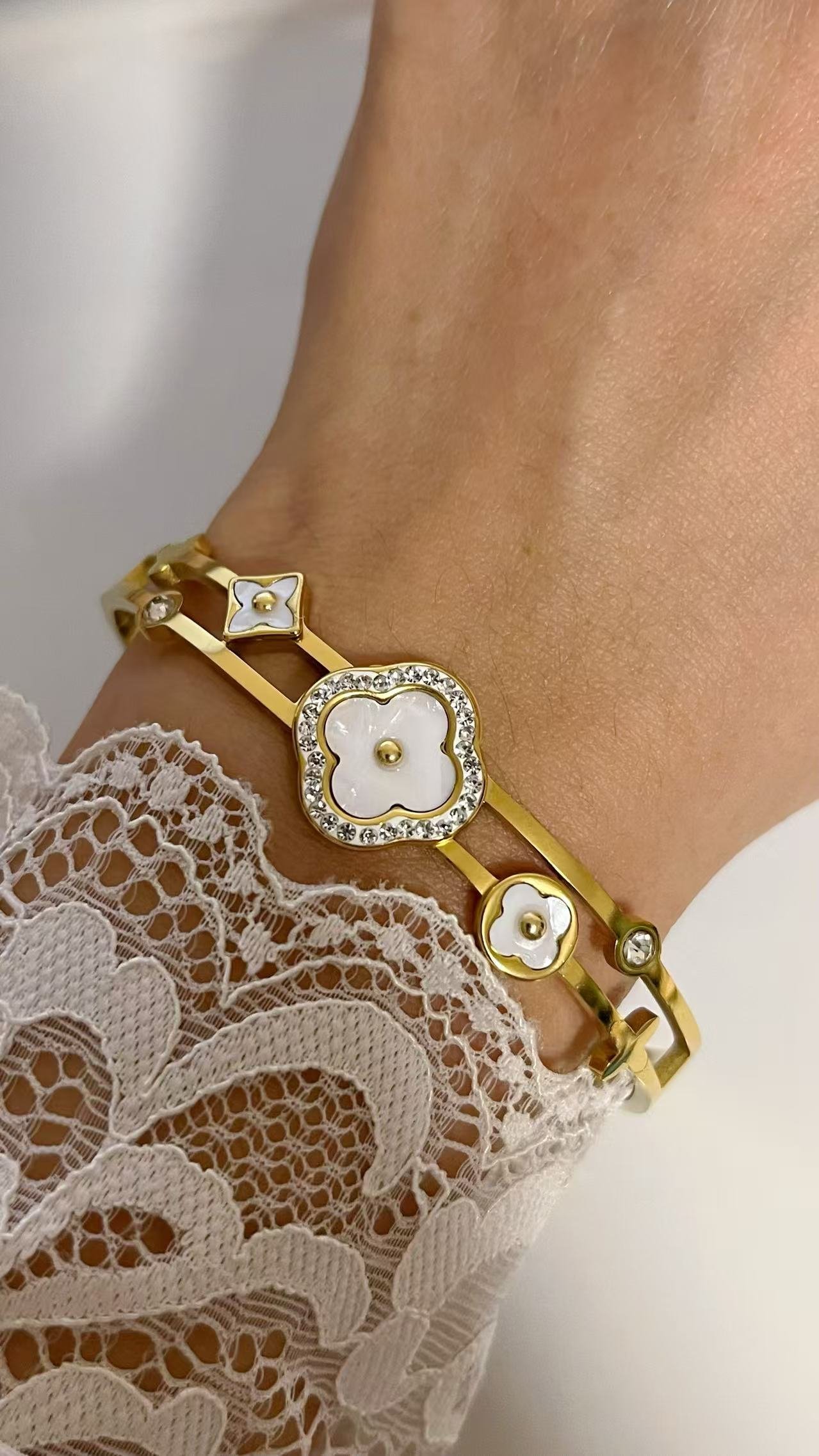 Clover vine bangle with crystal halo & pearl inlay in white, black or red. 18K gold titanium steel. Tarnish-free & water-resistant! 🌿✨