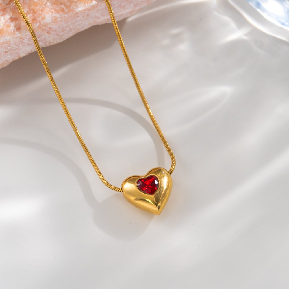 Every jewelry collection needs a heart necklace — but not just any heart necklace. The Coeur Luxe Necklace from HEYBIJOU is the one you have been waiting for. A bold, three-dimensional puffy gold heart pendant — satisfyingly substantial, mirror-polished to a warm liquid gleam — with a single heart-cut zircon set flush into its face like a secret gemstone window. Five vivid color options. One sleek flat snake chain that slides against the skin like liquid gold. A pendant so perfectly proportioned it sits right at the collarbone like it was made for that exact spot. Because it was.