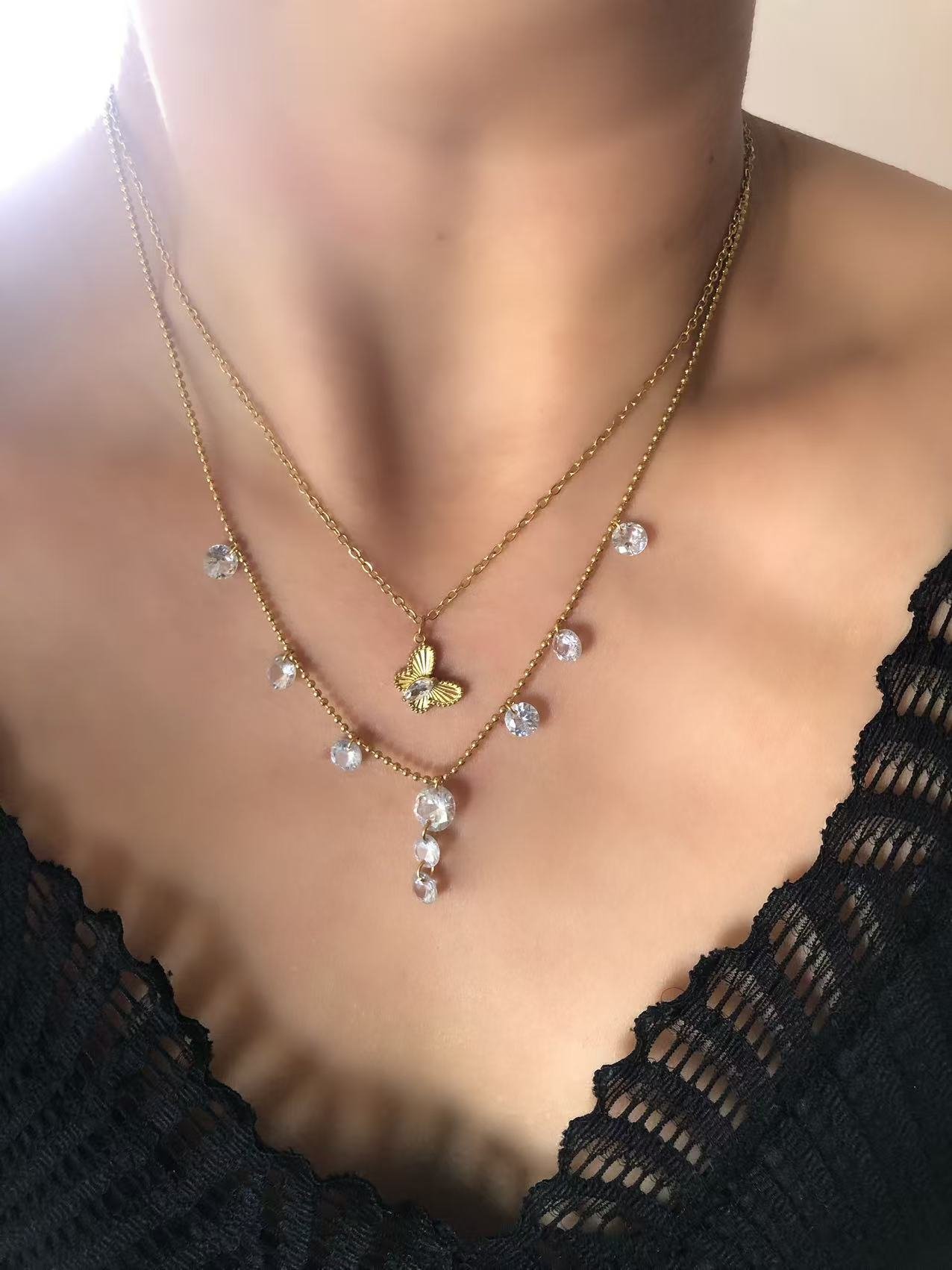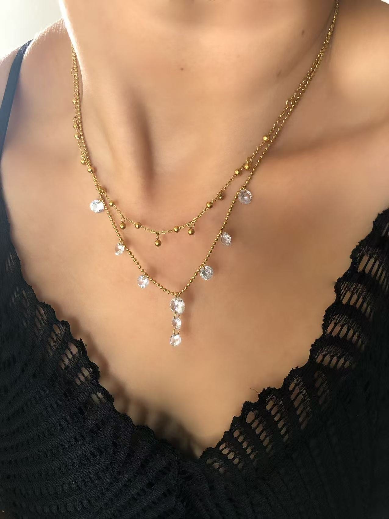 Stunning 18k gold crystal cascade necklace – tarnish free & water resistant. Multiple sparkling pendants on luxury ball chain. Shop HEYBIJOU now!