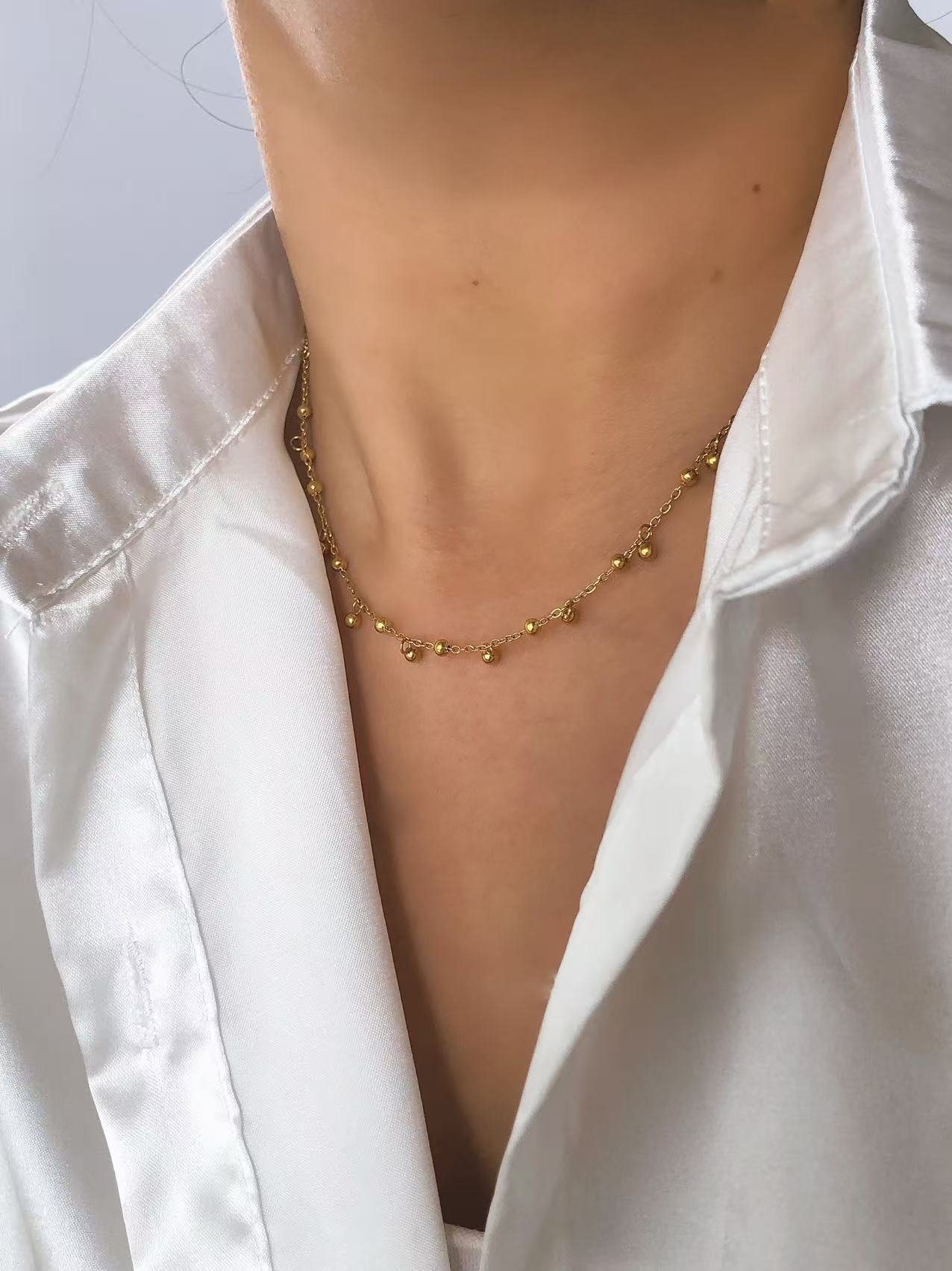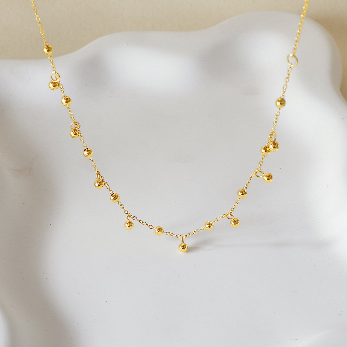 Dainty ball charm necklace in 18K gold. Minimalist droplet station design on delicate chain. Tarnish-free layering essential!
