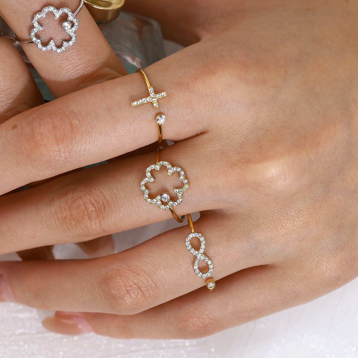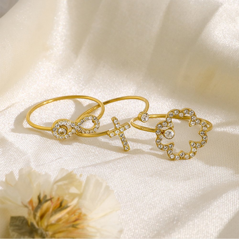 Dainty stackable ring set with zircon in 18k gold. Cross, infinity, heart & solitaire designs. Tarnish-free, mix & match. Shop HEYBIJOU!