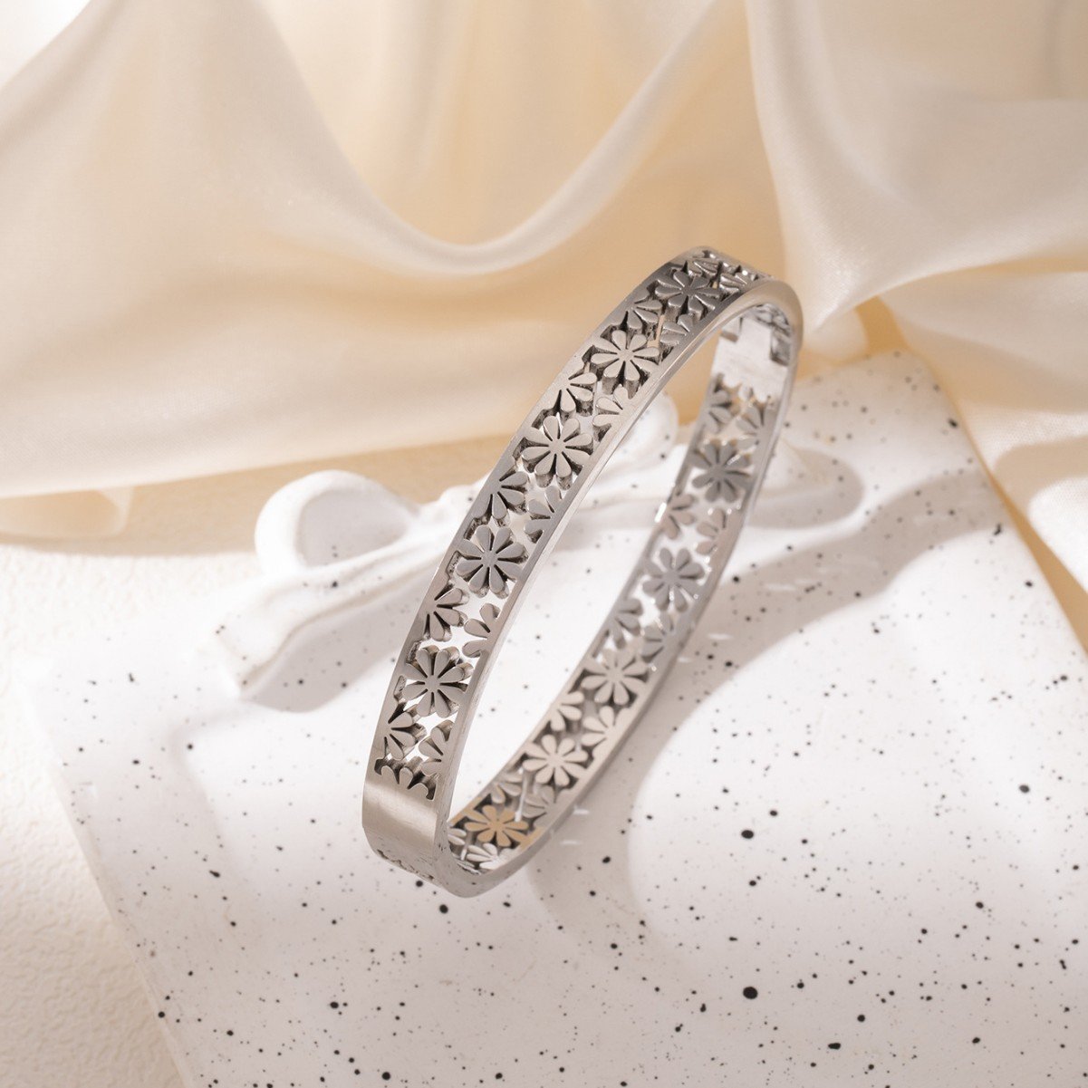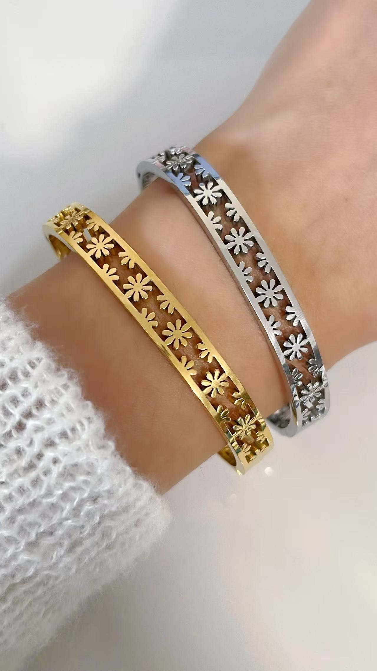 Discover the irresistible charm of HEYBIJOU’s Daisy Bloom Cuff: tarnish-free titanium steel bangles in 18K gold or silver plating. Petal-perfect, water-ready luxury for endless blooms—shop now!