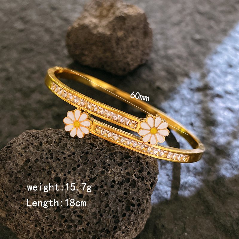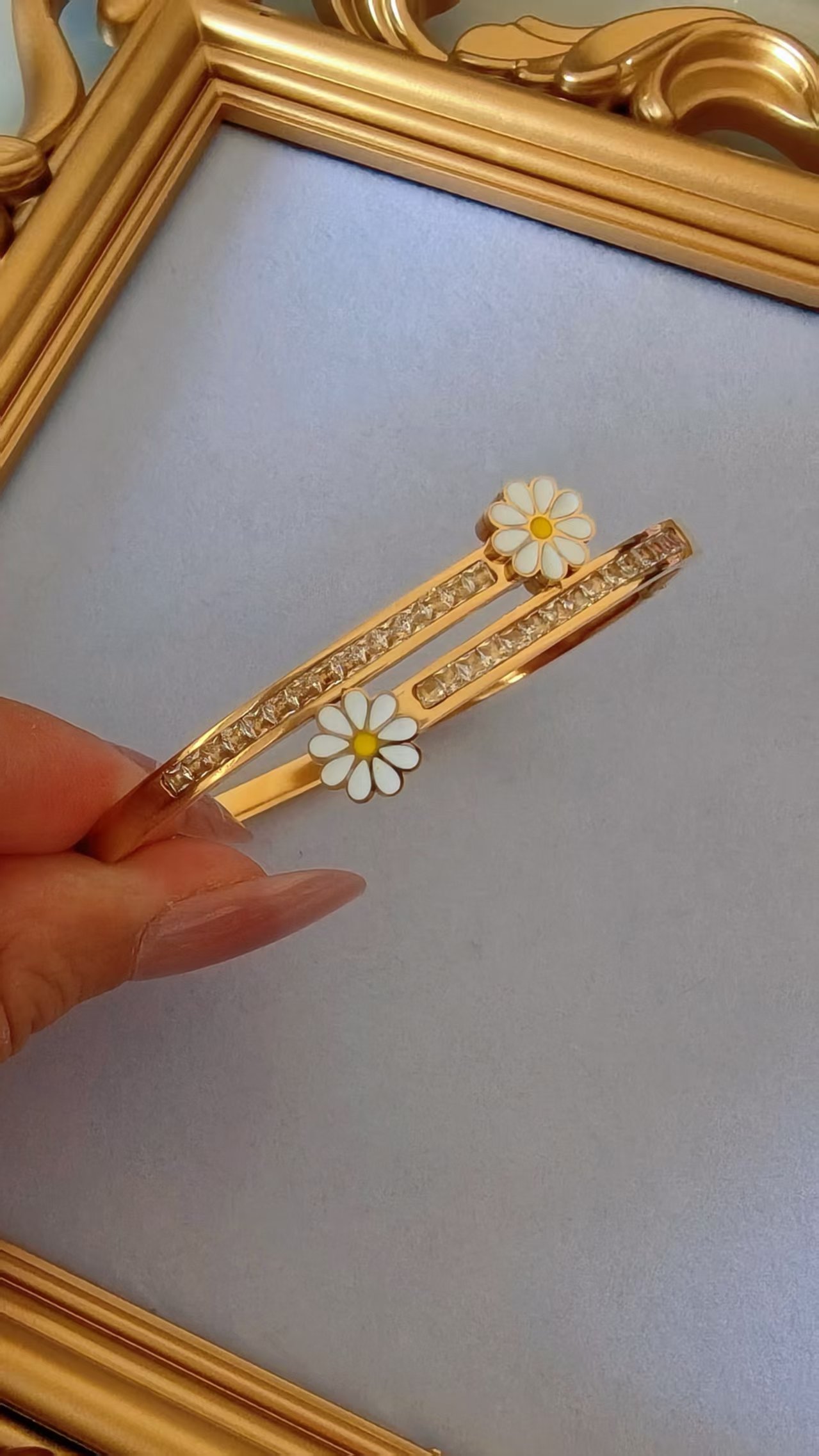 Every detail whispers high-end refinement – the warm 18K gold shine beautifully contrasts the soft white enamel daisies and brilliant zircon inlays, creating a feminine yet bold statement that’s both dainty and dazzling. The structured open bangle silhouette offers easy on-and-off wear while maintaining that coveted structured cuff look. Whether you’re channeling garden-party vibes or adding a pop of sunshine to your daily style, this bangle radiates positivity, femininity, and undeniable luxury that feels like wearing a little piece of spring forever!