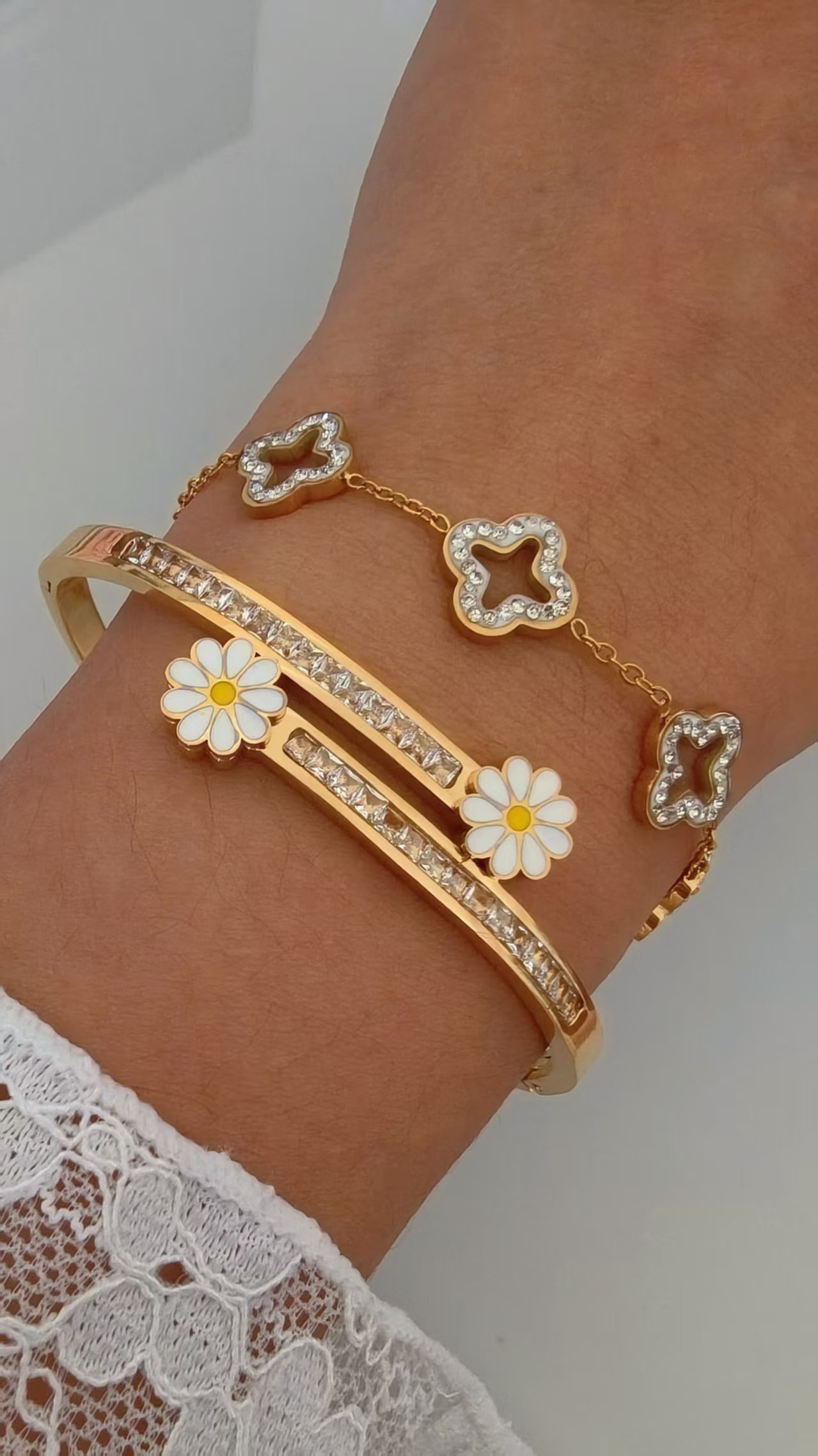 Say hello to worry-free glamour! Crafted on ultra-durable titanium steel with flawless 18K gold plating, genuine enamel daisies, and secure zircon settings, this bangle is 100% tarnish-free and fully water-resistant – splash through summer days, shower with confidence, or wear it to the beach without a single dull moment. Hypoallergenic, built to endure, and designed to keep its fresh floral sparkle for years – this isn’t just a bracelet, it’s your blooming forever companion that stays as vibrant and joyful as the day you slipped it on!
