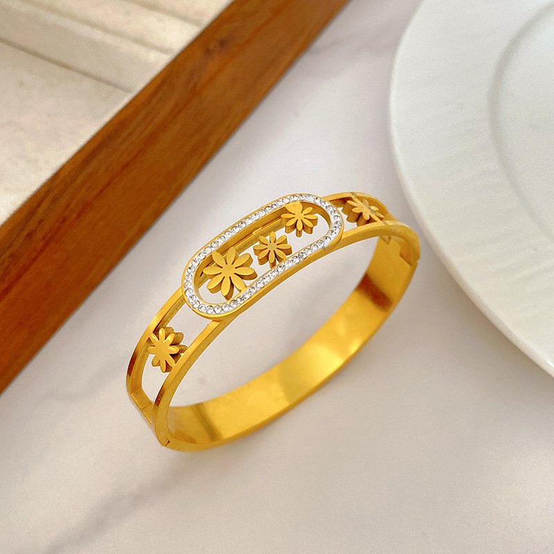 Daisy cutout crystal bangle with openwork design. 18K gold titanium steel, tarnish-free & water-resistant. Garden-inspired luxury! 🌼✨