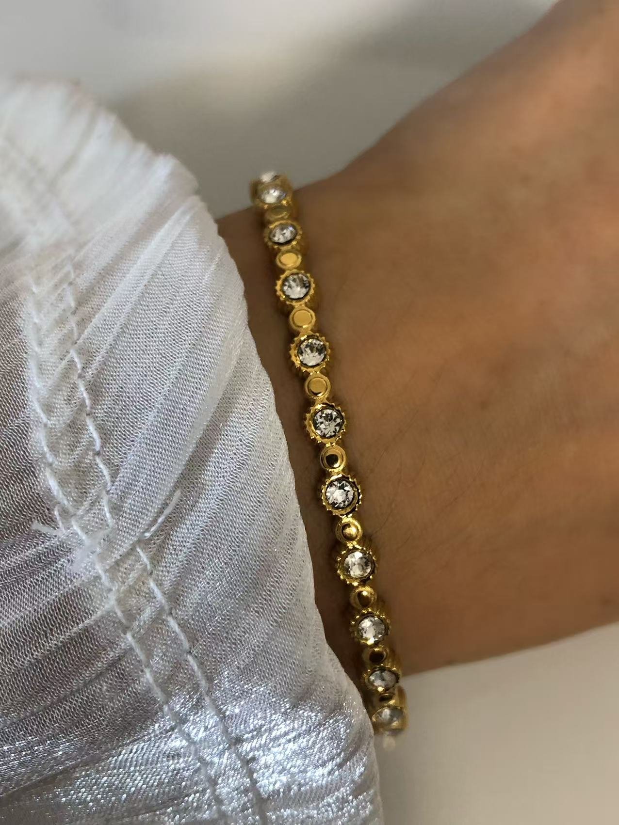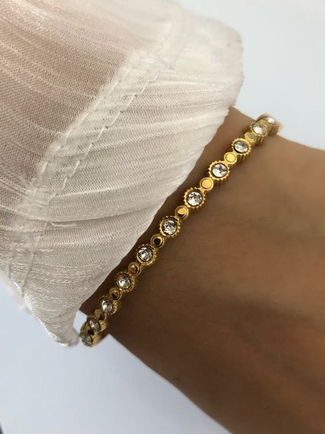 Delicate CZ tennis bangle in 18K gold. Ultra-slim design with continuous crystal line. Perfect stacking bracelet. Tarnish-free!