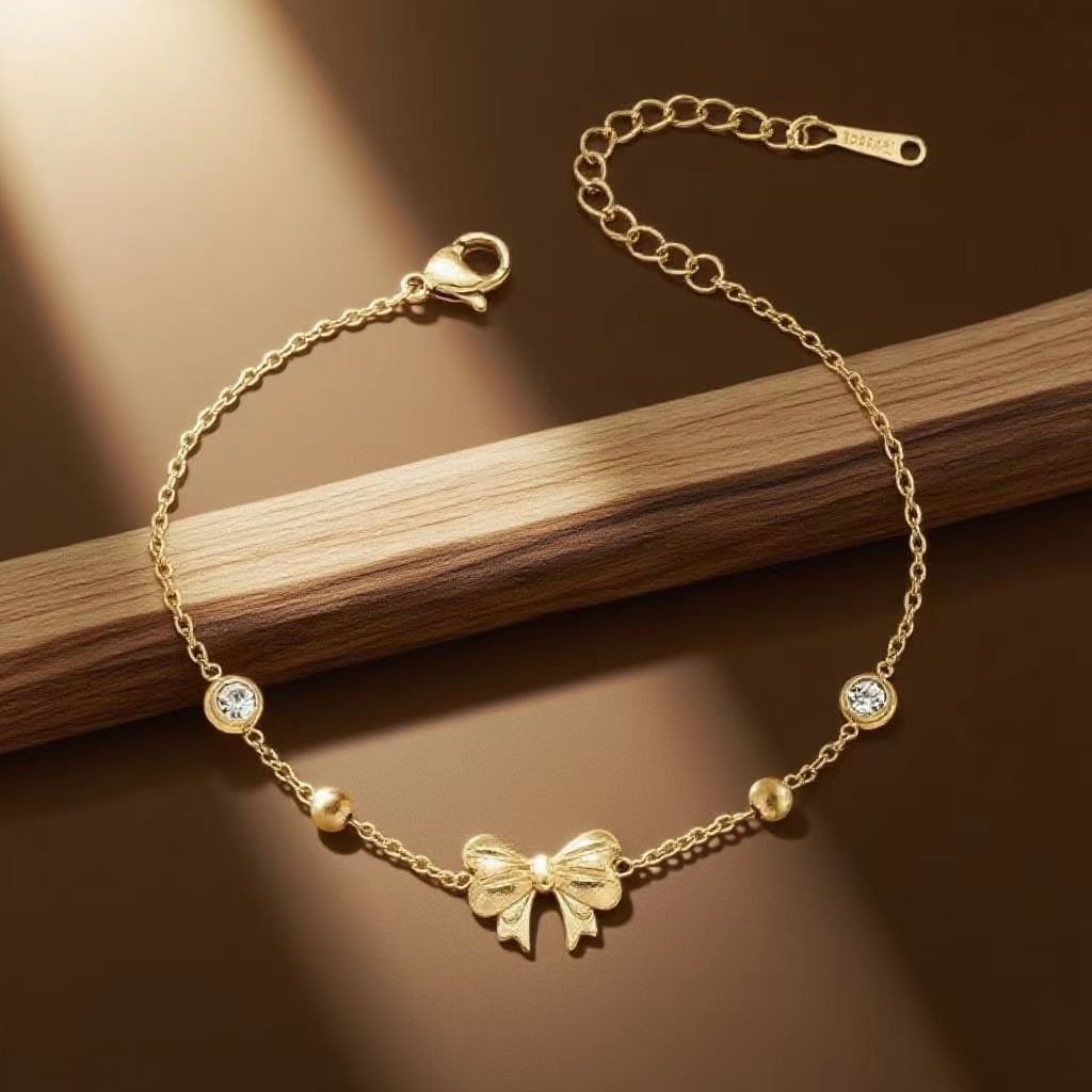HEYBIJOU delicate gold bow bracelet—zircon accents on 18K gold-plated titanium steel chain. Tarnish-free, water-resistant feminine luxury with sweet ribbon charm!