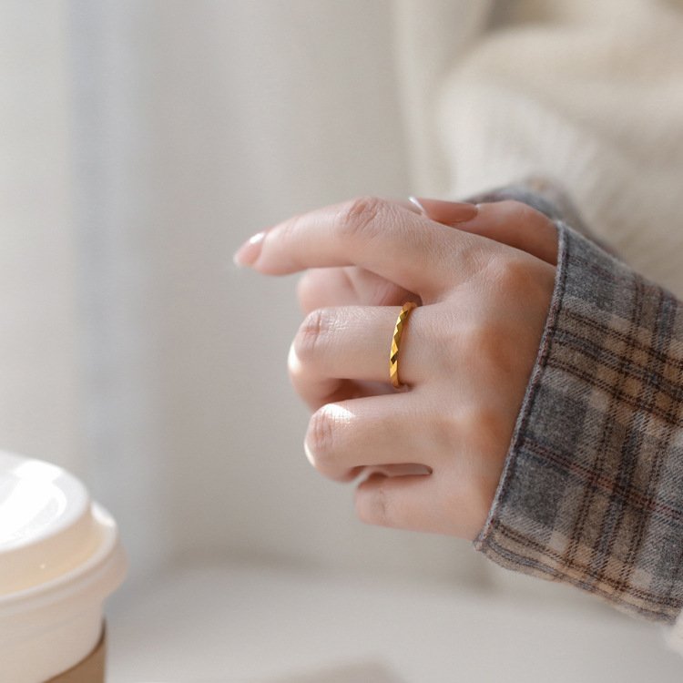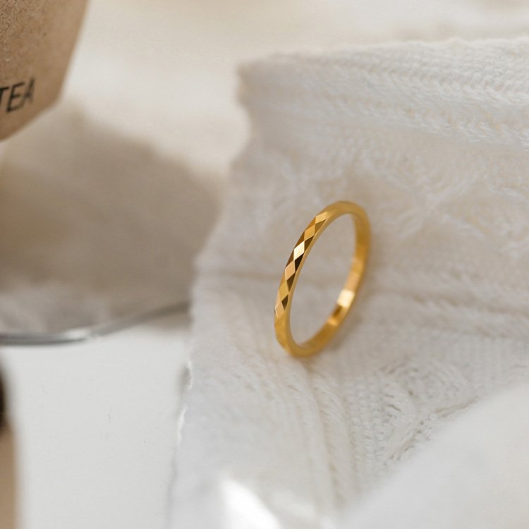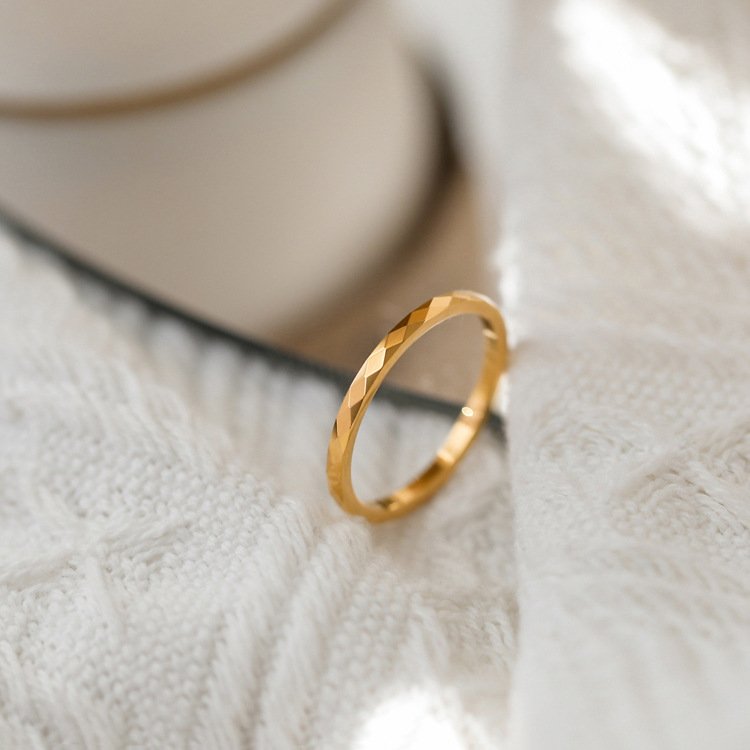 Run your fingertip along the band and feel the satisfying micro-texture of dozens of tiny angled cuts — each one a precisely formed rhombus facet that reflects light from a slightly different angle to its neighbour. Together they create a ring that shifts constantly in the light — sometimes a warm, solid gold band, sometimes an explosion of tiny light flashes, sometimes a deep, multi-dimensional shimmer that makes the ring look like it contains something alive. It’s endlessly fascinating, and it costs far less than the effect it creates.