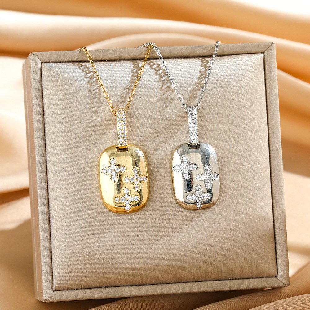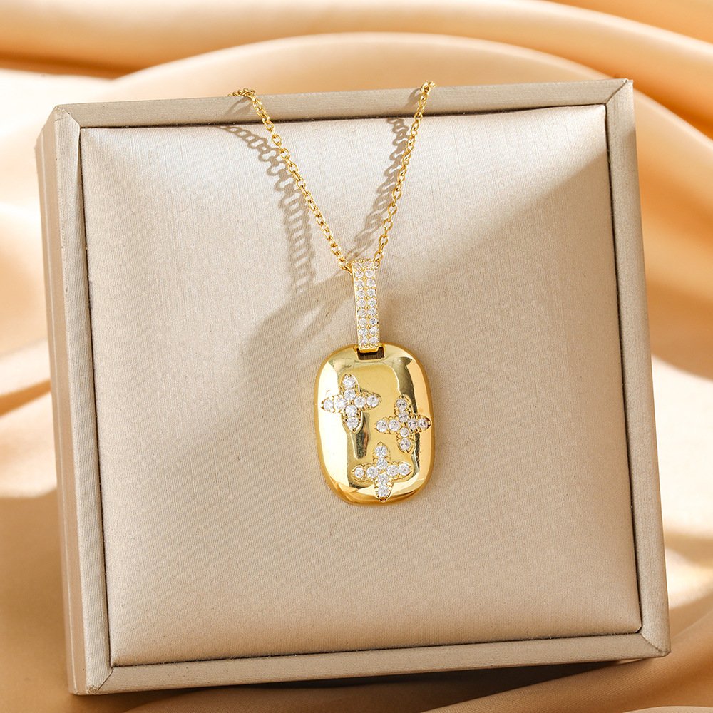 - Two pavé zircon four-pointed clover motifs are scattered asymmetrically across the face of the pendant — each one densely set with brilliant round zircons that sparkle against the polished dome background in the most visually compelling way