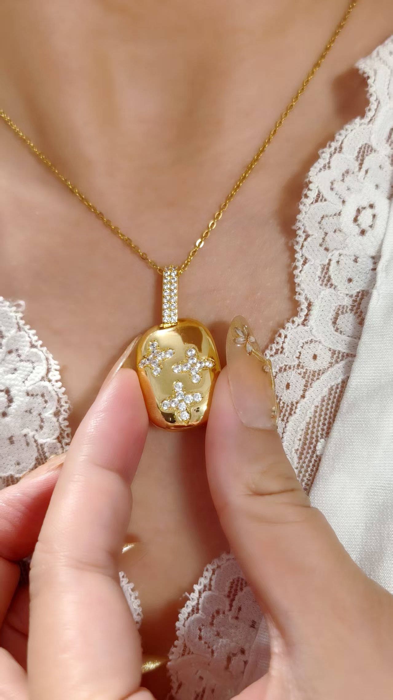 There is a new kind of statement pendant in town — and it is gloriously, unapologetically substantial. The Dôme Clover Necklace from HEYBIJOU takes the trending puffy dome pendant silhouette and makes it unmistakably its own — a high-polish, pillow-shaped tablet pendant scattered with two pavé zircon clover motifs that bloom across its mirror-smooth surface like constellations against a golden sky. It is bold without being loud. Luxurious without being heavy. The kind of piece that makes your entire outfit feel like it was planned around it.