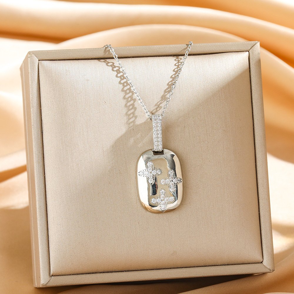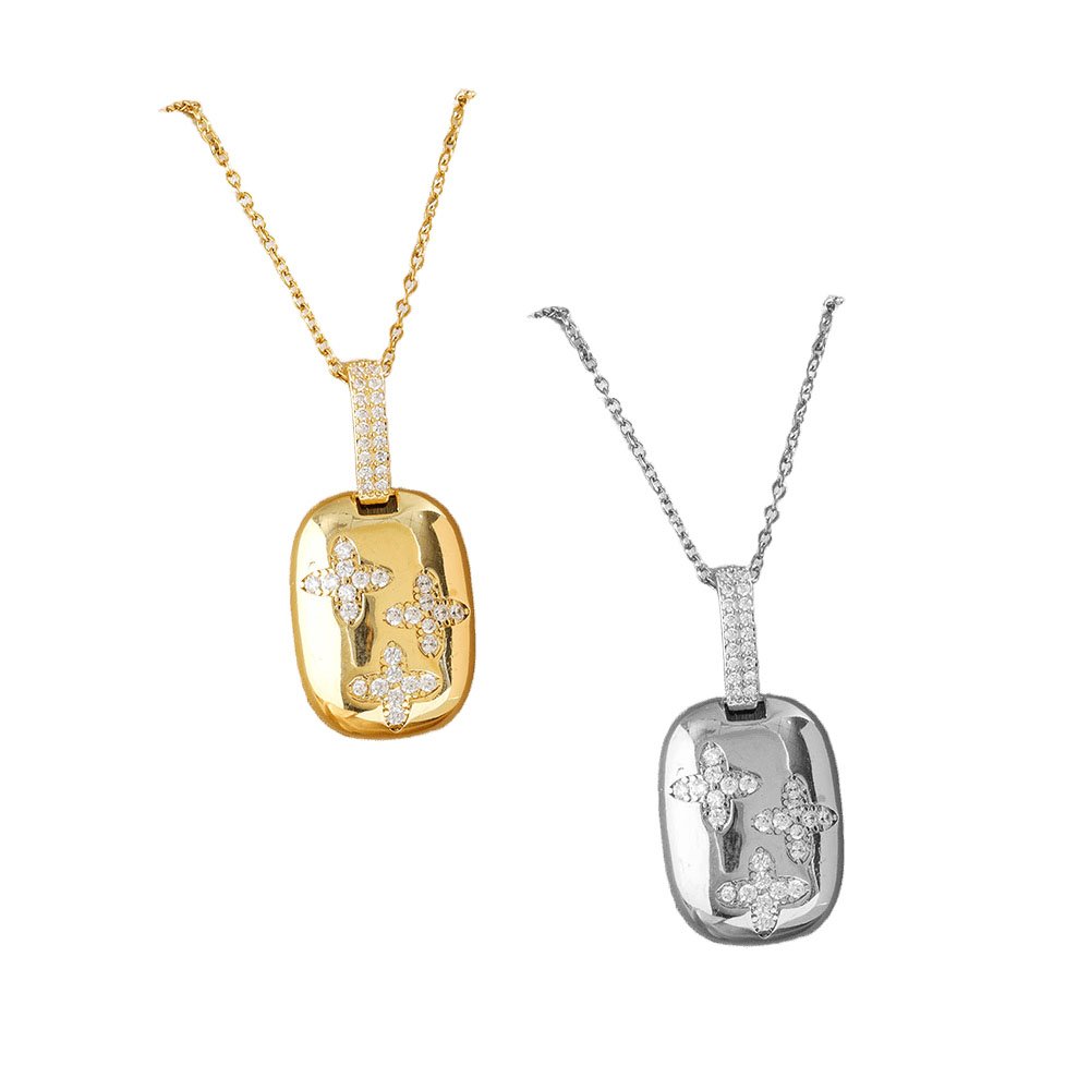 - Silver / Rhodium — the cool silver dome reads almost like white gold or polished platinum — sleek, architectural, and seriously chic. The zircon clovers appear even brighter against the silver surface, giving the whole pendant an icily brilliant, high-fashion intensity that is completely irresistible