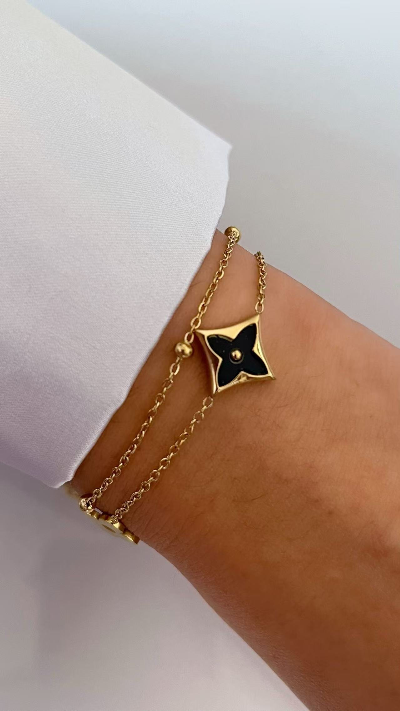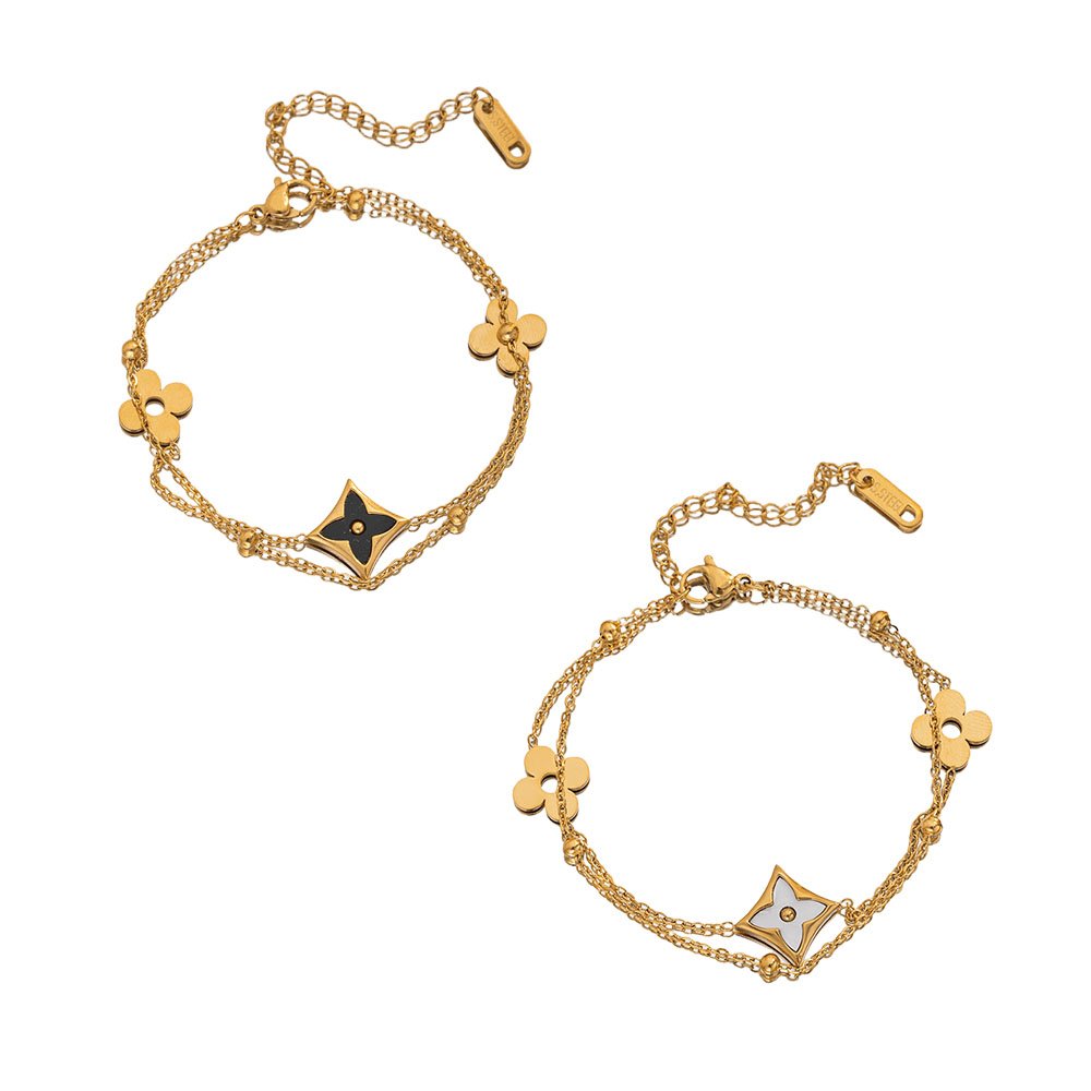 HEYBIJOU Double Chain Star Clover Bracelet – 18K gold plated with black/white mother-of-pearl. Tarnish-free, waterproof layered luxe!