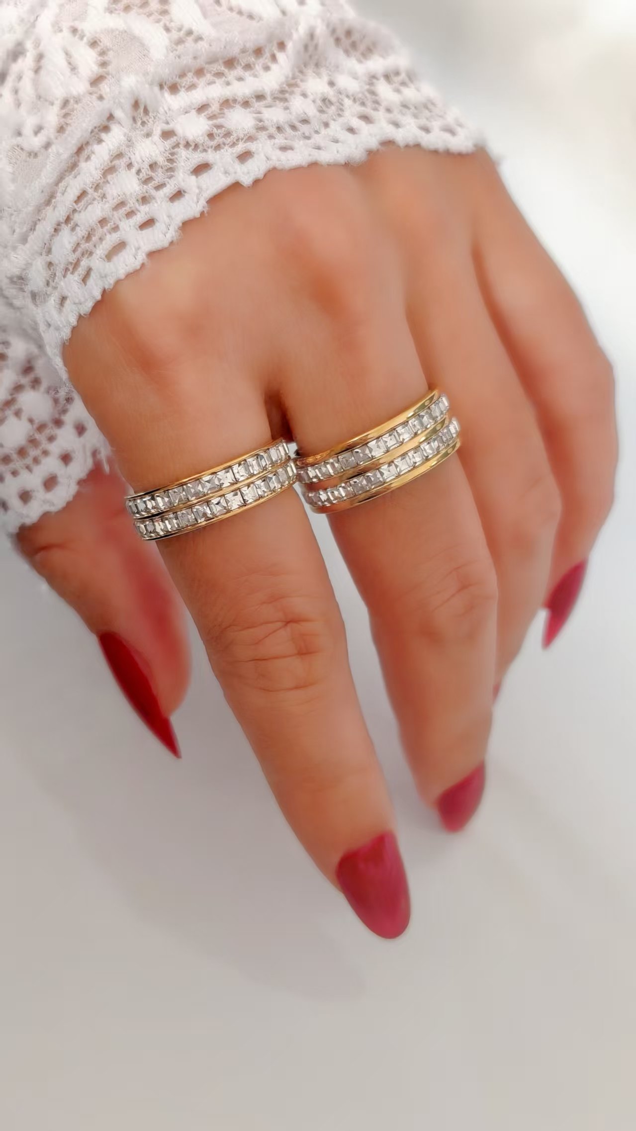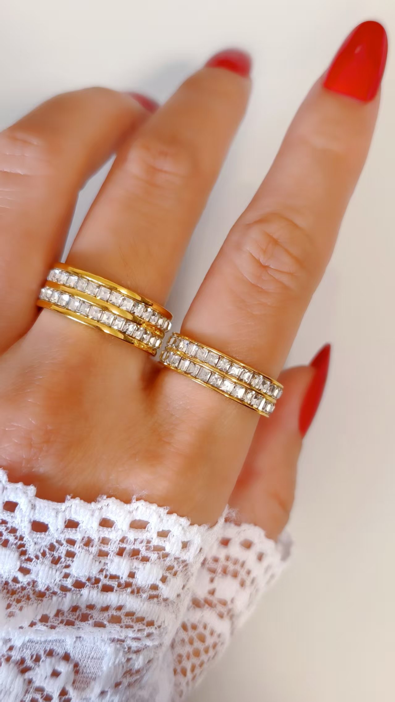 No tarnish, no dulling – this ring is completely tarnish-free and water-resistant, designed to keep its double zircon rows sparkling and plating pristine through hand-washing, beach days, workouts, showers, or everyday adventures. The resilient titanium core and protective plating preserve every square facet and metallic sheen, ensuring your full-pave treasure stays radiant, comfortable, and flawless no matter the day. True luxury jewelry made for the woman who shines relentlessly!