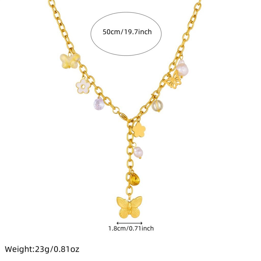 Flutter into enchantment with HEYBIJOU’s Dreamy Butterfly Garden Y-Necklace—18k gold-plated titanium steel with floral & butterfly charms. Tarnish-free magic!