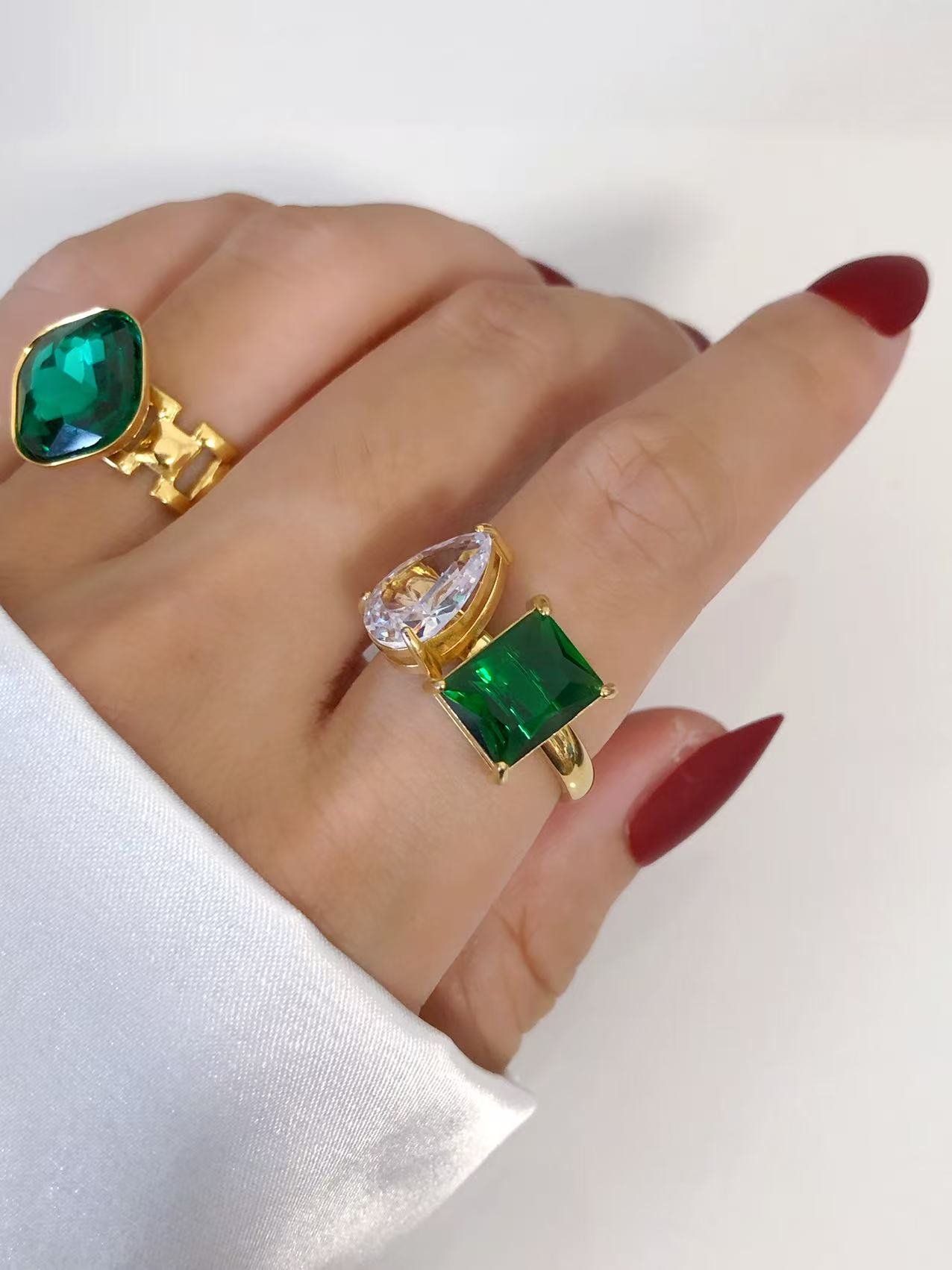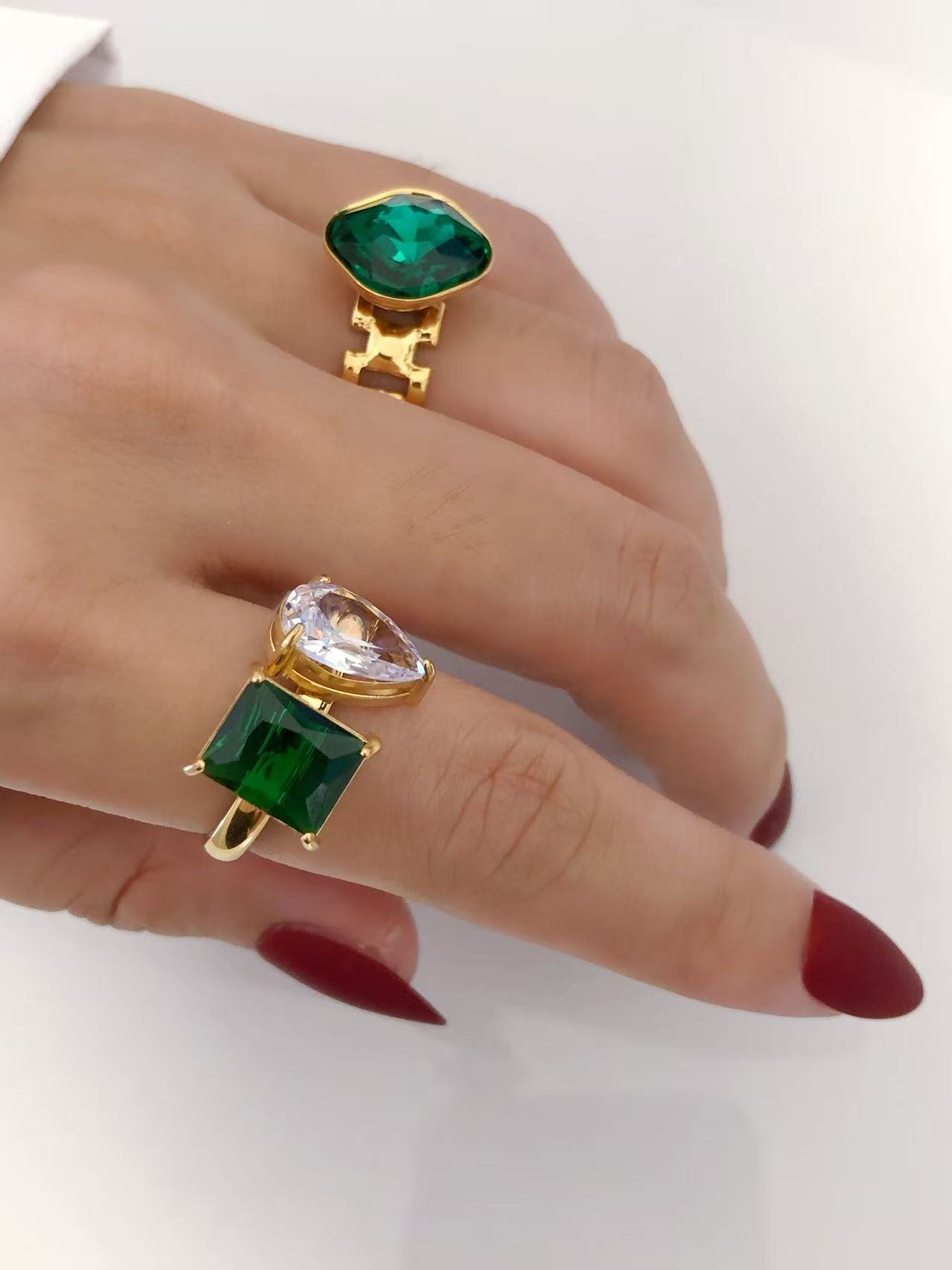 Dual stone bypass ring in 18K gold. Emerald green & clear CZ with mixed cuts. Bold statement ring sizes 6-9. Tarnish-free!