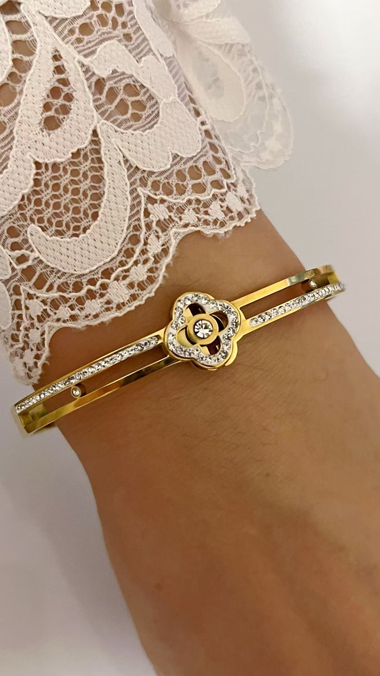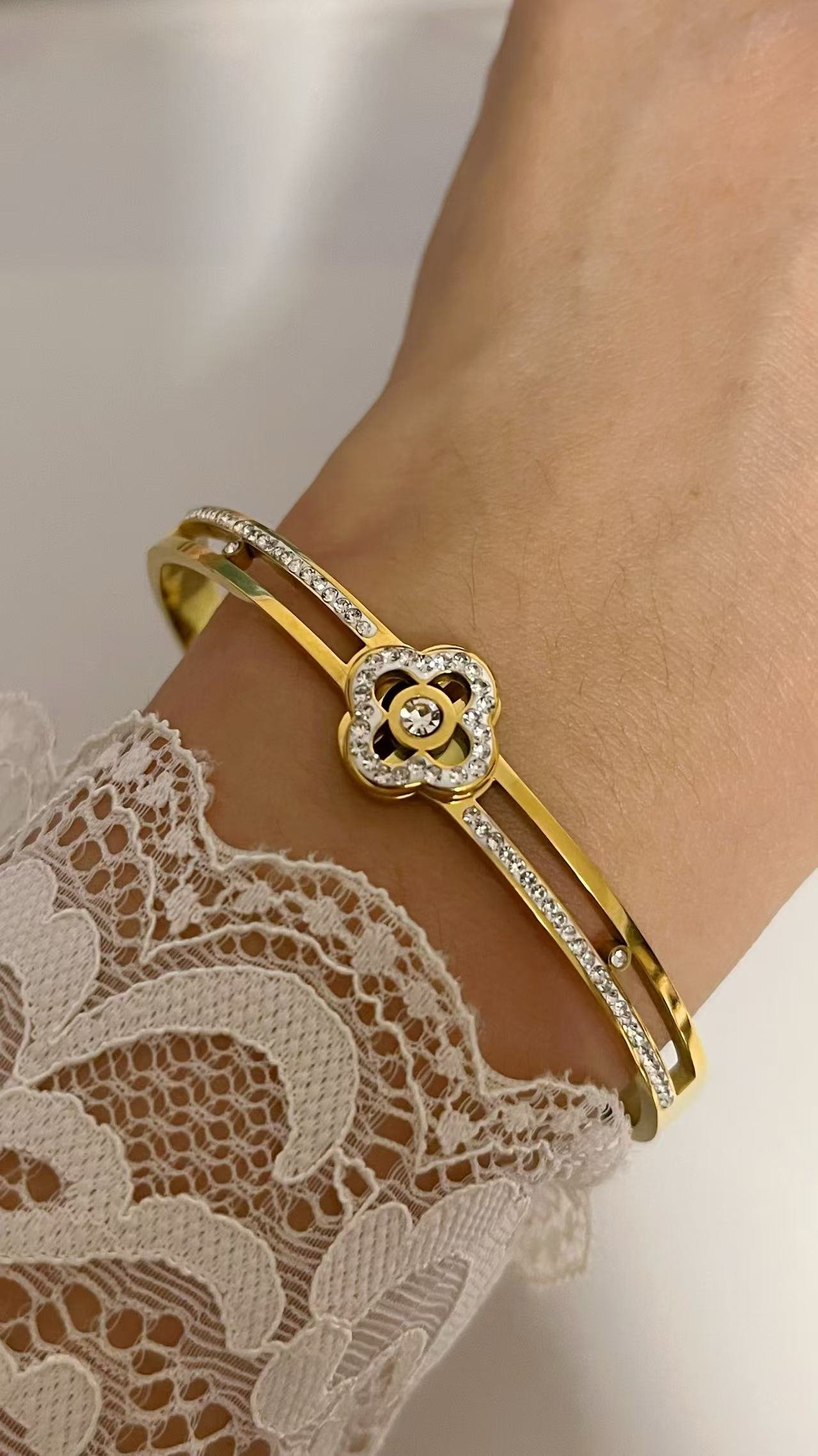 Lucky clover blooms with zircons on HEYBIJOU’s sleek open gold bangle – tarnish-free, water-resistant everyday magic!