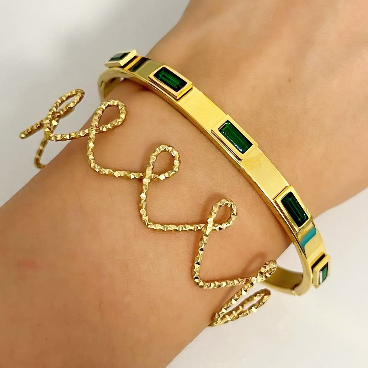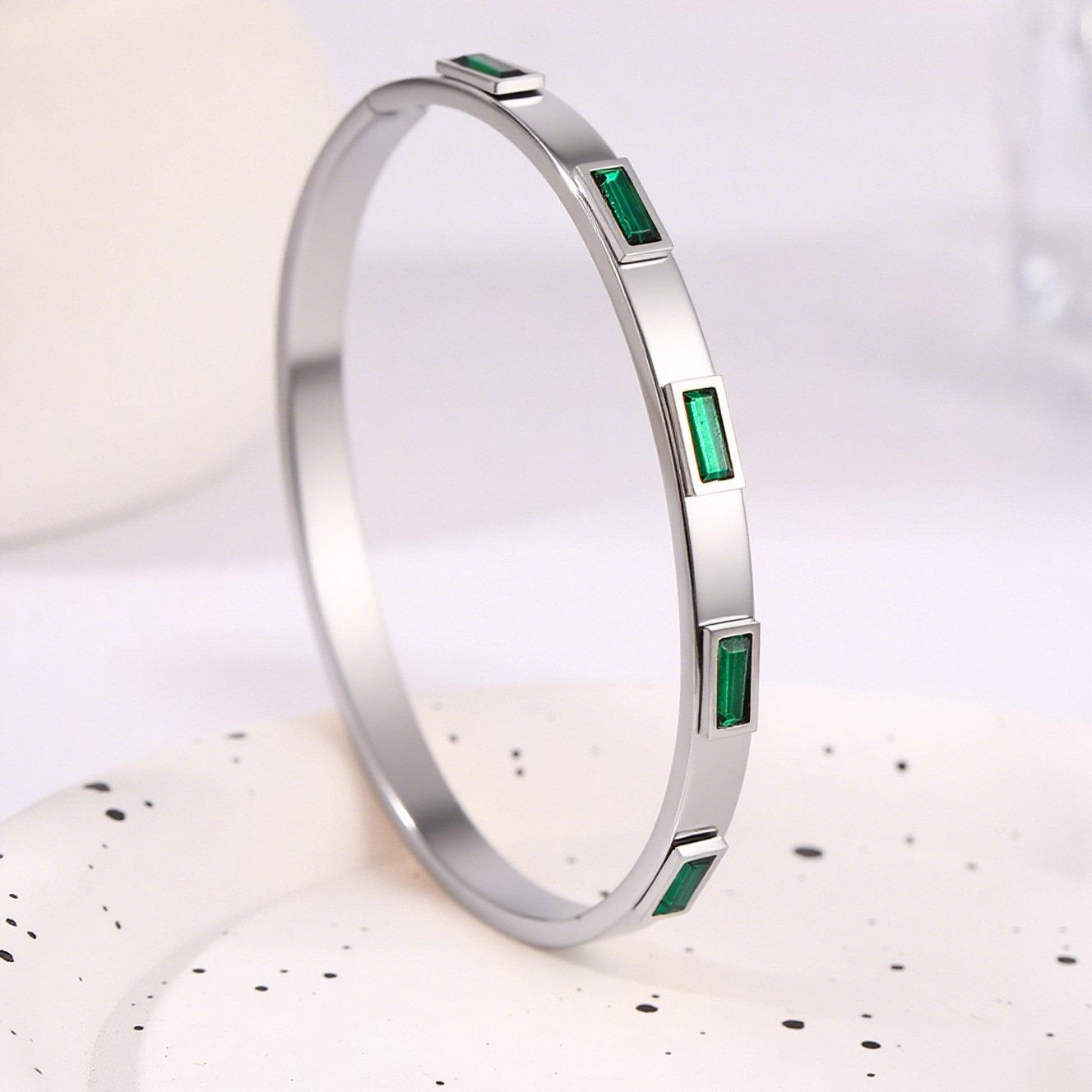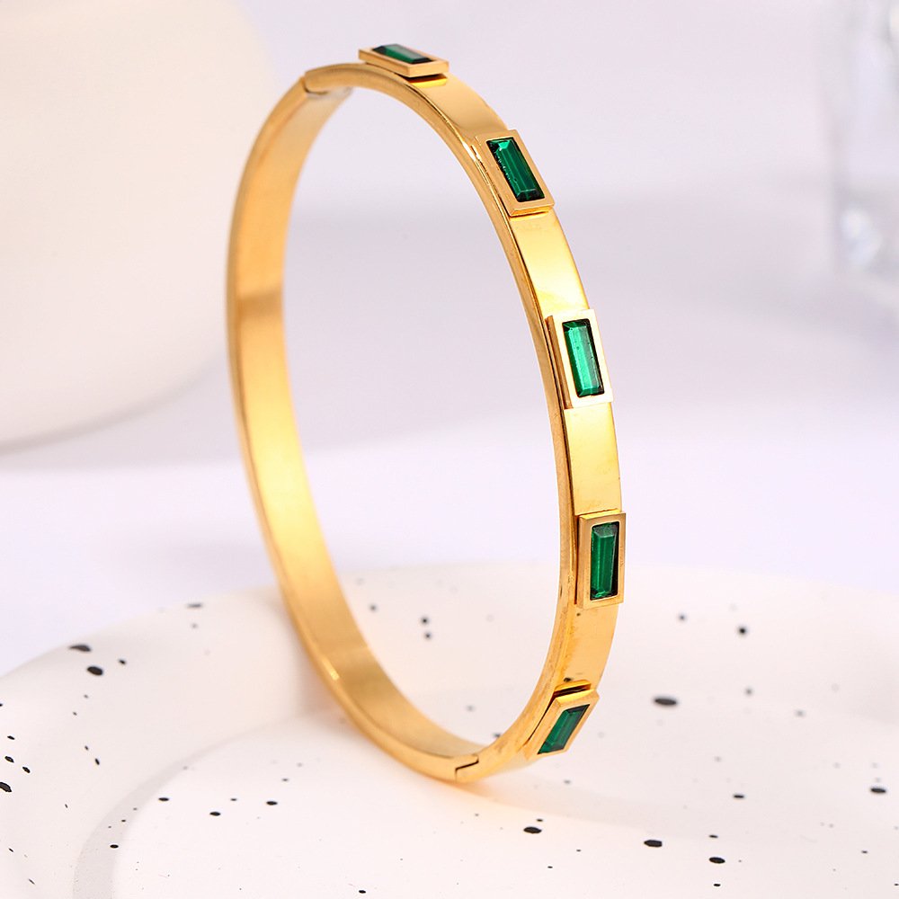 Luxurious emerald stone bangle in 18k gold or silver plated titanium. Sleek modern design with vibrant green accents. Premium dual-tone jewelry.