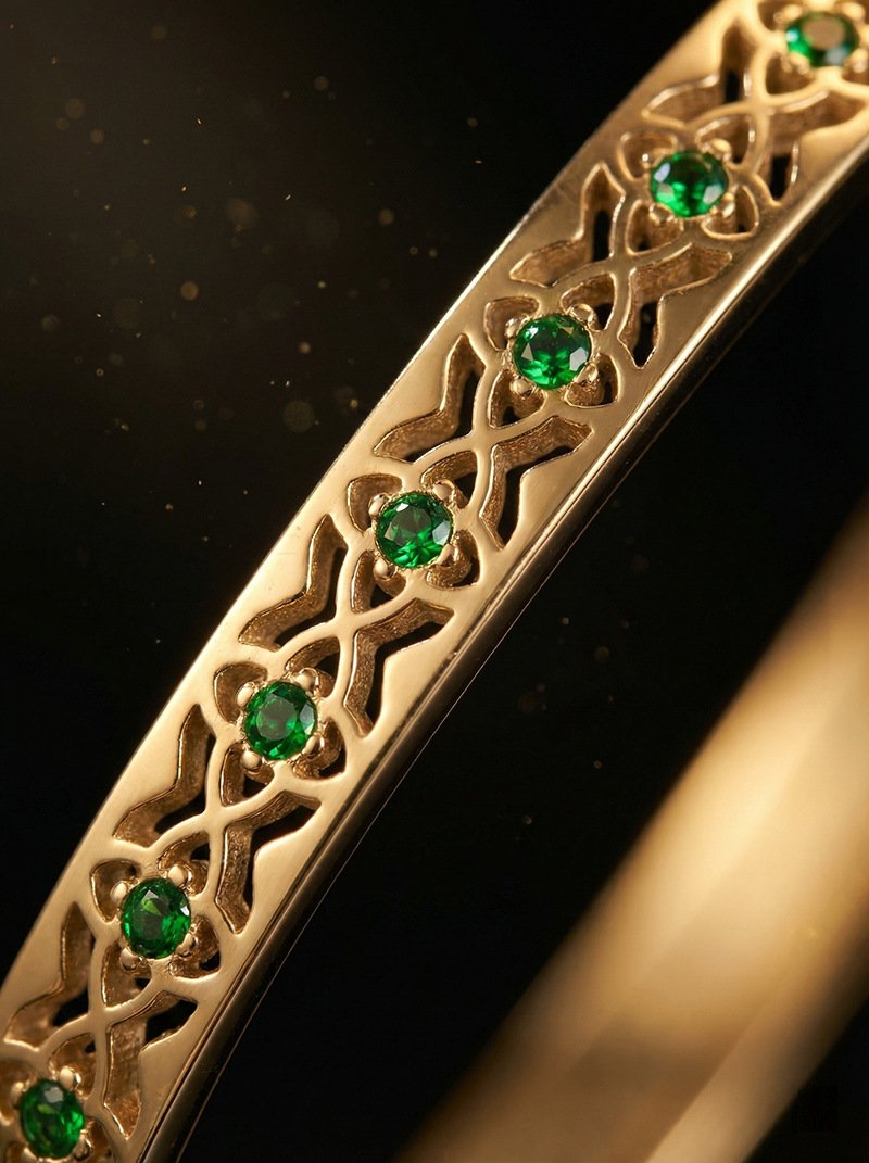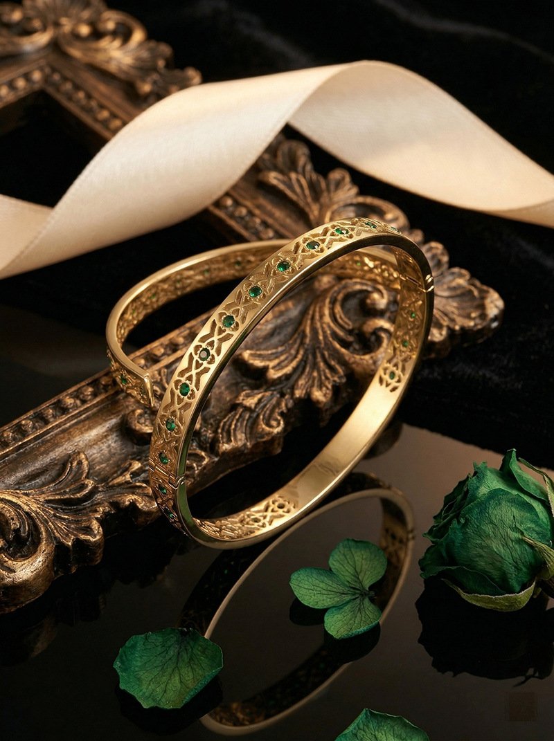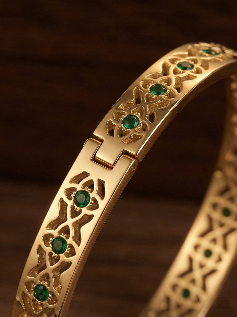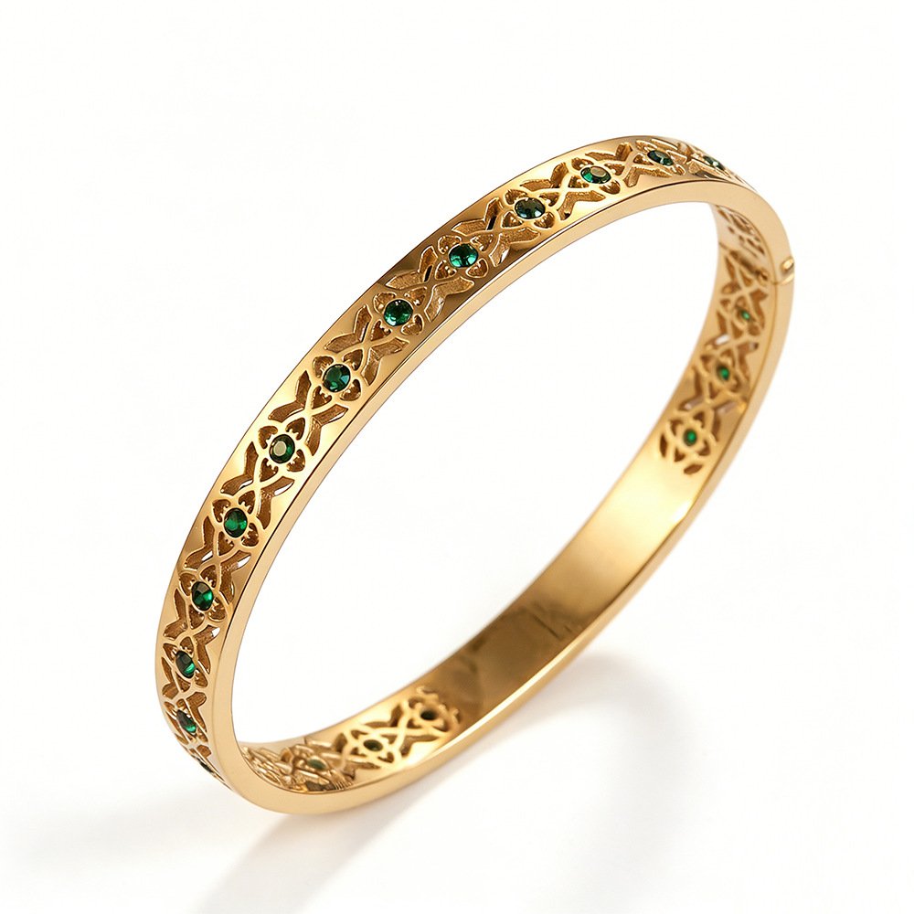 💚 Filigree Craftsmanship That Stops Time The cutwork on this bangle is genuinely remarkable. The entire band is carved with a repeating open-lace pattern of four-leaf clover florals connected by delicate interlacing X-shaped lattice links — a design that echoes the intricate hand-engraved metalwork of antique jewelry houses and cathedral ironwork alike. The negative space between each motif creates a beautiful lace-like transparency that makes the bangle appear impossibly intricate and artisanal, as though each piece was individually hand-crafted by a master goldsmith. At the center of every clover bloom, a single round emerald zircon is set flush and deep — their rich, jewel-toned green creating a color story that is lush, regal, and completely captivating against both the warm gold and cool silver finishes.